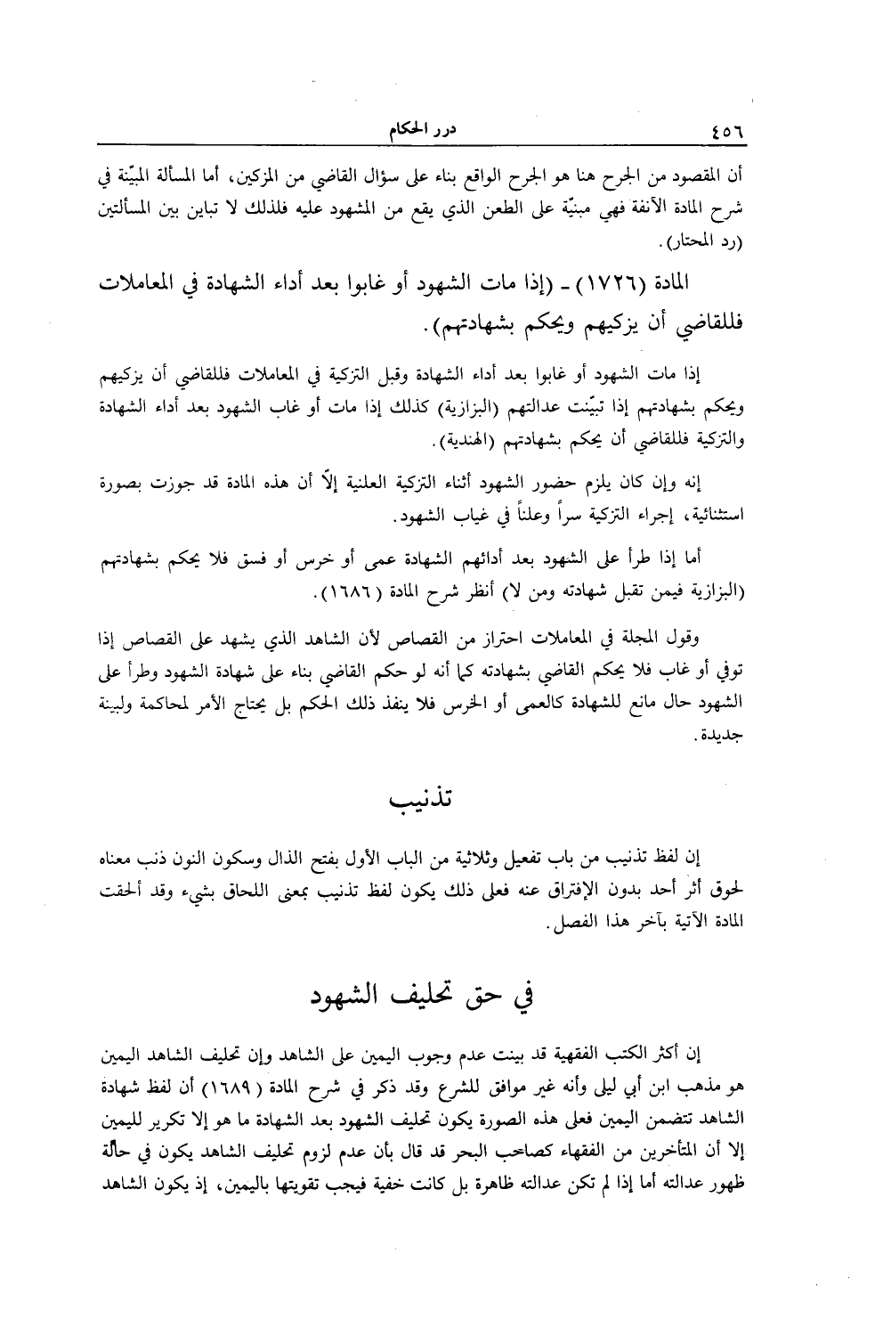 وَقَوْلُ الْمَجَلَّةِ فِي الْمُعَامَلَاتِ احْتِرَازٌ مِنْ الْقِصَاصِ؛ لِأَنَّ الشَّاهِدَ الَّذِي يَشْهَدُ عَلَى الْقِصَاصِ إذَا تُوُفِّيَ أَوْ غَابَ فَلَا يَحْكُمُ الْقَاضِي بِشَهَادَتِهِ كَمَا أَنَّهُ لَوْ حَكَمَ الْقَاضِي بِنَاءً عَلَى شَهَادَةِ الشُّهُودِ وَطَرَأَ عَلَى الشُّهُودِ حَالٌ مَانِعٌ لِلشَّهَادَةِ كَالْعَمَى أَوْ الْخَرَسِ فَلَا يَنْفُذُ ذَلِكَ الْحُكْمُ بَلْ يَحْتَاجُ الْأَمْرُ لِمُحَاكَمَةٍ وَلِبَيِّنَةٍ جَدِيدَةٍ. تَذْنِيبٌ إنَّ لَفْظَ تَذْنِيبٍ مِنْ بَابِ تَفْعِيلٍ، وَثُلَاثِيَّةٌ مِنْ الْبَابِ الْأَوَّلِ بِفَتْحِ الذَّالِ وَسُكُونِ النُّونِ ذَنْبٌ مَعْنَاهُ لُحُوقُ أَثَرِ أَحَدٍ بِدُونِ الِافْتِرَاقِ عَنْهُ فَعَلَى ذَلِكَ يَكُونُ لَفْظُ تَذْنِيبٍ بِمَعْنَى اللِّحَاقِ بِشَيْءٍ وَقَدْ أَلْحَقْتُ الْمَادَّةَ الْآتِيَةَ بِآخِرِ هَذَا الْفَصْلِ.