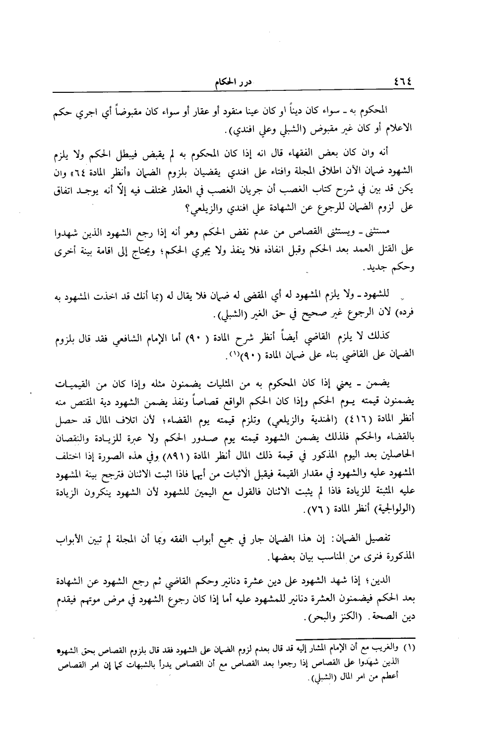أَنَّهُ وَإِنْ كَانَ بَعْضُ الْفُقَهَاءِ قَالَ: إنَّهُ إذَا كَانَ الْمَحْكُومُ بِهِ لَمْ يُقْبَضْ فَيَبْطُلُ الْحُكْمُ وَلَا يَلْزَمُ الشُّهُودَ ضَمَانٌ، الْآنَ إطْلَاقُ الْمَجَلَّةِ وَإِفْتَاءُ عَلِيِّ أَفَنْدِي يَقْضِيَانِ بِلُزُومِ الضَّمَانِ (اُنْظُرْ الْمَادَّةَ 64) وَإِنْ يَكُنْ قَدْ بُيِّنَ فِي شَرْحِ كِتَابِ الْغَصْبِ أَنَّ جَرَيَانَ الْغَصْبِ فِي الْعَقَارِ مُخْتَلَفٌ فِيهِ إلَّا أَنَّهُ يُوجَدُ اتِّفَاقٌ عَلَى لُزُومِ الضَّمَانِ لِلرُّجُوعِ عَنْ الشَّهَادَةِ عَلِيٌّ أَفَنْدِي وَالزَّيْلَعِيّ.
