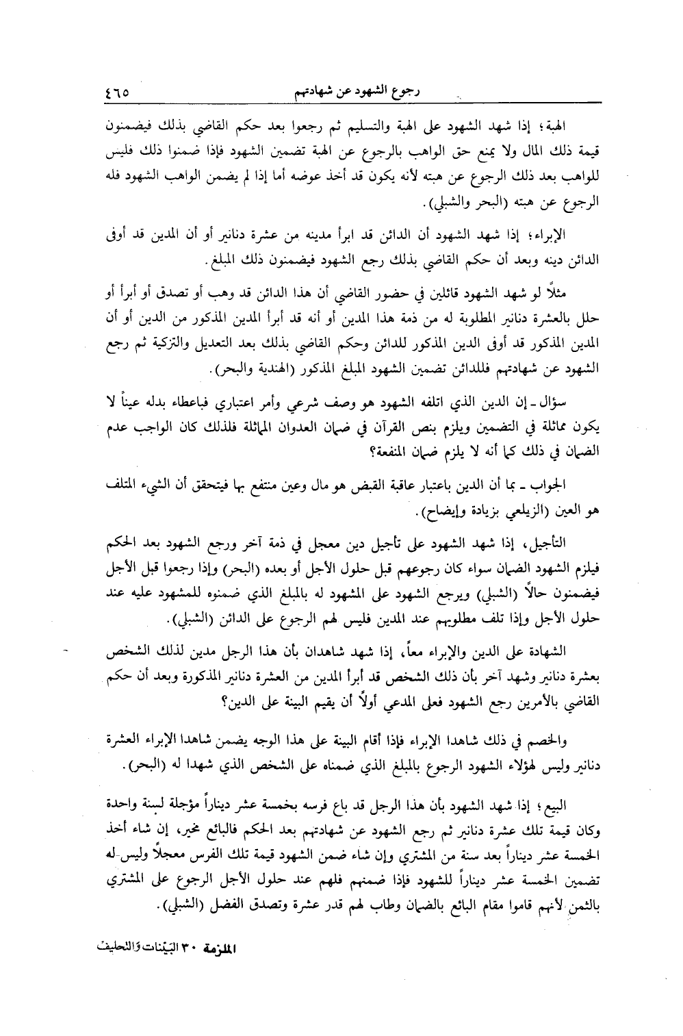 الشَّهَادَةُ عَلَى الدَّيْنِ وَالْإِبْرَاءِ مَعًا، إذَا شَهِدَ شَاهِدَانِ بِأَنَّ هَذَا الرَّجُلَ مَدِينٌ لِذَلِكَ الشَّخْصِ بِعَشَرَةِ دَنَانِيرَ وَشَهِدَ آخَرُ بِأَنَّ ذَلِكَ الشَّخْصَ قَدْ أَبْرَأَ الْمَدِينَ مِنْ الْعَشَرَةِ دَنَانِيرَ الْمَذْكُورَةِ وَبَعْدَ أَنْ حَكَمَ الْقَاضِي بِالْأَمْرَيْنِ رَجَعَ الشُّهُودُ فَعَلَى الْمُدَّعِي أَوَّلًا أَنْ يُقِيمَ الْبَيِّنَةَ عَلَى الدَّيْنِ، وَالْخَصْمُ فِي ذَلِكَ شَاهِدَا الْإِبْرَاءِ، فَإِذَا أَقَامَ الْبَيِّنَةَ عَلَى هَذَا الْوَجْهِ يَضْمَنُ شَاهِدَا الْإِبْرَاءِ الْعَشَرَةَ دَنَانِيرَ وَلَيْسَ لِهَؤُلَاءِ الشُّهُودِ الرُّجُوعُ بِالْمَبْلَغِ الَّذِي ضَمِنَاهُ عَلَى الشَّخْصِ الَّذِي شَهِدَا لَهُ (الْبَحْرُ) .