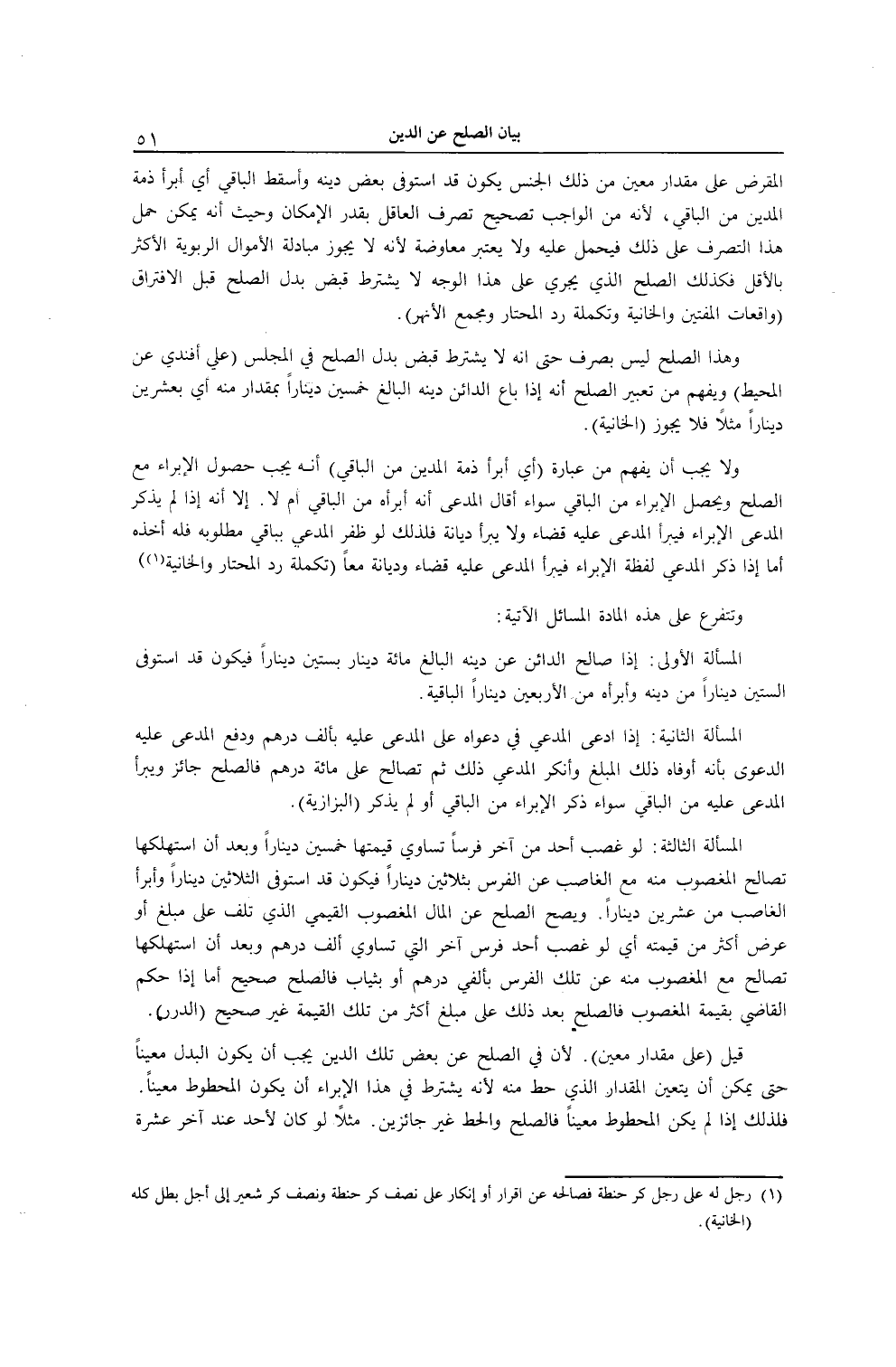 ، وَلَا يَجِبُ أَنْ يُفْهَمَ مِنْ عِبَارَةِ (أَيْ أَبْرَأَ ذِمَّةَ الْمَدِينِ مِنْ الْبَاقِي) أَنَّهُ يَجِبُ حُصُولُ الْإِبْرَاءِ مَعَ الصُّلْحِ، وَيَحْصُلُ الْإِبْرَاءُ مِنْ الْبَاقِي سَوَاءٌ أَقَالَ الْمُدَّعِي إنَّهُ أَبْرَأَهُ مِنْ الْبَاقِي أَمْ لَا إلَّا أَنَّهُ إذَا لَمْ يَذْكُرْ الْمُدَّعِي الْإِبْرَاءَ فَيَبْرَأُ الْمُدَّعَى عَلَيْهِ قَضَاءً، وَلَا يَبْرَأُ دِيَانَةً؛ فَلِذَلِكَ لَوْ ظَفِرَ الْمُدَّعِي بِبَاقِي مَطْلُوبِهِ فَلَهُ أَخْذُهُ أَمَّا إذَا ذَكَرَ الْمُدَّعِي لَفْظَةَ الْإِبْرَاءِ فَيَبْرَأُ الْمُدَّعَى عَلَيْهِ قَضَاءً وَدِيَانَةً مَعًا (تَكْمِلَةُ رَدِّ الْمُحْتَارِ وَالْخَانِيَّةُ) وَتَتَفَرَّعُ عَلَى هَذِهِ الْمَادَّةِ الْمَسَائِلُ الْآتِيَةُ: الْمَسْأَلَةُ الْأُولَى: إذَا صَالَحَ الدَّائِنُ عَنْ دَيْنِهِ الْبَالِغِ مِائَةَ دِينَارٍ بِسِتِّينَ دِينَارًا فَيَكُونُ قَدْ اسْتَوْفَى السِّتِّينَ دِينَارًا مِنْ دَيْنِهِ وَأَبْرَأهُ مِنْ الْأَرْبَعِينَ دِينَارًا الْبَاقِيَةِ.