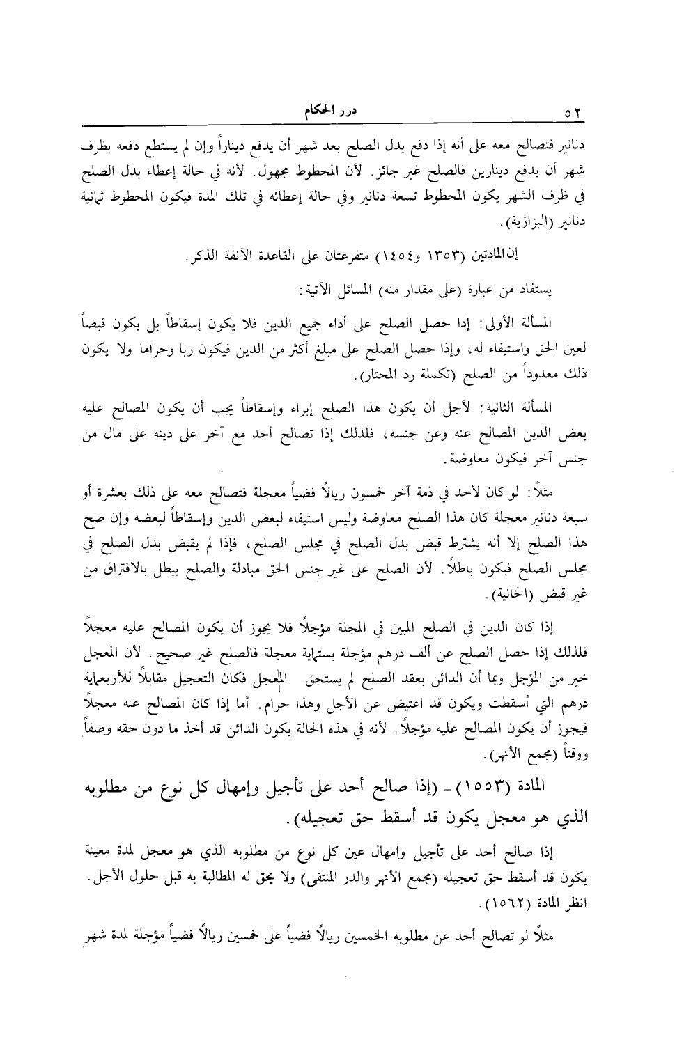 إذَا كَانَ الدَّيْنُ فِي الصُّلْحِ الْمُبَيَّنِ فِي الْمَجَلَّةِ مُؤَجَّلًا فَلَا يَجُوزُ أَنْ يَكُونَ الْمُصَالَحُ عَلَيْهِ مُعَجَّلًا فَلِذَلِكَ إذَا حَصَلَ الصُّلْحُ عَنْ أَلْفِ دِرْهَمٍ مُؤَجَّلَةٍ بِسِتِّمِائَةٍ مُعَجَّلَةٍ فَالصُّلْحُ غَيْرُ صَحِيحٍ؛ لِأَنَّ الْمُعَجَّلَ خَيْرٌ مِنْ الْمُؤَجَّلِ وَبِمَا أَنَّ الدَّائِنَ بِعَقْدِ الصُّلْحِ لَمْ يَسْتَحِقَّ الْمُؤَجَّلَ فَكَانَ التَّعْجِيلُ مُقَابِلًا لِلأرْبَعِمِائَةِ دِرْهَمٍ الَّتِي أُسْقِطَتْ، وَيَكُونُ قَدْ اُعْتِيضَ عَنْ الْأَجَلِ، وَهَذَا حَرَامٌ.