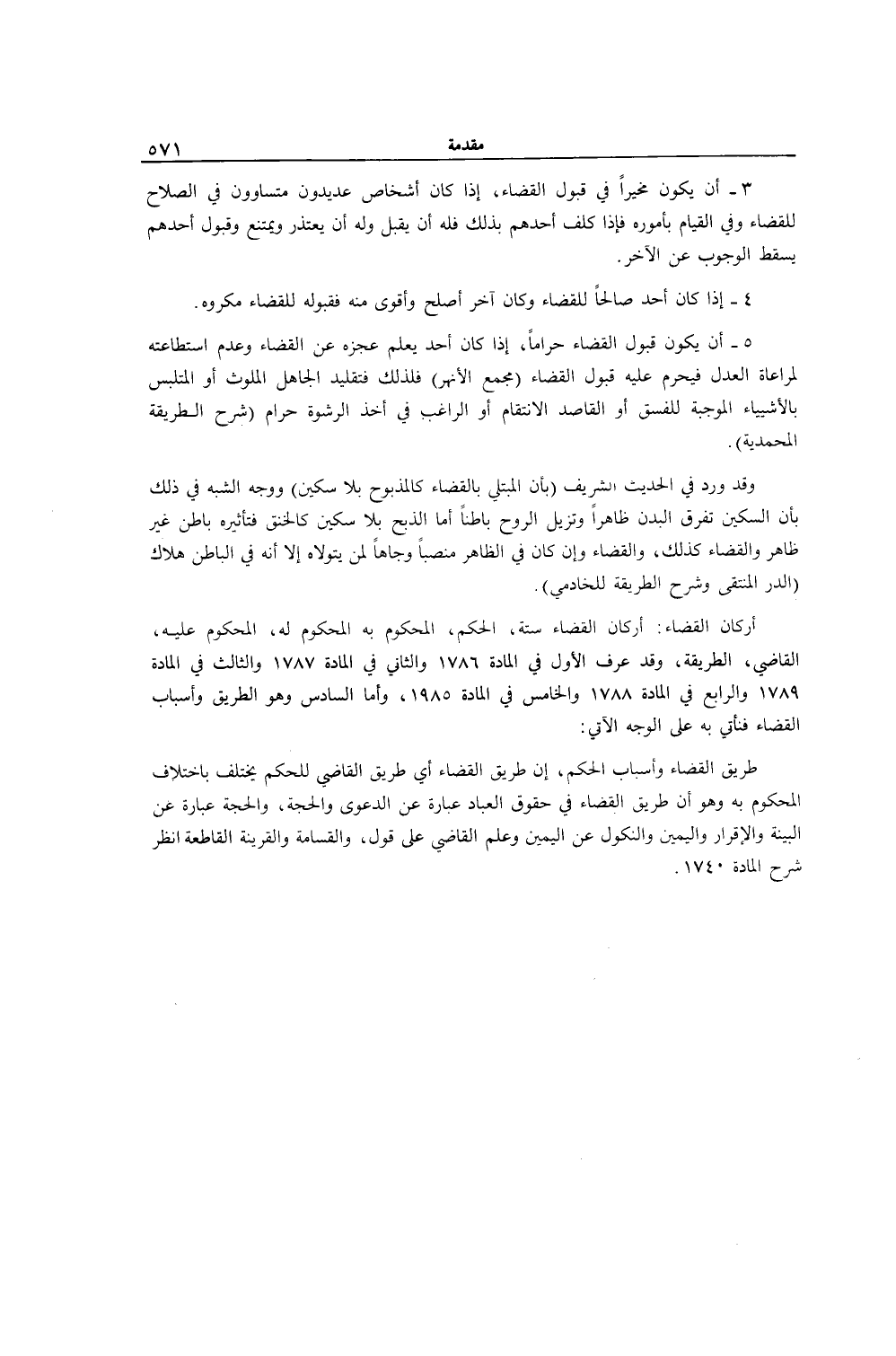 أَرْكَانُ الْقَضَاءِ: أَرْكَانُ الْقَضَاءِ سِتَّةٌ: الْحُكْمُ، الْمَحْكُومُ بِهِ الْمَحْكُومُ لَهُ، الْمَحْكُومُ عَلَيْهِ، الْقَاضِي، الطَّرِيقَةُ، وَقَدْ عُرِفَ الْأَوَّلُ فِي الْمَادَّةِ 1786 وَالثَّانِي فِي الْمَادَّةِ 1787 وَالثَّالِثُ فِي الْمَادَّة 1789 وَالرَّابِعُ فِي الْمَادَّةِ 1788 وَالْخَامِسُ فِي الْمَادَّةِ 1985، وَأَمَّا السَّادِسُ وَهُوَ الطَّرِيقُ، وَأَسْبَابُ الْقَضَاءِ فَنَأْتِي بِهِ عَلَى الْوَجْهِ الْآتِي: طَرِيقُ الْقَضَاءِ، وَأَسْبَابُ الْحُكْمِ إنَّ طَرِيقَ الْقَضَاءِ أَيْ طَرِيقَ الْقَاضِي لِلْحُكْمِ يَخْتَلِفُ بِاخْتِلَافِ الْمَحْكُومِ بِهِ، وَهُوَ أَنَّ طَرِيقَ الْقَضَاءِ فِي حُقُوقِ الْعِبَادِ عِبَارَةٌ عَنْ الدَّعْوَى وَالْحُجَّةِ، وَالْحُجَّةُ عِبَارَةٌ عَنْ الْبَيِّنَةِ وَالْإِقْرَارِ وَالْيَمِينِ وَالنُّكُولِ عَنْ الْيَمِينِ وَعِلْمِ الْقَاضِي عَلَى قَوْلٍ، وَالْقَسَامَةُ، وَالْقَرِينَةُ الْقَاطِعَةُ اُنْظُرْ شَرْحَ الْمَادَّةِ. 1740