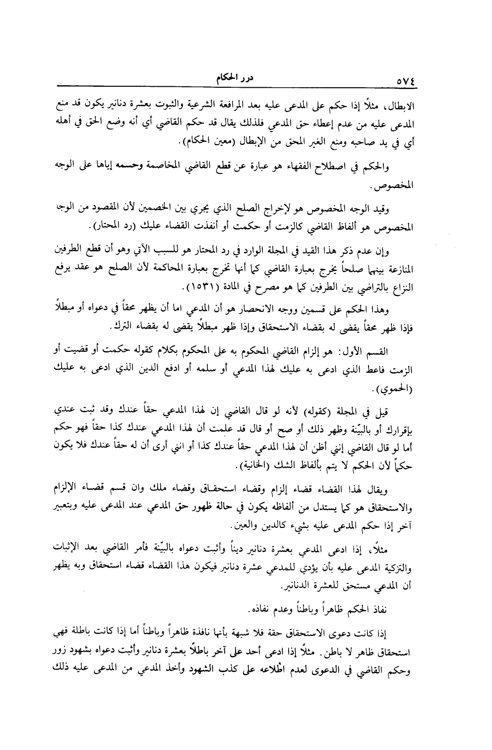 الْأَبْطَالِ. مَثَلًا: إذَا حَكَمَ عَلَى الْمُدَّعَى عَلَيْهِ بَعْدَ الْمُرَافَعَةِ الشَّرْعِيَّةِ وَالثُّبُوتِ بِعَشَرَةِ دَنَانِيرَ يَكُونُ قَدْ مَنَعَ الْمُدَّعَى عَلَيْهِ مِنْ عَدَمِ إعْطَاءِ حَقِّ الْمُدَّعِي فَلِذَلِكَ يُقَالُ قَدْ حَكَمَ الْقَاضِي أَيْ أَنَّهُ وَضَعَ الْحَقَّ فِي أَهْلِهِ أَيْ فِي يَدِ صَاحِبِهِ، وَمَنَعَ الْغَيْرَ الْمُحِقِّ مِنْ الْإِبْطَالِ (مُعِينُ الْحُكَّامِ) . وَالْحُكْمُ فِي اصْطِلَاحِ الْفُقَهَاءِ هُوَ: عِبَارَةٌ عَنْ قَطْعِ الْقَاضِي الْمُخَاصِمَةَ وَحَسْمِهِ إيَّاهَا عَلَى الْوَجْهِ الْمَخْصُوصِ. وَقَيْدُ الْوَجْهِ الْمَخْصُوصِ هُوَ لِإِخْرَاجِ الصُّلْحِ الَّذِي يَجْرِي بَيْنَ الْخَصْمَيْنِ؛ لِأَنَّ الْمَقْصُودَ مِنْ الْوَجْهِ الْمَخْصُوصِ هُوَ أَلْفَاظُ الْقَاضِي كَأَلْزَمْت أَوْ حَكَمْت أَوْ أَنْفَذْت الْقَضَاءَ عَلَيْك (رَدُّ الْمُحْتَارِ) ، وَإِنَّ عَدَمَ ذِكْرِ هَذَا الْقَيْدِ فِي الْمَجَلَّةِ الْوَارِدِ فِي رَدُّ الْمُحْتَارِ هُوَ لِلسَّبَبِ الْآتِي وَهُوَ أَنَّ قَطْعَ الطَّرَفَيْنِ الْمُنَازَعَةَ بَيْنَهُمَا صُلْحًا يَخْرُجُ بِعِبَارَةِ الْقَاضِي كَمَا أَنَّهَا تَخْرُجُ بِعِبَارَةِ الْمُحَاكَمَةِ؛ لِأَنَّ الصُّلْحَ هُوَ عَقْدٌ يَرْفَعُ النِّزَاعَ بِالتَّرَاضِي بَيْنَ الطَّرَفَيْنِ كَمَا هُوَ مُصَرَّحٌ فِي الْمَادَّةِ (1531) . وَهَذَا الْحُكْمُ عَلَى قِسْمَيْنِ وَوَجْهُ الِانْحِصَارِ هُوَ أَنَّ الْمُدَّعِيَ إمَّا أَنْ يَظْهَرَ مُحِقًّا فِي دَعْوَاهُ أَوْ مُبْطِلًا فَإِذَا ظَهَرَ مُحِقًّا يُقْضَى لَهُ بِقَضَاءِ الِاسْتِحْقَاقِ، وَإِذَا ظَهَرَ مُبْطِلًا يُقْضَى لَهُ بِقَضَاءِ التَّرْكِ.