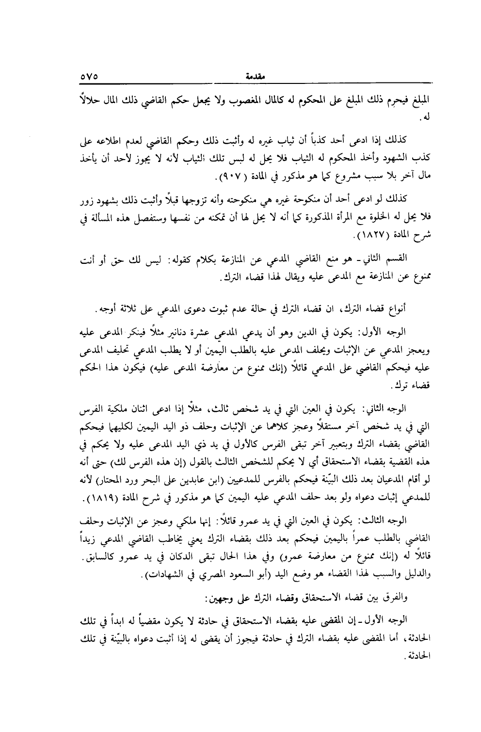 الْقِسْمُ الثَّانِي - هُوَ مَنْعُ الْقَاضِي الْمُدَّعِيَ عَنْ الْمُنَازَعَةِ بِكَلَامٍ كَقَوْلِ: لَيْسَ لَك حَقٌّ أَوْ أَنْتَ مَمْنُوعٌ عَنْ الْمُنَازَعَةِ مَعَ الْمُدَّعَى عَلَيْهِ وَيُقَالُ لِهَذَا قَضَاءُ التَّرْكِ أَنْوَاعُ قَضَاءِ التَّرْكِ إنَّ قَضَاءَ التَّرْكِ فِي حَالَةِ عَدَمِ ثُبُوتِ دَعْوَى الْمُدَّعِي عَلَى ثَلَاثَةِ أَوْجُهٍ. الْوَجْهُ الْأَوَّلُ: يَكُونُ فِي الدَّيْنِ، وَهُوَ أَنْ يَدَّعِيَ الْمُدَّعِي عَشَرَةَ دَنَانِيرَ مَثَلًا فَيُنْكِرَ الْمُدَّعَى عَلَيْهِ، وَيَعْجِزَ الْمُدَّعِي عَنْ الْإِثْبَاتِ وَيَحْلِفُ الْمُدَّعَى عَلَيْهِ بِالطَّلَبِ الْيَمِينَ أَوْ لَا يَطْلُبُ الْمُدَّعِي تَحْلِيفَ الْمُدَّعَى عَلَيْهِ فَيَحْكُمُ الْقَاضِي عَلَى الْمُدَّعِي قَائِلًا (إنَّك مَمْنُوعٌ مِنْ مُعَارَضَةِ الْمُدَّعَى عَلَيْهِ) فَيَكُونُ هَذَا الْحُكْمُ قَضَاءَ تَرْكٍ. الْوَجْهُ الثَّانِي: يَكُونُ فِي الْعَيْنِ الَّتِي فِي يَدِ شَخْصٍ ثَالِثٍ. مَثَلًا: إذَا ادَّعَى اثْنَانِ مِلْكِيَّةَ الْفَرَسِ الَّتِي فِي يَدِ شَخْصٍ آخَرَ مُسْتَقِلًّا، وَعَجَزَ كِلَاهُمَا عَنْ الْإِثْبَاتِ وَحَلَفَ ذُو الْيَدِ الْيَمِينَ لِكِلَيْهِمَا فَيَحْكُمُ الْقَاضِي بِقَضَاءِ التَّرْكِ. وَبِتَعْبِيرٍ آخَرَ: تَبْقَى الْفَرَسُ كَالْأَوَّلِ فِي يَدِ ذِي الْيَدِ الْمُدَّعَى عَلَيْهِ، وَلَا يَحْكُمُ فِي هَذِهِ الْقَضِيَّةِ بِقَضَاءِ الِاسْتِحْقَاقِ أَيْ لَا يَحْكُمُ لِلشَّخْصِ الثَّالِثِ بِالْقَوْلِ (إنَّ هَذِهِ الْفَرَسَ لَك) حَتَّى أَنَّهُ لَوْ أَقَامَ الْمُدَّعِيَانِ بَعْدَ ذَلِكَ الْبَيِّنَةَ فَيَحْكُمُ بِالْفَرَسِ لِلْمُدَّعِيَيْنِ (ابْنُ عَابِدِينَ عَلَى الْبَحْرِ وَرَدُّ الْمُحْتَارِ) ؛ لِأَنَّهُ لِلْمُدَّعِي إثْبَاتُ دَعْوَاهُ وَلَوْ بَعْدَ حَلِفِ الْمُدَّعَى عَلَيْهِ الْيَمِينَ كَمَا هُوَ مَذْكُورٌ فِي شَرْحِ الْمَادَّةِ (1819) .