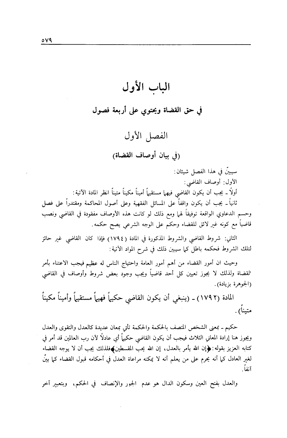 الْمَادَّةِ (1792) (يَنْبَغِي أَنْ يَكُونَ الْقَاضِي حَكِيمًا فَهِيمًا مُسْتَقِيمًا، وَأَمِينًا مَكِينًا مَتِينًا) حَكِيمٌ - بِمَعْنَى الشَّخْصِ الْمُتَّصِفِ بِالْحِكْمَةِ، وَالْحِكْمَةُ تَأْتِي بِمَعَانٍ عَدِيدَةٍ كَالْعَدْلِ وَالتَّقْوَى وَالْعَدْلِ، وَيَجُوزُ هُنَا إرَادَةُ الْمَعَانِي الثَّلَاثِ فَيَجِبُ أَنْ يَكُونَ الْقَاضِي حَكِيمًا أَيْ عَادِلًا؛ لِأَنَّ رَبَّ الْعَالَمِينَ قَدْ أَمَرَ فِي كِتَابِهِ الْعَزِيزِ بِقَوْلِهِ: {إِنَّ اللَّهَ يَأْمُرُ بِالْعَدْلِ} [النحل: 90] ، {إِنَّ اللَّهَ يُحِبُّ الْمُقْسِطِينَ} [المائدة: 42] فَلِذَلِكَ يَجِبُ أَنْ لَا يُوَجَّهَ الْقَضَاءُ لِغَيْرِ الْعَادِلِ كَمَا أَنَّهُ يَحْرُمُ عَلَى مَنْ يَعْلَمُ أَنَّهُ لَا يُمْكِنُهُ مُرَاعَاةُ الْعَدْلِ فِي أَحْكَامِهِ قَبُولُ الْقَضَاءِ كَمَا بُيِّنَ آنِفًا. وَالْعَدْلُ بِفَتْحِ الْعَيْنِ وَسُكُونِ الدَّالِ هُوَ عَدَمُ الْجَوْرِ، وَالْإِنْصَافُ فِي الْحُكْمِ. وَبِتَعْبِيرٍ آخَرَ