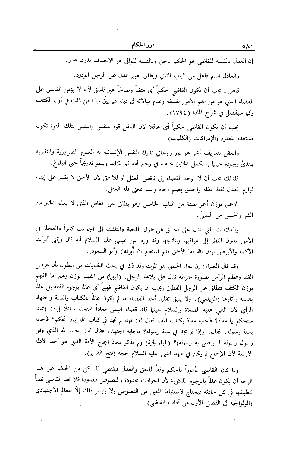 يَجِبُ أَنْ يَكُونَ الْقَاضِي حَكِيمًا أَيْ عَاقِلًا؛ لِأَنَّ الْعَقْلَ قُوَّةٌ لِلنَّفْسِ وَالنَّفْسُ بِتِلْكَ الْقُوَّةِ تَكُونُ مُسْتَعِدَّةً لِلْعُلُومِ وَالْإِدْرَاكَاتِ (الْكُلِّيَّاتُ) . وَالْعَقْلُ بِتَعْرِيفٍ آخَرَ هُوَ نُورٌ رُوحَانِيٌّ تُدْرِكُ النَّفْسُ الْإِنْسَانِيَّةُ بِهِ الْعُلُومَ الضَّرُورِيَّةَ وَالنَّظَرِيَّةَ يَبْتَدِئُ وُجُودُهُ حِينَمَا يَسْتَكْمِلُ الْجَنِينُ خِلْقَتَهُ فِي رَحِمِ أُمِّهِ ثُمَّ يَتَزَايَدُ وَيَنْمُو تَدْرِيجًا حَتَّى الْبُلُوغِ. فَلِذَلِكَ يَجِبُ أَنْ لَا يُوَجَّهَ الْقَضَاءُ إلَى نَاقِصِ الْعَقْلِ أَوْ لِلْأَحْمَقِ؛ لِأَنَّ الْأَحْمَقَ لَا يَقْدِرُ عَلَى إيفَاءِ لَوَازِمِ الْعَدْلِ لِقِلَّةِ عَقْلِهِ وَالْحُمُقُ بِضَمِّ الْحَاءِ وَالْمِيمِ بِمَعْنَى قِلَّةِ الْعَقْلِ. الْأَحْمَقُ بِوَزْنِ أَحْمَرَ صِفَةٌ مِنْ الْبَابِ الْخَامِسِ وَهُوَ يُطْلَقُ عَلَى الْغَافِلِ الَّذِي لَا يَعْلَمُ الْخَيْرَ مِنْ الشَّرِّ، وَالْحَسَنَ مِنْ السَّيِّئِ. وَالْعَلَامَاتُ الَّتِي تَدُلُّ عَلَى الْحُمْقِ هِيَ طُولُ اللِّحْيَةِ، وَالتَّلَفُّتُ إلَى الْجَوَانِبِ كَثِيرًا، وَالْعَجَلَةُ فِي الْأُمُورِ بِدُونِ النَّظَرِ إلَى عَوَاقِبِهَا وَنَتَائِجِهَا وَقَدْ وَرَدَ عَنْ عِيسَى - عَلَيْهِ السَّلَامُ - أَنَّهُ قَالَ: (إنَّنِي أَبْرَأْتُ الْأَكْمَهَ وَالْأَبْرَصَ بِإِذْنِ اللَّهِ أَمَّا الْأَحْمَقُ فَلَمْ أَسْتَطِعْ أَنْ أُبْرِئَهُ) أَبُو السُّعُودِ وَقَدْ قَالَ الْعُلَمَاءُ: إنَّ دَوَاءَ الْحُمْقِ هُوَ الْمَوْتُ وَقَدْ ذُكِرَ فِي بَحْثِ الْكِنَايَاتِ مِنْ الْمُطَوَّلِ بِأَنَّ عَرْضَ الْقَفَا وَعِظَمَ الرَّأْسِ بِصُورَةٍ مُفْرِطَةٍ تَدُلُّ عَلَى بَلَاهَةِ الرَّجُلِ. (فِيهِمَا) مِنْ الْفَهْمِ بِوَزْنِ وَهْمٍ أَمَّا الْفَهِمُ بِوَزْنِ الْكَتِفِ فَتُطْلَقُ عَلَى الرَّجُلِ الْفَطِينِ وَيَجِبُ أَنْ يَكُونَ الْقَاضِي فَهِيمًا أَيْ عَالِمًا بِوُجُوهِ الْفِقْهِ بَلْ عَالِمًا بِالسُّنَّةِ وَآثَارِهَا (الزَّيْلَعِيّ) .