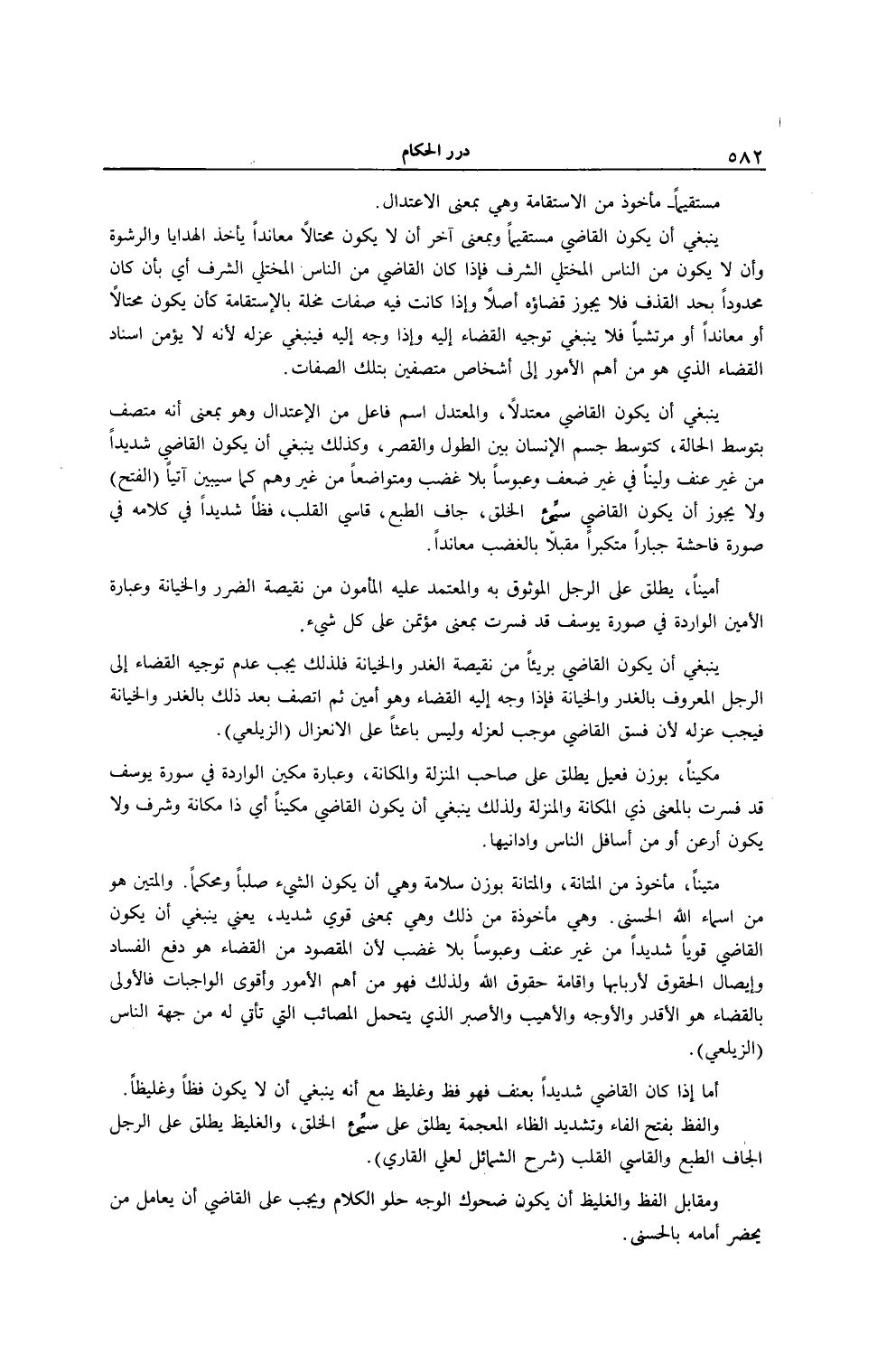 مُسْتَقِيمًا - مَأْخُوذٌ مِنْ الِاسْتِقَامَةِ وَهِيَ بِمَعْنَى الِاعْتِدَالِ. يَنْبَغِي أَنْ يَكُونَ الْقَاضِي مُسْتَقِيمًا. وَبِمَعْنًى آخَرَ أَنْ لَا يَكُونَ مُحْتَالًا مُعَانِدًا يَأْخُذُ الْهَدَايَا وَالرِّشْوَةَ، وَأَنْ لَا يَكُونَ مِنْ النَّاسِ الْمُخْتَلِّي الشَّرَفِ فَإِذَا كَانَ الْقَاضِي مِنْ النَّاسِ الْمُخْتَلِّي الشَّرَفِ أَيْ بِأَنْ كَانَ مَحْدُودًا بِحَدِّ الْقَذْفِ فَلَا يَجُوزُ قَضَاؤُهُ أَصْلًا، وَإِذَا كَانَتْ فِيهِ صِفَاتٌ مُخِلَّةٌ بِالِاسْتِقَامَةِ كَأَنْ يَكُونَ مُحْتَالًا أَوْ مُعَانِدًا أَوْ مُرْتَشِيًا فَلَا يَنْبَغِي تَوْجِيهُ الْقَضَاءِ إلَيْهِ، وَإِذَا وُجِّهَ إلَيْهِ فَيَنْبَغِي عَزْلُهُ؛ لِأَنَّهُ لَا يُؤْمَنُ إسْنَادُ الْقَضَاءِ الَّذِي هُوَ مِنْ أَهَمِّ الْأُمُورِ إلَى أَشْخَاصٍ مُتَّصِفِينَ بِتِلْكَ الصِّفَاتِ.