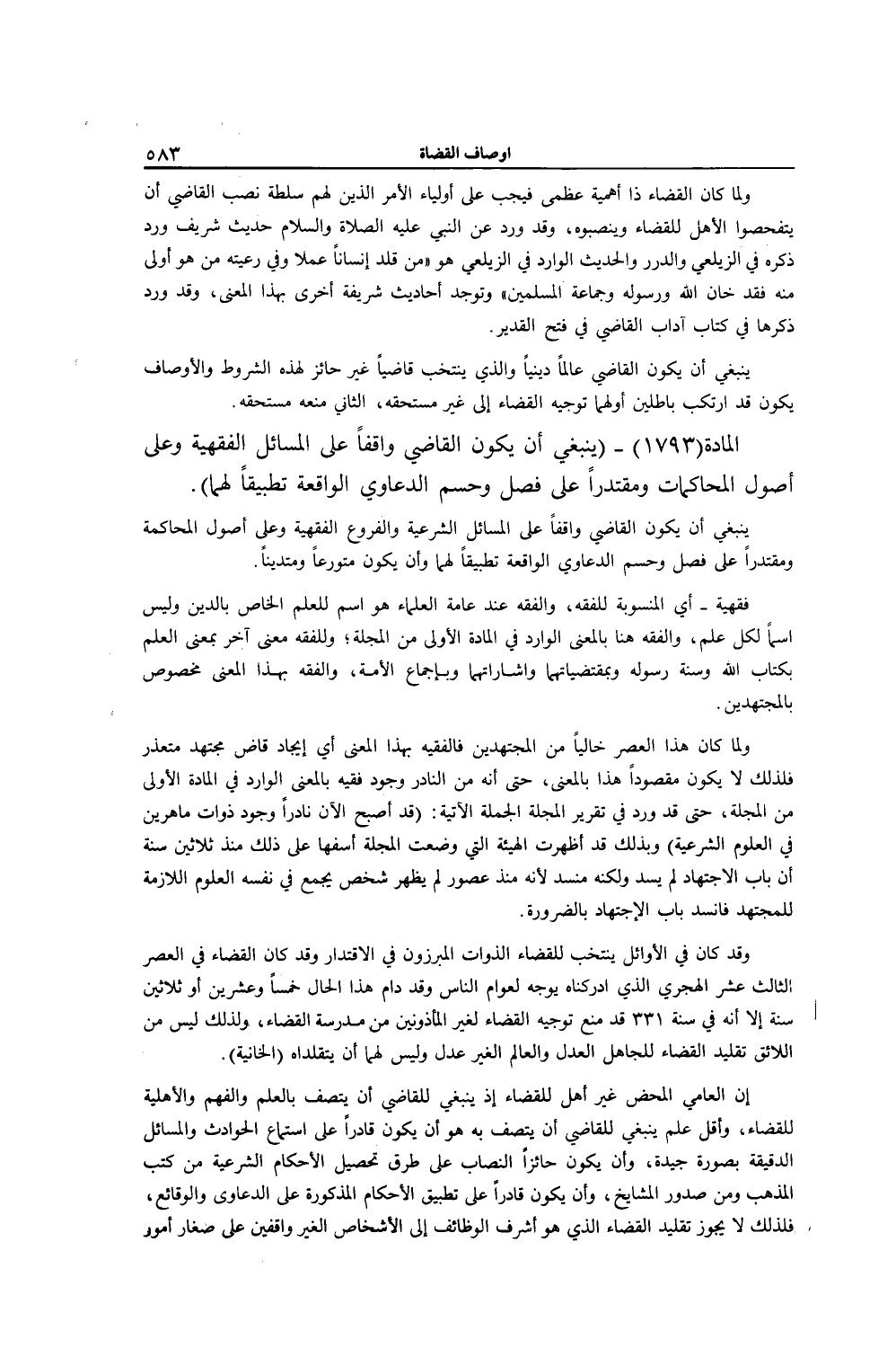 الْمَادَّةُ (1793) (يَنْبَغِي أَنْ يَكُونَ الْقَاضِي، وَاقِفًا عَلَى الْمَسَائِلِ الْفِقْهِيَّةِ وَعَلَى أُصُولِ الْمُحَاكَمَاتِ وَمُقْتَدِرًا عَلَى فَصْلِ وَحَسْمِ الدَّعَاوَى الْوَاقِعَةِ تَطْبِيقًا لَهُمَا) . وَيَنْبَغِي أَنْ يَكُونَ الْقَاضِي وَاقِفًا عَلَى الْمَسَائِلِ الشَّرْعِيَّةِ وَالْفُرُوعِ الْفِقْهِيَّةِ وَعَلَى أُصُولِ الْمُحَاكَمَةِ وَمُقْتَدِرًا عَلَى فَصْلِ وَحَسْمِ الدَّعَاوَى الْوَاقِعَةِ تَطْبِيقًا لَهُمَا، وَأَنْ يَكُونَ مُتَوَرِّعًا وَمُتَدَيِّنًا. فِقْهِيَّةٌ - أَيْ الْمَنْسُوبَةِ لِلْفِقْهِ، وَالْفِقْهُ عِنْدَ عَامَّةِ الْعُلَمَاءِ هُوَ اسْمٌ لِلْعِلْمِ الْخَاصِّ بِالدِّينِ، وَلَيْسَ اسْمًا لِكُلِّ عِلْمٍ، وَالْفِقْهُ هُنَا بِالْمَعْنَى الْوَارِدِ فِي الْمَادَّةِ الْأُولَى مِنْ الْمَجَلَّةِ؛ وَلِلْفِقْهِ مَعْنًى آخَرُ بِمَعْنَى الْعِلْمِ بِكِتَابِ اللَّهِ وَسُنَّةِ رَسُولِهِ وَبِمُقْتَضَيَاتِهِ مَا، وَإِشَارَاتِهِمَا وَبِإِجْمَاعِ الْأُمَّةِ، وَالْفِقْهُ بِهَذَا الْمَعْنَى مَخْصُوصٌ بِالْمُجْتَهِدِينَ. وَلَمَّا كَانَ هَذَا الْعَصْرُ خَالِيًا مِنْ الْمُجْتَهِدِينَ فَالْفَقِيهُ بِهَذَا الْمَعْنَى أَيْ إيجَادُ قَاضٍ مُجْتَهِدٍ مُتَعَذِّرٌ فَلِذَلِكَ لَا يَكُونُ مَقْصُودًا هَذَا بِالْمَعْنَى، حَتَّى أَنَّهُ مِنْ النَّادِرِ وُجُودُ فَقِيهٍ بِالْمَعْنَى الْوَارِدِ فِي الْمَادَّةِ الْأُولَى مِنْ الْمَجَلَّةِ، حَتَّى قَدْ وَرَدَ فِي تَقْرِيرِ الْمَجَلَّةِ الْجُمْلَةُ الْآتِيَةُ: (قَدْ أَصْبَحَ الْآنَ نَادِرًا وُجُودُ ذَوَاتٍ مَاهِرِينَ فِي الْعُلُومِ الشَّرْعِيَّةِ) وَبِذَلِكَ قَدْ أَظْهَرَتْ الْهَيْئَةُ الَّتِي وَضَعَتْ الْمَجَلَّةَ أَسَفَهَا عَلَى ذَلِكَ مُنْذُ ثَلَاثِينَ سَنَةً أَنَّ بَابَ الِاجْتِهَادِ لَمْ يُسَدَّ وَلَكِنَّهُ مُنْسَدٌّ؛ لِأَنَّهُ مُنْذُ عُصُورٍ لَمْ يَظْهَرْ شَخْصٌ يَجْمَعُ فِي نَفْسِهِ الْعُلُومَ اللَّازِمَةَ لِلْمُجْتَهِدِ فَانْسَدَّ بَابُ الِاجْتِهَادِ بِالضَّرُورَةِ. وَقَدْ كَانَ فِي الْأَوَائِلِ يُنْتَخَبُ لِلْقَضَاءِ الذَّوَاتُ الْمُبْرِزُونَ فِي الِاقْتِدَارِ، وَقَدْ كَانَ الْقَضَاءُ فِي الْعَصْرِ الثَّالِثِ عَشَرَ الْهِجْرِيِّ الَّذِي أَدْرَكْنَاهُ يُوَجَّهُ لِعَوَامِّ النَّاسِ وَقَدْ دَامَ هَذَا الْحَالُ خَمْسًا وَعِشْرِينَ أَوْ ثَلَاثِينَ سَنَةً إلَّا أَنَّهُ فِي سَنَةِ 331 قَدْ مُنِعَ تَوْجِيهُ الْقَضَاءِ لِغَيْرِ الْمَأْذُونِينَ مِنْ مَدْرَسَةِ الْقَضَاءِ، وَلِذَلِكَ لَيْسَ مِنْ اللَّائِقِ تَقْلِيدُ الْقَضَاءِ لِلْجَاهِلِ الْعَدْلِ، وَالْعَالِمِ الْغَيْرِ عَدْلٍ وَلَيْسَ لَهُمَا أَنْ يَتَقَلَّدَاهُ (الْخَانِيَّةُ) .