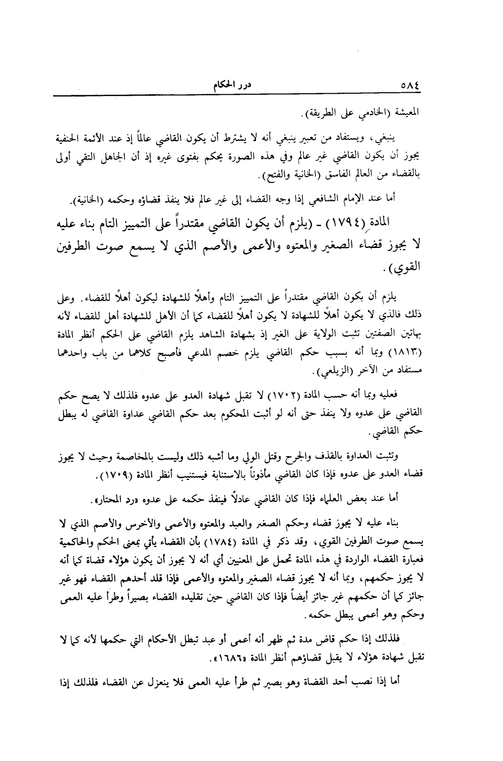 بِنَاءً عَلَيْهِ لَا يَجُوزُ قَضَاءُ وَحُكْمُ الصَّغِيرِ وَالْعَبْدِ وَالْمَعْتُوهِ، وَالْأَعْمَى وَالْأَخْرَسِ وَالْأَصَمِّ الَّذِي لَا يَسْمَعُ صَوْتَ الطَّرَفَيْنِ الْقَوِيَّ، وَقَدْ ذُكِرَ فِي الْمَادَّةِ (1784) بِأَنَّ الْقَضَاءَ يَأْتِي بِمَعْنَى الْحُكْمِ وَالْحَاكِمِيَّةِ فَعِبَارَةُ الْقَضَاءِ الْوَارِدَةِ فِي هَذِهِ الْمَادَّة تُحْمَلُ عَلَى الْمَعْنَيَيْنِ أَيْ أَنَّهُ لَا يَجُوزُ أَنْ يَكُونَ هَؤُلَاءِ قُضَاةً كَمَا أَنَّهُ لَا يَجُوزُ حُكْمُهُمْ، وَبِمَا أَنَّهُ لَا يَجُوزُ قَضَاءُ الصَّغِيرِ وَالْمَعْتُوهِ وَالْأَعْمَى فَإِذَا قُلِّدَ أَحَدُهُمْ الْقَضَاءَ فَهُوَ غَيْرُ جَائِزٍ كَمَا أَنَّ حُكْمَهُمْ غَيْرُ جَائِزٍ أَيْضًا فَإِذَا كَانَ الْقَاضِي حِينَ تَقْلِيدِهِ الْقَضَاءَ بَصِيرًا وَطَرَأَ عَلَيْهِ الْعَمَى وَحَكَمَ وَهُوَ أَعْمَى يَبْطُلُ حُكْمُهُ. فَلِذَلِكَ إذَا حَكَمَ قَاضٍ مُدَّةً ثُمَّ ظَهَرَ أَنَّهُ أَعْمَى أَوْ عَبْدٌ تَبْطُلُ الْأَحْكَامُ الَّتِي حَكَمَهَا؛ لِأَنَّهُ كَمَا لَا تُقْبَلُ شَهَادَةُ هَؤُلَاءِ لَا يُقْبَلُ قَضَاؤُهُمْ اُنْظُرْ الْمَادَّةَ (1686) .