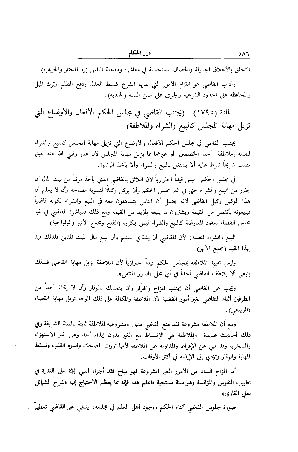 الْمَادَّةُ (1795) (يَجْتَنِبُ الْقَاضِي فِي مَجْلِسِ الْحُكْمِ الْأَفْعَالَ وَالْأَوْضَاعَ الَّتِي تُزِيلُ مَهَابَةَ الْمَجْلِسِ كَالْبَيْعِ وَالشِّرَاءِ وَالْمُلَاطَفَةِ) يَجْتَنِبُ الْقَاضِي فِي مَجْلِسِ الْحُكْمِ الْأَفْعَالَ وَالْأَوْضَاعَ الَّتِي تُزِيلُ مَهَابَةَ الْمَجْلِسِ كَالْبَيْعِ وَالشِّرَاءِ لِنَفْسِهِ وَمُلَاطَفَةِ أَحَدِ الْخَصْمَيْنِ أَوْ غَيْرِهِمَا مِمَّا يُزِيلُ مَهَابَةَ الْمَجْلِسِ؛ لِأَنَّ عُمَرَ - رَضِيَ اللَّهُ عَنْهُ - حِينَمَا نَصَّبَ شُرَيْحًا شَرَطَ عَلَيْهِ أَلَا يَشْتَغِلَ بِالْبَيْعِ وَالشِّرَاءِ، وَأَلَّا يَأْخُذَ الرِّشْوَةَ. فِي مَجْلِسِ الْحُكْمِ: لَيْسَ قَيْدًا احْتِرَازِيًّا؛ لِأَنَّ اللَّائِقَ بِالْقَاضِي الَّذِي يَأْخُذُ مُرَتَّبًا مِنْ بَيْتِ الْمَالِ أَنْ يَحْتَرِزَ مِنْ الْبَيْعِ وَالشِّرَاءِ حَتَّى فِي غَيْرِ مَجْلِسِ الْحُكْمِ، وَأَنْ يُوَكِّلَ وَكِيلًا لِتَسْوِيَةِ مَصَالِحِهِ، وَأَنْ لَا يُعْلِمَ أَنَّ هَذَا الْوَكِيلَ وَكِيلُ الْقَاضِي؛ لِأَنَّهُ يَحْتَمِلُ أَنَّ النَّاسَ يَتَسَاهَلُونَ مَعَهُ فِي الْبَيْعِ، وَالشِّرَاءِ لِكَوْنِهِ قَاضِيًا فَيَبِيعُونَهُ بِأَنْقَصَ مِنْ الْقِيمَةِ وَيَشْتَرُونَ مَا يَبِيعُهُ بِأَزْيَدَ مِنْ الْقِيمَةِ، وَمَعَ ذَلِكَ فَمُبَاشَرَةُ الْقَاضِي فِي غَيْرِ مَجْلِسِ الْقَضَاءِ لِعُقُودِ الْمُعَاوَضَةِ كَالْبَيْعِ وَالشِّرَاءِ لَيْسَ بِمَكْرُوهٍ (الْفَتْحُ وَمَجْمَعُ الْأَنْهُرِ والولوالجية) . الْبَيْعُ وَالشِّرَاءُ لِنَفْسِهِ؛ لِأَنَّ لِلْقَاضِي أَنْ يَشْتَرِيَ لِلْيَتِيمِ، وَأَنْ يَبِيعَ مَالَ الْمَيِّتِ الْمَدِينِ فَلِذَلِكَ قَيَّدَ بِهَذَا الْقَيْدِ (مَجْمَعُ الْأَنْهُرِ) . وَلَيْسَ تَقْيِيدُ الْمُلَاطَفَةِ بِمَجْلِسِ الْحُكْمِ قَيْدًا احْتِرَازِيًّا؛ لِأَنَّ الْمُلَاطَفَةَ تُزِيلُ مَهَابَةَ الْقَاضِي فَلِذَلِكَ يَنْبَغِي أَلَا يُلَاطِفَ الْقَاضِي أَحَدًا فِي أَيِّ مَحَلٍّ (الدُّرُّ الْمُنْتَقَى) .