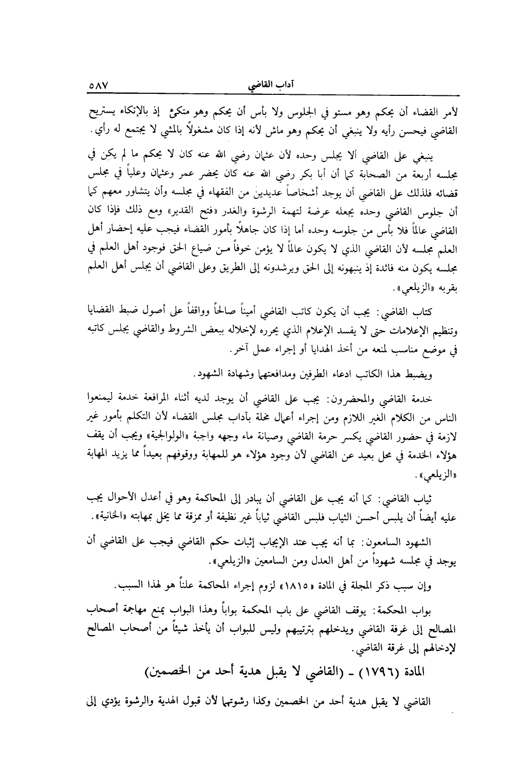 لِأَمْرِ الْقَضَاءِ أَنْ يَحْكُمَ وَهُوَ مُسْتَوٍ فِي الْجُلُوسِ، وَلَا بَأْسَ أَنْ يَحْكُمَ وَهُوَ مُتَّكِئٌ إذْ بِالْإِتْكَاءِ يَسْتَرِيحُ الْقَاضِي فَيَحْسُنُ رَأْيُهُ وَلَا يَنْبَغِي أَنْ يَحْكُمَ وَهُوَ مَاشٍ؛ لِأَنَّهُ إذَا كَانَ مَشْغُولًا بِالْمَشْيِ لَا يَجْتَمِعُ لَهُ رَأْيٌ. يَنْبَغِي عَلَى الْقَاضِي أَلَّا يَجْلِسَ وَحْدَهُ؛ لِأَنَّ عُثْمَانَ - رَضِيَ اللَّهُ عَنْهُ - كَانَ لَا يَحْكُمُ مَا لَمْ يَكُنْ فِي مَجْلِسِهِ أَرْبَعَةٌ مِنْ الصَّحَابَةِ كَمَا أَنَّ أَبَا بَكْرٍ - رَضِيَ اللَّهُ عَنْهُ - كَانَ يُحْضِرُ عُمَرَ وَعُثْمَانَ وَعَلِيًّا فِي مَجْلِسِ قَضَائِهِ فَلِذَلِكَ عَلَى الْقَاضِي أَنْ يُوجِدَ أَشْخَاصًا عَدِيدِينَ مِنْ الْفُقَهَاءِ فِي مَجْلِسِهِ، وَأَنْ يَتَشَاوَرَ مَعَهُمْ كَمَا أَنَّ جُلُوسَ الْقَاضِي وَحْدَهُ يَجْعَلُهُ عُرْضَةً لِتُهْمَةِ الرِّشْوَةِ وَالْغَدْرِ (فَتْحُ الْقَدِيرِ) . وَمَعَ ذَلِكَ فَإِذَا كَانَ الْقَاضِي عَالِمًا فَلَا بَأْسَ مِنْ جُلُوسِهِ وَحْدَهُ أَمَّا إذَا كَانَ جَاهِلًا بِأُمُورِ الْقَضَاءِ فَيَجِبُ عَلَيْهِ إحْضَارُ أَهْلِ الْعِلْمِ مَجْلِسَهُ؛ لِأَنَّ الْقَاضِيَ الَّذِي لَا يَكُونُ عَالِمًا لَا يُؤْمَنُ خَوْفًا مِنْ ضَيَاعِ الْحَقِّ فَوُجُودُ أَهْلِ الْعِلْمِ فِي مَجْلِسِهِ يَكُونُ مِنْهُ فَائِدَةٌ إذْ يُنَبِّهُونَهُ إلَى الْحَقِّ وَيُرْشِدُونَهُ إلَى الطَّرِيقِ، وَعَلَى الْقَاضِي أَنْ يُجْلِسَ أَهْلَ الْعِلْمِ بِقُرْبِهِ (الزَّيْلَعِيّ) .