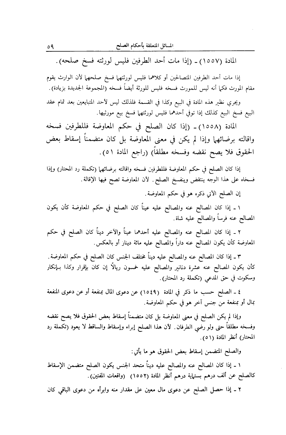 الْمَادَّةُ (1558) - (إذَا كَانَ الصُّلْحُ فِي حُكْمِ الْمُعَاوَضَةِ فَلِلطَّرَفَيْنِ فَسْخُهُ وَإِقَالَتُهُ بِرِضَائِهِمَا وَإِذَا لَمْ يَكُنْ فِي مَعْنَى الْمُعَاوَضَةِ بَلْ كَانَ مُتَضَمِّنًا إسْقَاطَ بَعْضِ الْحُقُوقِ فَلَا يَصِحُّ نَقْضُهُ وَفَسْخُهُ مُطْلَقًا) (رَاجِعْ الْمَادَّةَ 51) .