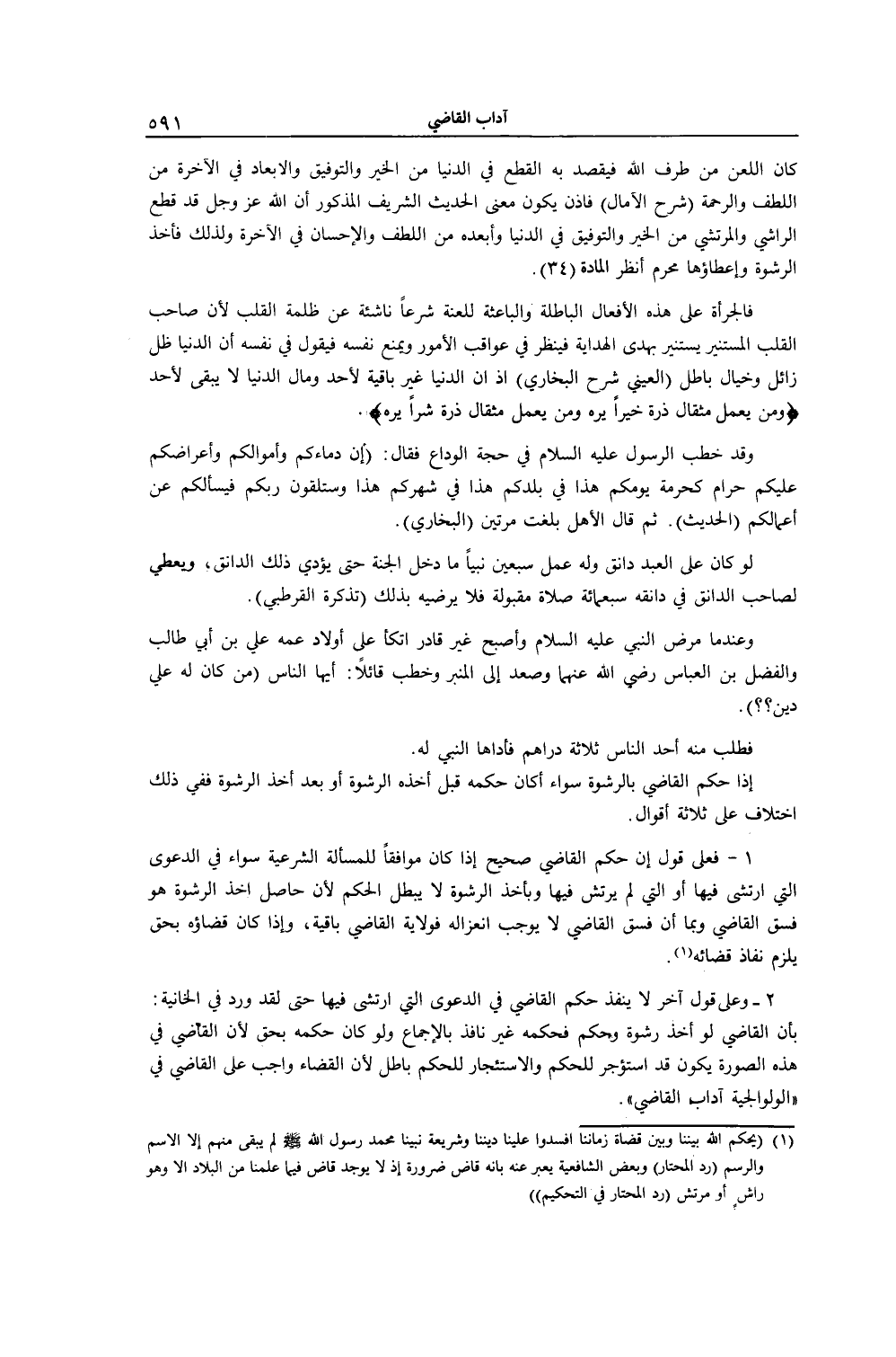 كَانَ اللَّعْنُ مِنْ طَرَفِ اللَّهِ فَيُقْصَدُ بِهِ الْقَطْعُ فِي الدُّنْيَا مِنْ الْخَيْرِ وَالتَّوْفِيقِ، وَالْإِبْعَادُ فِي الْآخِرَةِ مِنْ اللُّطْفِ وَالرَّحْمَةِ (شَرْحُ الْآمَالِ) فَإِذَنْ يَكُونُ مَعْنَى الْحَدِيثِ الشَّرِيفِ الْمَذْكُورِ أَنَّ اللَّهَ - عَزَّ وَجَلَّ - قَدْ قَطَعَ الرَّاشِيَ وَالْمُرْتَشِيَ مِنْ الْخَيْرِ وَالتَّوْفِيقِ فِي الدُّنْيَا، وَأَبْعَدَهُ مِنْ اللُّطْفِ وَالْإِحْسَانِ فِي الْآخِرَةِ، وَلِذَلِكَ فَأَخْذُ الرِّشْوَةِ، وَإِعْطَاؤُهَا مُحَرَّمٌ اُنْظُرْ الْمَادَّةَ (34) . فَالْجُرْأَةُ عَلَى هَذِهِ الْأَفْعَالِ الْبَاطِلَةِ وَالْبَاعِثَةِ لِلَّعْنَةِ شَرْعًا نَاشِئَةٌ عَنْ ظُلْمَةِ الْقَلْبِ؛ لِأَنَّ صَاحِبَ الْقَلْبِ الْمُسْتَنِيرِ يَسْتَنِيرُ بِهَدْيِ الْهِدَايَةِ فَيَنْظُرُ فِي عَوَاقِبِ الْأُمُورِ، وَمَنَعَ نَفْسَهُ فَيَقُولُ فِي نَفْسِهِ: إنَّ الدُّنْيَا ظِلٌّ زَائِلٌ وَخَيَالٌ بَاطِلٌ (الْعَيْنِيُّ شَرْحُ الْبُخَارِيِّ) .