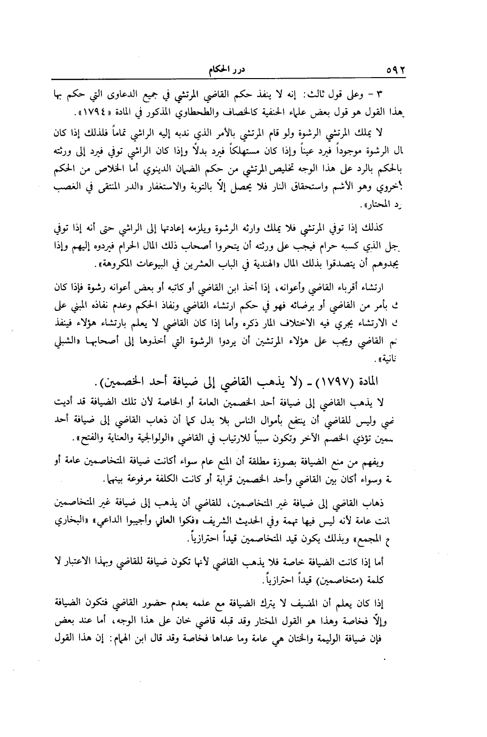 وَعَلَى قَوْلٍ ثَالِثٍ: إنَّهُ لَا يَنْفُذُ حُكْمُ الْقَاضِي الْمُرْتَشِي فِي جَمِيعِ الدَّعَاوَى الَّتِي حَكَمَ بِهَا وَهَذَا الْقَوْلُ هُوَ قَوْلُ بَعْضِ عُلَمَاءِ الْحَنَفِيَّةِ كَالْخَصَّافِ وَالطَّحْطَاوِيُّ الْمَذْكُورُ فِي الْمَادَّةِ " 1794 ". لَا يَمْلِكُ الْمُرْتَشِي الرِّشْوَةَ وَلَوْ قَامَ الْمُرْتَشِي بِالْأَمْرِ الَّذِي نَدَبَهُ إلَيْهِ الرَّاشِي تَمَامًا فَلِذَلِكَ إذَا كَانَ مَالُ الرِّشْوَةِ مَوْجُودًا فَيُرَدُّ عَيْنًا وَإِذَا كَانَ مُسْتَهْلَكًا فَيُرَدُّ بَدَلًا وَإِذَا كَانَ الرَّاشِي تُوُفِّيَ فَيُرَدُّ إلَى وَرَثَتِهِ وَبِالْحُكْمِ بِالرَّدِّ عَلَى هَذَا الْوَجْهِ تَخْلِيصُ الْمُرْتَشِي مِنْ حُكْمِ الضَّمَانِ الدُّنْيَوِيِّ أَمَّا الْخَلَاصُ مِنْ الْحُكْمِ الْأُخْرَوِيِّ وَهُوَ الْأَهَمُّ وَاسْتِحْقَاقُ النَّارِ فَلَا يَحْصُلُ إلَّا بِالتَّوْبَةِ وَالِاسْتِغْفَارِ " الدُّرُّ الْمُنْتَقَى فِي الْغَصْبِ وَرَدُّ الْمُحْتَارِ ". كَذَلِكَ إذَا تُوُفِّيَ الْمُرْتَشِي فَلَا يَمْلِكُ وَارِثُهُ الرِّشْوَةَ وَيَلْزَمُهُ إعَادَتُهَا إلَى الرَّاشِي حَتَّى أَنَّهُ إذَا تُوُفِّيَ الرَّجُلُ الَّذِي كَسْبُهُ حَرَامٌ فَيَجِبُ عَلَى وَرَثَتِهِ؛ أَنْ يَتَحَرَّوْا أَصْحَابَ ذَلِكَ الْمَالِ الْحَرَامِ فَيَرُدُّوهُ إلَيْهِمْ وَإِذَا لَمْ يَجِدُوهُمْ أَنْ يَتَصَدَّقُوا بِذَلِكَ الْمَالِ " الْهِنْدِيَّةُ فِي الْبَابِ الْعِشْرِينَ فِي الْبُيُوعَاتِ الْمَكْرُوهَةِ ".
