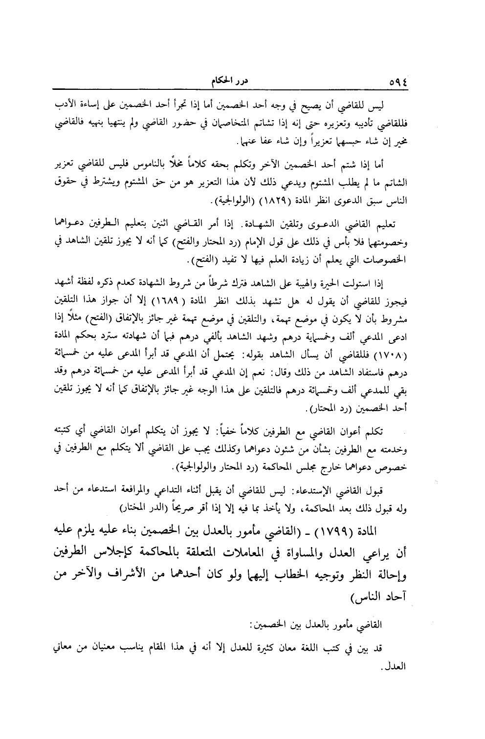 [ (الْمَادَّةُ 1799) الْقَاضِي مَأْمُورٌ بِالْعَدْلِ بَيْنَ الْخَصْمَيْنِ]