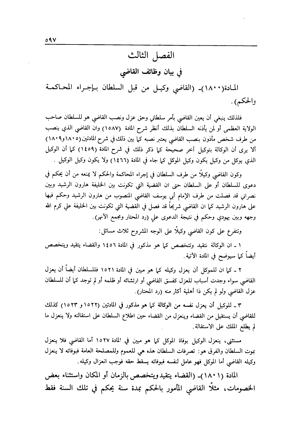 وَكَوْنُ الْقَاضِي وَكِيلًا مِنْ طَرَفِ السُّلْطَانِ فِي إجْرَاءِ الْمُحَاكَمَةِ وَالْحُكْمِ لَا يَمْنَعُهُ مِنْ أَنْ يَحْكُمَ فِي دَعْوَى لِلسُّلْطَانِ أَوْ عَلَى السُّلْطَانِ حَتَّى إنَّ الْقَضِيَّةَ الَّتِي تَكَوَّنَتْ بَيْنَ الْخَلِيفَةِ هَارُونَ الرَّشِيدِ وَبَيْنَ نَصْرَانِيٍّ قَدْ فُصِلَتْ مِنْ طَرَفِ الْإِمَامِ أَبِي يُوسُفَ الْقَاضِي الْمَنْصُوبِ مِنْ هَارُونَ الرَّشِيدِ وَحَكَمَ فِيهَا عَلَى هَارُونَ الرَّشِيدِ كَمَا أَنَّ الْقَاضِيَ شُرَيْحًا قَدْ فَصَلَ فِي الْقَضِيَّةِ الَّتِي تَكَوَّنَتْ بَيْنَ الْخَلِيفَةِ عَلِيٍّ كَرَّمَ اللَّهُ وَجْهَهُ وَبَيْنَ يَهُودِيٍّ وَحَكَمَ فِي نَتِيجَةِ الدَّعْوَى عَلَى عَلِيٍّ (رَدُّ الْمُحْتَارِ وَمَجْمَعُ الْأَنْهُرِ) . وَتَتَفَرَّعُ عَلَى كَوْنِ الْقَاضِي وَكِيلًا عَلَى الْوَجْهِ الْمَشْرُوحِ ثَلَاثُ مَسَائِلَ: إنَّ الْوَكَالَةَ تَتَقَيَّدُ وَتَتَخَصَّصُ كَمَا هُوَ مَذْكُورٌ فِي الْمَادَّةِ 1456 وَالْقَضَاءُ يَتَقَيَّدُ وَيَتَخَصَّصُ أَيْضًا كَمَا سَيُوَضَّحُ فِي الْمَادَّةِ الْآتِيَةِ. 2 - كَمَا أَنَّ لِلْمُوَكِّلِ أَنْ يَعْزِلَ وَكِيلَهُ كَمَا هُوَ مُبَيَّنٌ فِي الْمَادَّةِ 1521 فَلِلسُّلْطَانِ أَيْضًا أَنْ يَعْزِلَ الْقَاضِيَ سَوَاءٌ وُجِدَتْ أَسْبَابٌ لِلْعَزْلِ كَفِسْقِ الْقَاضِي أَوْ ارْتِشَائِهِ أَوْ ظُلْمِهِ أَوْ لَمْ تُوجَدْ كَمَا أَنَّ لِلسُّلْطَانِ عَزْلَ الْقَاضِي وَلَوْ لَمْ يَكُنْ ذَا أَهْلِيَّةٍ أَكْثَرَ مِنْهُ (رَدُّ الْمُحْتَارِ) 3 - لِلْوَكِيلِ أَنْ يَعْزِلَ نَفْسَهُ مِنْ الْوَكَالَةِ كَمَا هُوَ مَذْكُورٌ فِي الْمَادَّتَيْنِ (1522 و 1523) كَذَلِكَ لِلْقَاضِي أَنْ يَسْتَقِيلَ مِنْ الْقَضَاءِ وَيَنْعَزِلَ مِنْ الْقَضَاءِ حِينَ اطِّلَاعِ السُّلْطَانِ عَلَى اسْتِقَالَتِهِ وَلَا يَنْعَزِلُ مَا لَمْ يَطَّلِعْ الْمَلِكُ عَلَى الِاسْتِقَالَةِ. مُسْتَثْنًى، يَنْعَزِلُ الْوَكِيلُ بِوَفَاةِ الْمُوَكِّلِ كَمَا هُوَ مُبَيَّنٌ فِي الْمَادَّةِ 1527 أَمَّا الْقَاضِي فَلَا يَنْعَزِلُ بِمَوْتِ السُّلْطَانِ وَالْفَرْقُ هُوَ: تَصَرُّفَاتُ السُّلْطَانِ هَذِهِ هِيَ لِلْعُمُومِ وَلِلْمَصْلَحَةِ الْعَامَّةِ فَبِوَفَاتِهِ لَا يَنْعَزِلُ وَكِيلُهُ الْقَاضِي أَمَّا الْمُوَكِّلُ فَهُوَ عَامِلٌ لِنَفْسِهِ