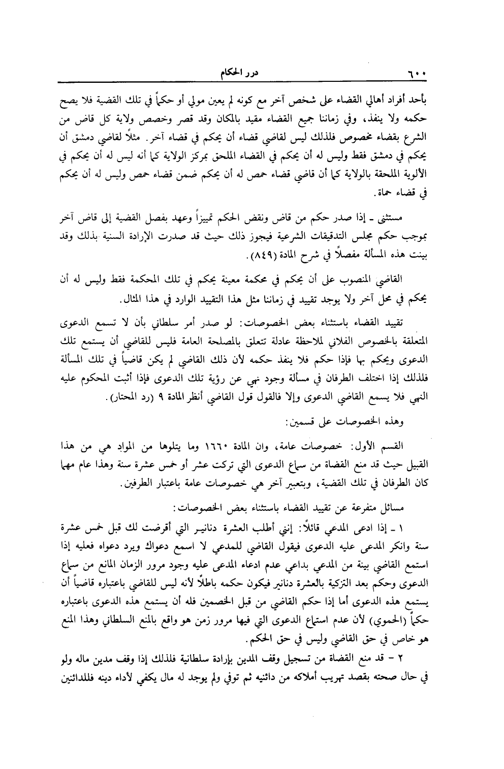 تَقْيِيدُ الْقَضَاءِ بِاسْتِثْنَاءِ بَعْضِ الْخُصُوصَاتِ: لَوْ صَدَرَ أَمْرٌ سُلْطَانِيٌّ بِأَنْ لَا تُسْمَعَ الدَّعْوَى الْمُتَعَلِّقَةُ بِالْخُصُوصِ الْفُلَانِيِّ لِمُلَاحَظَةٍ عَادِلَةٍ تَتَعَلَّقُ بِالْمَصْلَحَةِ الْعَامَّةِ فَلَيْسَ لِلْقَاضِي أَنْ يَسْتَمِعَ تِلْكَ الدَّعْوَى وَيَحْكُمَ بِهَا فَإِذَا حَكَمَ فَلَا يَنْفُذُ حُكْمُهُ لِأَنَّ ذَلِكَ الْقَاضِيَ لَمْ يَكُنْ قَاضِيًا فِي تِلْكَ الْمَسْأَلَةِ فَلِذَلِكَ إذَا اخْتَلَفَ الطَّرَفَانِ فِي مَسْأَلَةِ وُجُودِ نَهْيٍ عَنْ رُؤْيَةِ تِلْكَ الدَّعْوَى فَإِذَا أَثْبَتَ الْمَحْكُومُ عَلَيْهِ النَّهْيَ فَلَا يَسْمَعُ الْقَاضِي الدَّعْوَى وَإِلَّا فَالْقَوْلُ قَوْلُ الْقَاضِي اُنْظُرْ الْمَادَّةَ 9 (رَدُّ الْمُحْتَارِ) . وَهَذِهِ الْخُصُوصَاتُ عَلَى قِسْمَيْنِ: الْقِسْمُ الْأَوَّلُ: خُصُوصَاتٌ عَامَّةٌ، وَإِنَّ الْمَادَّةَ 1660 وَمَا يَتْلُوهَا مِنْ الْمَوَادِّ هِيَ مِنْ هَذَا الْقَبِيلِ حَيْثُ قَدْ مُنِعَ الْقُضَاةُ مِنْ سَمَاعِ الدَّعْوَى الَّتِي تَرَكَتْ عَشْرَ أَوْ خَمْسَ عَشْرَةَ سَنَةً وَهَذَا عَامٌّ مَهْمَا كَانَ الطَّرَفَانِ فِي تِلْكَ الْقَضِيَّةِ، وَبِتَعْبِيرٍ آخَرَ هِيَ خُصُوصَاتٌ عَامَّةٌ بِاعْتِبَارِ الطَّرَفَيْنِ. مَسَائِلُ مُتَفَرِّعَةٌ عَنْ تَقْيِيدِ الْقَضَاءِ بِاسْتِثْنَاءِ بَعْضِ الْخُصُوصَاتِ: