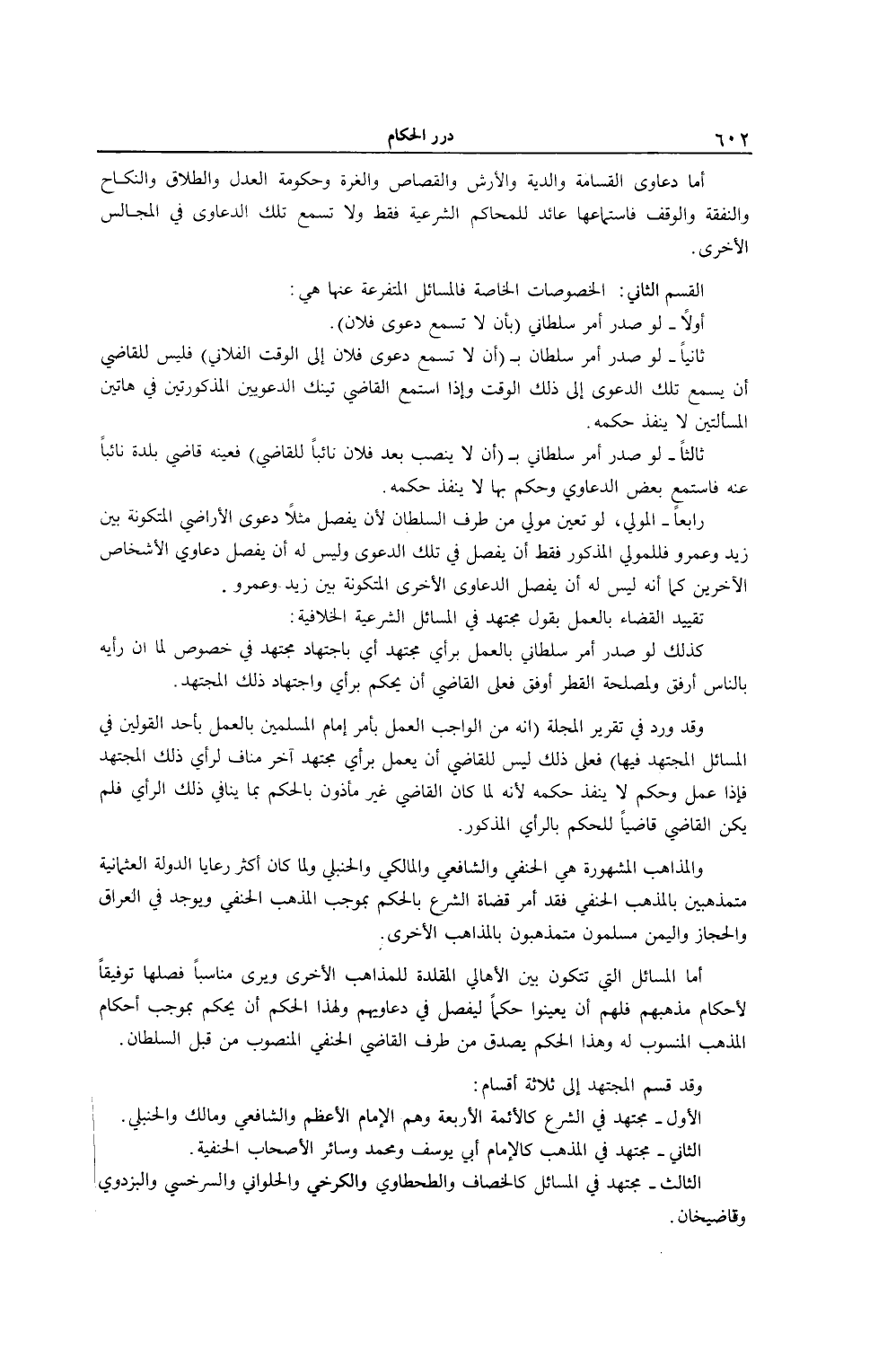 أَمَّا دَعَاوَى الْقَسَامَةِ وَالدِّيَةِ وَالْأَرْشِ وَالْقِصَاصِ وَالْغُرَّةِ وَحُكُومَةِ الْعَدْلِ وَالطَّلَاقِ وَالنِّكَاحِ وَالنَّفَقَةِ وَالْوَقْفِ فَاسْتِمَاعُهَا عَائِدٌ لِلْمَحَاكِمِ الشَّرْعِيَّةِ فَقَطْ وَلَا تُسْمَعُ تِلْكَ الدَّعَاوَى فِي الْمَجَالِسِ الْأُخْرَى الْقِسْمُ الثَّانِي: الْخُصُوصَاتُ الْخَاصَّةُ فَالْمَسَائِلُ الْمُتَفَرِّعَةُ عَنْهَا هِيَ: أَوَّلًا - لَوْ صَدَرَ أَمْرٌ سُلْطَانِيٌّ (بِأَنْ لَا تُسْمَعَ دَعْوَى فُلَانٍ) . ثَانِيًا - لَوْ صَدَرَ أَمْرُ سُلْطَانٍ ب (أَنْ لَا تُسْمَعَ دَعْوَى فُلَانٍ إلَى الْوَقْتِ الْفُلَانِيِّ) فَلَيْسَ لِلْقَاضِي أَنْ يَسْمَعَ تِلْكَ الدَّعْوَى إلَى ذَلِكَ الْوَقْتِ وَإِذَا اسْتَمَعَ الْقَاضِي تَيْنِكَ الدَّعْوَتَيْنِ الْمَذْكُورَتَيْنِ فِي هَاتَيْنِ الْمَسْأَلَتَيْنِ لَا يَنْفُذُ حُكْمُهُ. ثَالِثًا - لَوْ صَدَرَ أَمْرٌ سُلْطَانِيٌّ ب (أَنْ لَا يُنَصَّبَ بَعْدَ فُلَانٍ نَائِبًا لِلْقَاضِي) فَعَيَّنَهُ قَاضِي بَلْدَةٍ نَائِبًا عَنْهُ فَاسْتَمَعَ بَعْضَ الدَّعَاوَى وَحَكَمَ بِهَا لَا يَنْفُذُ حُكْمُهُ. رَابِعًا - الْمَوْلَى، لَوْ تَعَيَّنَ مَوْلًى مِنْ طَرَفِ السُّلْطَانِ لَأَنْ يَفْصِلَ مَثَلًا دَعْوَى الْأَرَاضِي الْمُتَكَوِّنَةِ بَيْنَ زَيْدٍ وَعَمْرٍو فَلِلْمَوْلَى الْمَذْكُورِ فَقَطْ أَنْ يَفْصِلَ فِي تِلْكَ الدَّعْوَى وَلَيْسَ لَهُ أَنْ يَفْصِلَ دَعَاوَى الْأَشْخَاصِ الْآخَرِينَ كَمَا أَنَّهُ لَيْسَ لَهُ أَنْ يَفْصِلَ الدَّعَاوَى الْأُخْرَى الْمُتَكَوِّنَةَ بَيْنَ زَيْدٍ وَعَمْرٍو.