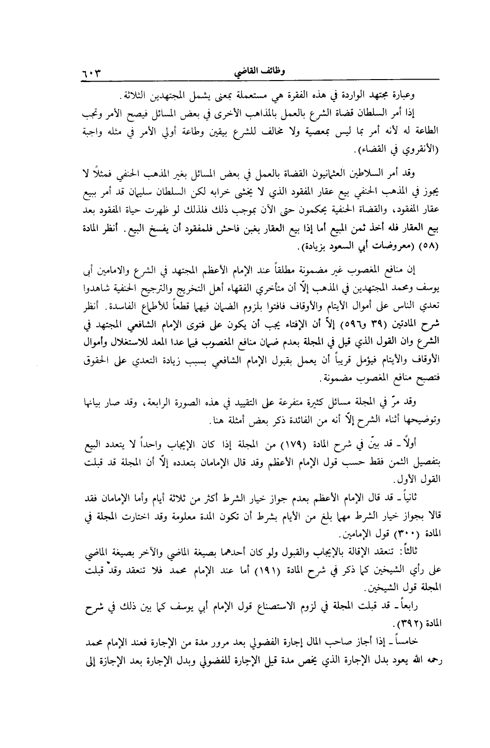 وَعِبَارَةُ مُجْتَهِدٍ الْوَارِدَةُ فِي هَذِهِ الْفِقْرَةِ هِيَ مُسْتَعْمَلَةٌ بِمَعْنًى يَشْمَلُ الْمُجْتَهِدِينَ الثَّلَاثَةَ. إذَا أَمَرَ السُّلْطَانُ قُضَاةَ الشَّرْعِ بِالْعَمَلِ بِالْمَذَاهِبِ الْأُخْرَى فِي بَعْضِ الْمَسَائِلِ فَيَصِحُّ الْأَمْرُ وَتَجِبُ الطَّاعَةُ لَهُ لِأَنَّهُ أَمْرٌ بِمَا لَيْسَ بِمَعْصِيَةٍ وَلَا مُخَالِفٌ لِلشَّرْعِ بِيَقِينٍ. وَطَاعَةُ أُولِي الْأَمْرِ فِي مِثْلِهِ وَاجِبَةٌ (الْأَنْقِرْوِيُّ فِي الْقَضَاءِ) . وَقَدْ أَمَرَ السَّلَاطِينُ الْعُثْمَانِيُّونَ الْقُضَاةَ بِالْعَمَلِ فِي بَعْضِ الْمَسَائِلِ بِغَيْرِ الْمَذْهَبِ الْحَنَفِيِّ فَمَثَلًا لَا يَجُوزُ فِي الْمَذْهَبِ الْحَنَفِيِّ بَيْعُ عَقَارِ الْمَفْقُودِ الَّذِي لَا يُخْشَى خَرَابُهُ لَكِنَّ السُّلْطَانَ سُلَيْمَانَ قَدْ أَمَرَ بِبَيْعِ عَقَارِ الْمَفْقُودِ، وَالْقُضَاةُ الْحَنَفِيَّةُ يَحْكُمُونَ حَتَّى الْآنَ بِمُوجَبِ ذَلِكَ فَلِذَلِكَ لَوْ ظَهَرَتْ حَيَاةُ الْمَفْقُودِ بَعْدَ بَيْعِ الْعَقَارِ فَلَهُ أَخْذُ ثَمَنِ الْمَبِيعِ أَمَّا إذَا بِيعَ الْعَقَارُ بِغَبْنٍ فَاحِشٍ فَلِمَفْقُودٍ أَنْ يَفْسَخَ الْبَيْعَ. اُنْظُرْ الْمَادَّةَ (58) (مَعْرُوضَاتُ أَبِي السُّعُودِ بِزِيَادَةٍ) . إنَّ مَنَافِعَ الْمَغْصُوبِ غَيْرُ مَضْمُونَةٍ مُطْلَقًا عِنْدَ الْإِمَامِ الْأَعْظَمِ الْمُجْتَهِدِ فِي الشَّرْعِ وَالْإِمَامَيْنِ أَبِي يُوسُفَ وَمُحَمَّدٍ الْمُجْتَهِدَيْنِ فِي الْمَذْهَبِ إلَّا أَنَّ مُتَأَخِّرِي الْفُقَهَاءِ أَهْلُ التَّخْرِيجِ وَالتَّرْجِيحِ الْحَنَفِيَّةِ شَاهَدُوا تَعَدِّيَ النَّاسِ عَلَى أَمْوَالِ الْأَيْتَامِ وَالْأَوْقَافِ فَافْتُوَا بِلُزُومِ الضَّمَانِ فِيهِمَا قَطْعًا لِلْأَطْمَاعِ الْفَاسِدَةِ. اُنْظُرْ شَرْحَ الْمَادَّتَيْنِ (39 و 596) إلَّا أَنَّ الْإِفْتَاءَ يَجِبُ أَنْ يَكُونَ عَلَى فَتْوَى الْإِمَامِ الشَّافِعِيِّ الْمُجْتَهِدِ فِي الشَّرْعِ وَإِنَّ الْقَوْلَ الَّذِي قِيلَ فِي الْمَجَلَّةِ بِعَدَمِ ضَمَانِ مَنَافِعِ الْمَغْصُوبِ فِيمَا عَدَا الْمُعَدِّ لِلِاسْتِغْلَالِ وَأَمْوَالِ الْأَوْقَافِ وَالْأَيْتَامِ فَيُؤْمَلُ قَرِيبًا أَنْ يُعْمَلَ بِقَوْلِ الْإِمَامِ الشَّافِعِيِّ بِسَبَبِ زِيَادَةِ التَّعَدِّي عَلَى الْحُقُوقِ فَتُصْبِحُ مَنَافِعُ الْمَغْصُوبِ مَضْمُونَةً.