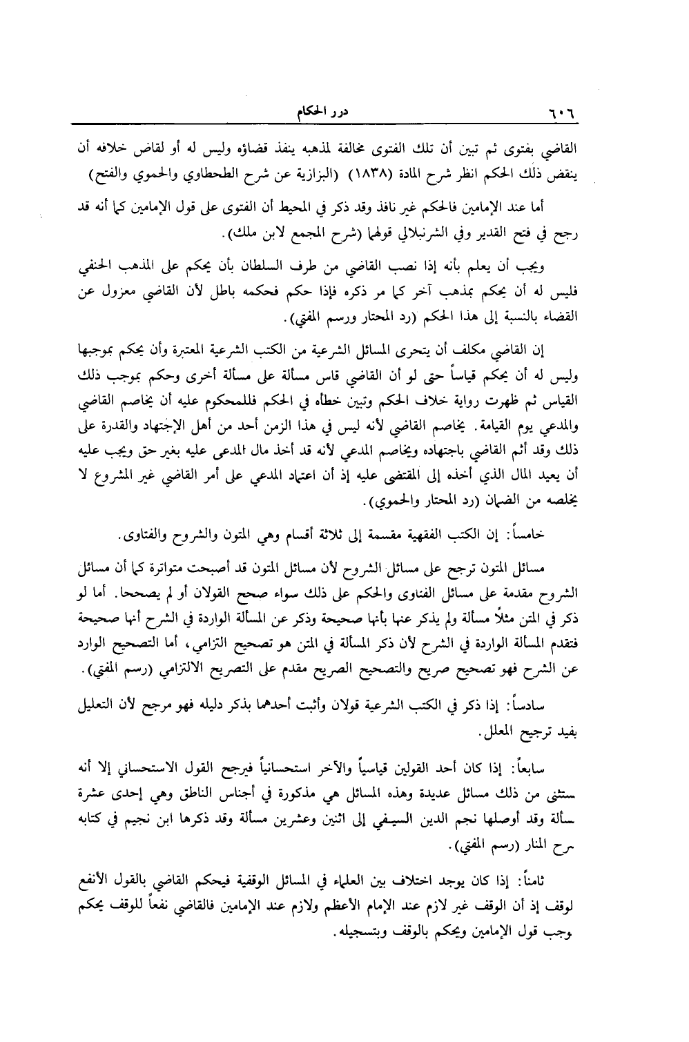 خَامِسًا: إنَّ الْكُتُبَ الْفِقْهِيَّةَ مُقَسَّمَةٌ إلَى ثَلَاثَةِ أَقْسَامٍ وَهِيَ الْمُتُونُ وَالشُّرُوحُ وَالْفَتَاوَى. مَسَائِلُ الْمُتُونِ تُرَجَّحُ عَلَى مَسَائِلِ الشُّرُوحِ لِأَنَّ مَسَائِلَ الْمُتُونِ قَدْ أَصْبَحَتْ مُتَوَاتِرَةً كَمَا أَنَّ مَسَائِلَ الشُّرُوحِ مُقَدَّمَةٌ عَلَى مَسَائِلِ الْفَتَاوَى. وَالْحُكْمُ عَلَى ذَلِكَ سَوَاءٌ صُحِّحَ الْقَوْلَانِ أَوْ لَمْ يُصَحَّحَا. أَمَّا لَوْ ذَكَرَ فِي الْمَتْنِ مَثَلًا مَسْأَلَةً وَلَمْ يَذْكُرْ عَنْهَا بِأَنَّهَا صَحِيحَةٌ وَذَكَرَ عَنْ الْمَسْأَلَةِ الْوَارِدَةِ فِي الشَّرْحِ أَنَّهَا صَحِيحَةٌ فَتُقَدَّمُ الْمَسْأَلَةُ الْوَارِدَةُ فِي الشَّرْحِ لِأَنَّ ذِكْرَ الْمَسْأَلَةِ فِي الْمَتْنِ هُوَ تَصْحِيحٌ الْتِزَامِيٌّ، أَمَّا التَّصْحِيحُ الْوَارِدُ عَنْ الشَّرْحِ فَهُوَ تَصْحِيحٌ صَرِيحٌ وَالتَّصْحِيحُ الصَّرِيحُ مُقَدَّمٌ عَلَى التَّصْرِيحِ الِالْتِزَامِيِّ (رَسْمُ الْمُفْتِي) . سَادِسًا: إذَا ذُكِرَ فِي الْكُتُبِ الشَّرْعِيَّةِ قَوْلَانِ وَأُثْبِتَ أَحَدُهُمَا بِذِكْرِ دَلِيلِهِ فَهُوَ مُرَجَّحٌ لِأَنَّ التَّعْلِيلَ يُفِيدُ تَرْجِيحَ الْمُعَلَّلِ. سَابِعًا: إذَا كَانَ أَحَدُ الْقَوْلَيْنِ قِيَاسِيًّا وَالْآخَرُ اسْتِحْسَانًا فَيُرَجَّحُ الْقَوْلُ الِاسْتِحْسَانِيُّ إلَّا أَنَّهُ مُسْتَثْنًى مِنْ ذَلِكَ مَسَائِلُ عَدِيدَةٌ وَهَذِهِ الْمَسَائِلُ هِيَ مَذْكُورَةٌ فِي أَجْنَاسِ النَّاطِقِ وَهِيَ إحْدَى عَشْرَةَ مَسْأَلَةً وَقَدْ أَوْصَلَهَا نَجْمُ الدِّينِ النَّسَفِيّ إلَى اثْنَيْنِ وَعِشْرِينَ مَسْأَلَةً وَقَدْ ذَكَرَهَا ابْنُ نُجَيْمٍ فِي كِتَابِهِ شَرْحِ الْمَنَارِ (رَسْمُ الْمُفْتِي) . ثَامِنًا: إذَا كَانَ يُوجَدُ اخْتِلَافٌ بَيْنَ الْعُلَمَاءِ فِي الْمَسَائِلِ الْوَقْفِيَّةِ فَيَحْكُمُ الْقَاضِي بِالْقَوْلِ الْأَنْفَعِ لِلْوَقْفِ إذْ أَنَّ الْوَقْفَ غَيْرُ لَازِمٍ عِنْدَ الْإِمَامِ الْأَعْظَمِ وَلَازِمٌ عِنْدَ الْإِمَامَيْنِ فَالْقَاضِي نَفْعًا لِلْوَقْفِ يَحْكُمُ بِمُوجَبِ قَوْلِ الْإِمَامَيْنِ وَيَحْكُمُ بِالْوَقْفِ وَبِتَسْجِيلِهِ.