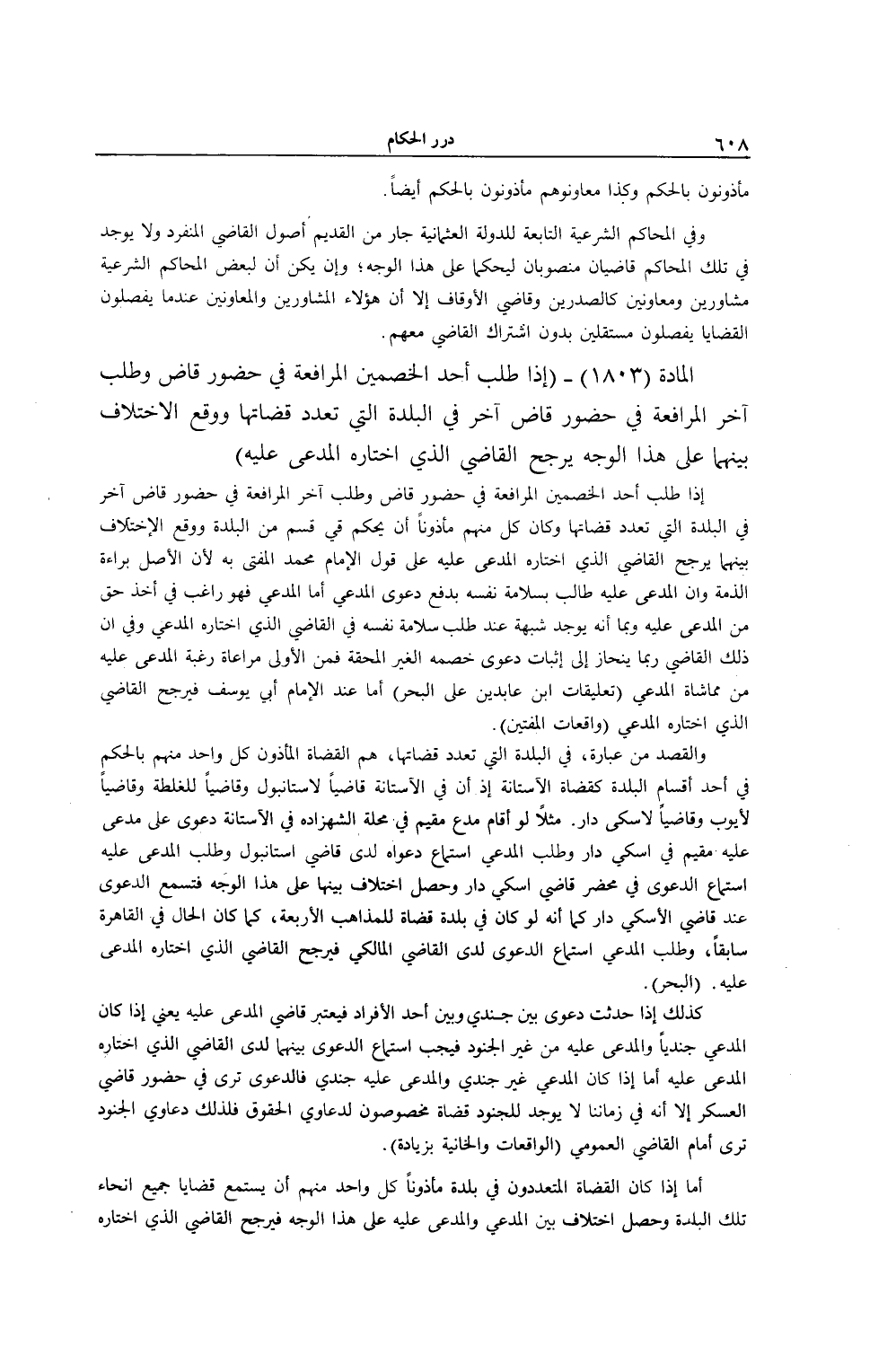 وَالْقَصْدُ مِنْ عِبَارَةِ، فِي الْبَلْدَةِ الَّتِي تَعَدَّدَ قُضَاتُهَا، هُمْ الْقُضَاةُ الْمَأْذُونُ كُلُّ وَاحِدٍ مِنْهُمْ بِالْحُكْمِ فِي أَحَدِ أَقْسَامِ الْبَلْدَةِ كَقُضَاةِ الْآسِتَانَة إذْ أَنَّ فِي الْآسِتَانَة قَاضِيًا لِإِسْتَانْبُولَ وَقَاضِيًا لِلْغَلْطَةِ وَقَاضِيًا لِأَيُّوبَ وَقَاضِيًا لأسكي دَار. مَثَلًا لَوْ أَقَامَ مُدَّعٍ مُقِيمٌ فِي مَحَلَّةِ الشهزاده فِي الْآسِتَانَة دَعْوَى عَلَى مُدَّعًى عَلَيْهِ مُقِيمٍ فِي أسكي دَار وَطَلَبَ الْمُدَّعِي اسْتِمَاعَ دَعْوَاهُ لَدَى قَاضِي إسْتَانْبُولَ وَطَلَبَ الْمُدَّعَى عَلَيْهِ اسْتِمَاعَ الدَّعْوَى فِي مَحْضَرِ قَاضِي أسكي دَار وَحَصَلَ اخْتِلَافٌ بَيْنَهُمَا عَلَى هَذَا الْوَجْهِ فَتُسْمَعُ الدَّعْوَى عِنْدَ قَاضِي الأسكي دَار كَمَا أَنَّهُ لَوْ كَانَ فِي بَلْدَةٍ قُضَاةٌ لِلْمَذَاهِبِ الْأَرْبَعَةِ، كَمَا كَانَ الْحَالُ فِي الْقَاهِرَةِ سَابِقًا، وَطَلَبَ الْمُدَّعِي اسْتِمَاعَ الدَّعْوَى لَدَى الْقَاضِي الْمَالِكِيِّ فَيُرَجَّحُ الْقَاضِي الَّذِي اخْتَارَهُ الْمُدَّعَى عَلَيْهِ. (الْبَحْرُ) . كَذَلِكَ إذَا حَدَثَتْ دَعْوَى بَيْنَ جُنْدِيٍّ وَبَيْنَ أَحَدِ الْأَفْرَادِ فَيُعْتَبَرُ قَاضِي الْمُدَّعَى عَلَيْهِ يَعْنِي إذَا كَانَ الْمُدَّعِي جُنْدِيًّا وَالْمُدَّعَى عَلَيْهِ مِنْ غَيْرِ الْجُنُودِ فَيَجِبُ اسْتِمَاعُ الدَّعْوَى بَيْنَهُمَا لَدَى الْقَاضِي الَّذِي اخْتَارَهُ الْمُدَّعَى عَلَيْهِ أَمَّا إذَا كَانَ الْمُدَّعِي غَيْرَ جُنْدِيٍّ وَالْمُدَّعَى عَلَيْهِ جُنْدِيٌّ فَالدَّعْوَى تُرَى فِي حُضُورِ قَاضِي الْعَسْكَرِ إلَّا أَنَّهُ فِي زَمَانِنَا لَا يُوجَدُ لِلْجُنُودِ قُضَاةٌ مَخْصُوصُونَ لِدَعَاوَى الْحُقُوقِ فَلِذَلِكَ دَعَاوَى الْجُنُودِ تُرَى أَمَامَ الْقَاضِي الْعُمُومِيِّ (الْوَاقِعَاتُ وَالْخَانِيَّةُ بِزِيَادَةٍ) . أَمَّا إذَا كَانَ الْقُضَاةُ الْمُتَعَدِّدُونَ فِي بَلْدَةٍ مَأْذُونًا كُلُّ وَاحِدٍ مِنْهُمْ أَنْ يَسْتَمِعَ قَضَايَا جَمِيعِ أَنْحَاءِ تِلْكَ الْبَلْدَةِ وَحَصَلَ اخْتِلَافٌ بَيْنَ الْمُدَّعِي وَالْمُدَّعَى عَلَيْهِ عَلَى هَذَا الْوَجْهِ فَيُرَجَّحُ الْقَاضِي الَّذِي اخْتَارَهُ