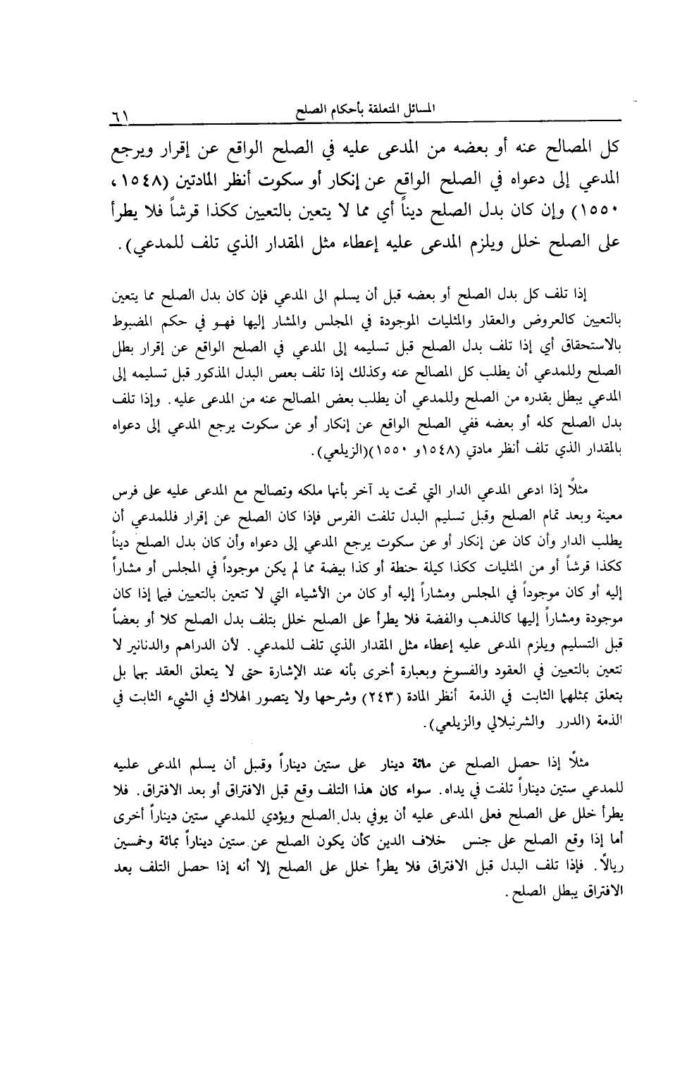 مَثَلًا إذَا ادَّعَى الْمُدَّعِي الدَّارَ الَّتِي تَحْتَ يَدِ آخَرَ بِأَنَّهَا مِلْكُهُ وَتَصَالَحَ مَعَ الْمُدَّعَى عَلَيْهِ عَلَى فَرَسٍ مُعَيَّنَةٍ وَبَعْدَ تَمَامِ الصُّلْحِ وَقَبْلَ تَسْلِيمِ الْبَدَلِ تَلِفَتْ الْفَرَسُ فَإِذَا كَانَ الصُّلْحُ عَنْ إقْرَارٍ فَلِلْمُدَّعِي أَنْ يَطْلُبَ الدَّارَ، وَإِنْ كَانَ عَنْ إنْكَارٍ، أَوْ عَنْ سُكُوتٍ يَرْجِعُ الْمُدَّعِي إلَى دَعْوَاهُ، وَإِنْ كَانَ بَدَلُ الصُّلْحِ دَيْنًا كَكَذَا قِرْشًا، أَوْ مِنْ الْمِثْلِيَّاتِ كَكَذَا كَيْلَةً حِنْطَةً، أَوْ كَذَا بَيْضَةً مَا لَمْ يَكُنْ مَوْجُودًا فِي الْمَجْلِسِ أَوْ مُشَارًا إلَيْهِ، أَوْ كَانَ مَوْجُودًا فِي الْمَجْلِسِ، وَمُشَارًا إلَيْهِ، أَوْ كَانَ مِنْ الْأَشْيَاءِ الَّتِي لَا تَتَعَيَّنُ بِالتَّعْيِينِ فِيمَا إذَا كَانَتْ مَوْجُودَةً وَمُشَارًا إلَيْهَا كَالذَّهَبِ وَالْفِضَّةِ فَلَا يَطْرَأُ عَلَى الصُّلْحِ خَلَلٌ بِتَلَفِ بَدَلٍ الصُّلْحُ كُلًّا أَوْ بَعْضًا قَبْلَ التَّسْلِيمِ، وَيَلْزَمُ الْمُدَّعَى عَلَيْهِ إعْطَاءُ مِثْلِ الْمِقْدَارِ الَّذِي تَلِفَ لِلْمُدَّعِي؛ لِأَنَّ الدَّرَاهِمَ وَالدَّنَانِيرَ لَا تَتَعَيَّنُ بِالتَّعْيِينِ فِي الْعُقُودِ وَالْفُسُوخِ، وَبِعِبَارَةٍ أُخْرَى بِأَنَّهُ عِنْدَ الْإِشَارَةِ حَتَّى لَا يَتَعَلَّقَ الْعَقْدُ بِهِمَا بَلْ يَتَعَلَّقُ بِمِثْلِهِمَا الثَّابِتِ فِي الذِّمَّةِ اُنْظُرْ الْمَادَّةَ (243) وَشَرْحَهَا وَلَا يُتَصَوَّرُ الْهَلَاكُ فِي الشَّيْءِ الثَّابِتِ فِي الذِّمَّةِ (الدُّرَرُ والشُّرُنْبُلاليُّ وَالزَّيْلَعِيّ) .