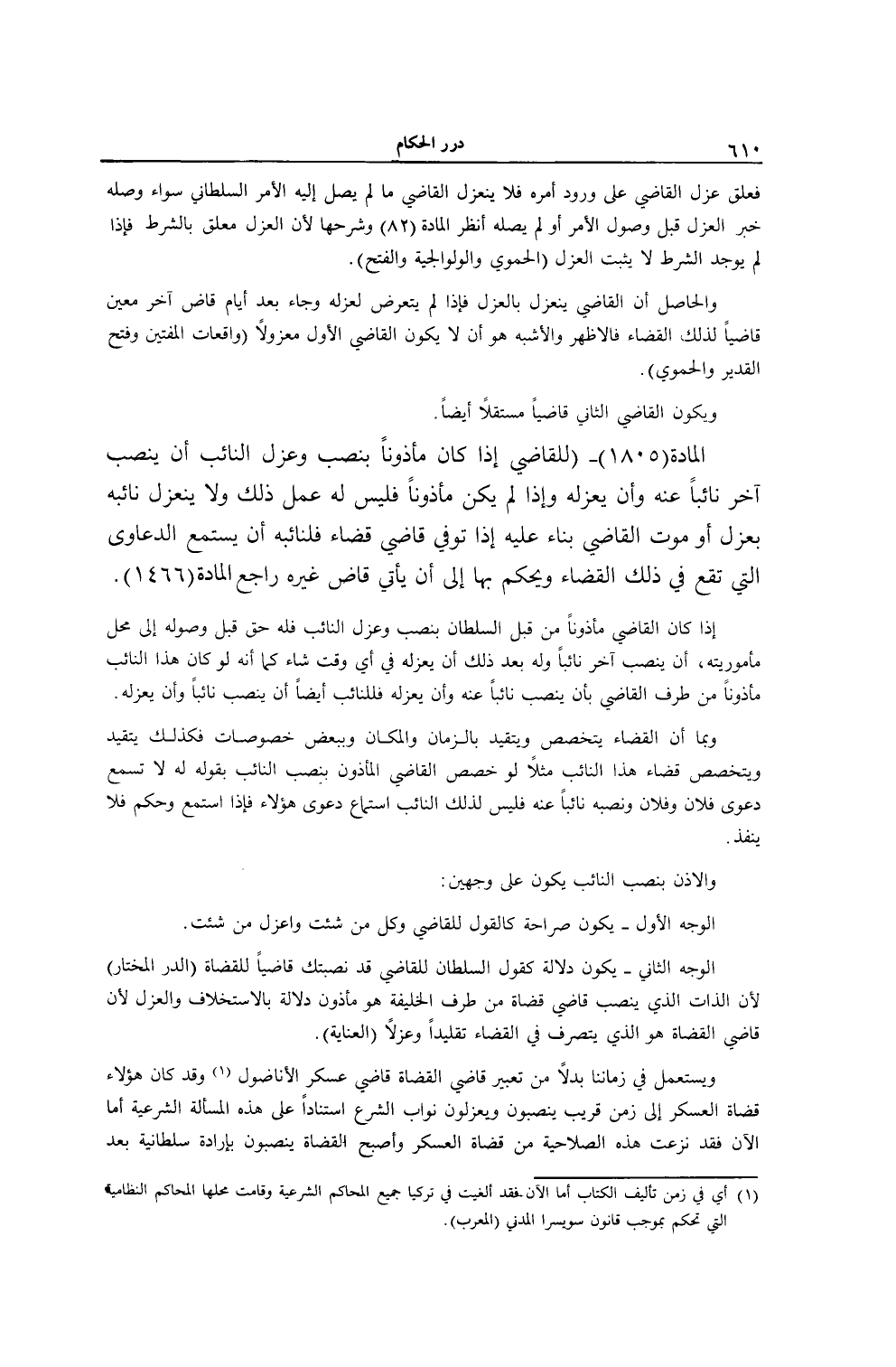 فَعَلَّقَ عَزْلَ الْقَاضِي عَلَى وُرُودِ أَمْرِهِ فَلَا يَنْعَزِلُ الْقَاضِي مَا لَمْ يَصِلْ إلَيْهِ الْأَمْرُ السُّلْطَانِيُّ سَوَاءٌ وَصَلَهُ خَبَرُ الْعَزْلِ قَبْلَ وُصُولِ الْأَمْرِ أَوْ لَمْ يَصِلْهُ اُنْظُرْ الْمَادَّةَ (82) وَشَرْحَهَا لِأَنَّ الْعَزْلَ مُعَلَّقٌ بِالشَّرْطِ فَإِذَا لَمْ يُوجَدْ الشَّرْطُ لَا يَثْبُتُ الْعَزْلُ (الْحَمَوِيُّ والولوالجية وَالْفَتْحُ) .