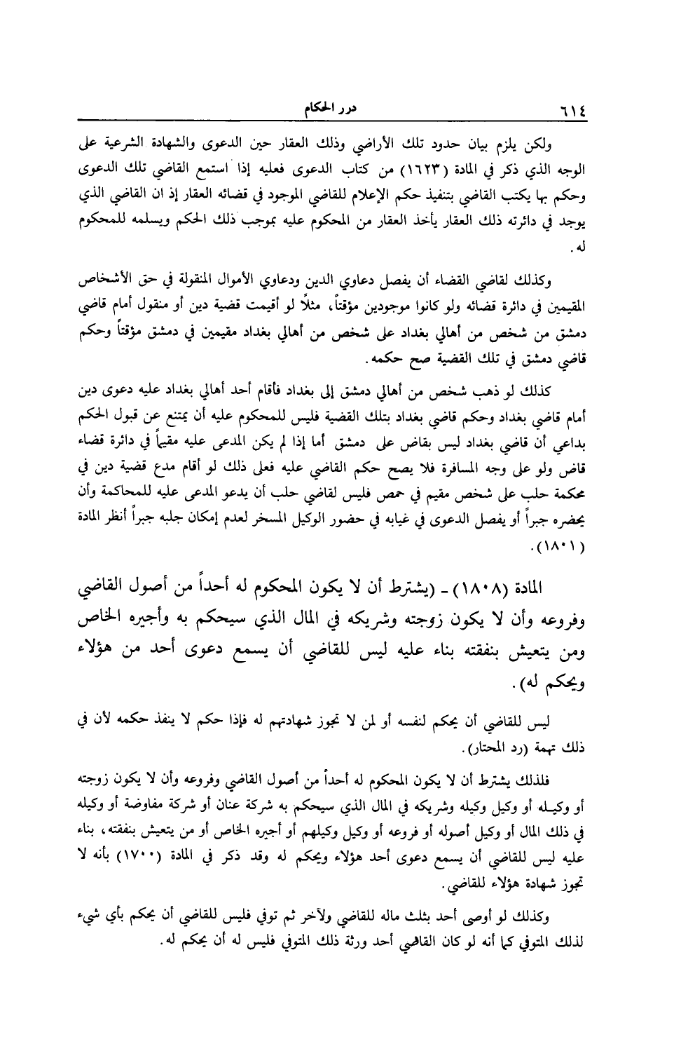 وَلَكِنْ يَلْزَمُ بَيَانُ حُدُودِ تِلْكَ الْأَرَاضِي وَذَلِكَ الْعَقَارُ حِينَ الدَّعْوَى وَالشَّهَادَةِ الشَّرْعِيَّةِ عَلَى الْوَجْهِ الَّذِي ذُكِرَ فِي الْمَادَّةِ (1623) مِنْ كِتَابِ الدَّعْوَى فَعَلَيْهِ إذَا اسْتَمَعَ الْقَاضِي تِلْكَ الدَّعْوَى وَحَكَمَ بِهَا يَكْتُبُ الْقَاضِي بِتَنْفِيذِ حُكْمِ الْإِعْلَامِ لِلْقَاضِي الْمَوْجُودُ فِي قَضَائِهِ الْعَقَارُ إذْ أَنَّ الْقَاضِيَ الَّذِي يُوجَدُ فِي دَائِرَتِهِ ذَلِكَ الْعَقَارُ يَأْخُذُ الْعَقَارَ مِنْ الْمَحْكُومِ عَلَيْهِ بِمُوجَبِ ذَلِكَ الْحُكْمِ وَيُسَلِّمُهُ لِلْمَحْكُومِ لَهُ وَكَذَلِكَ لِقَاضِي الْقَضَاءِ أَنْ يَفْصِلَ دَعَاوَى الدَّيْنِ وَدَعَاوَى الْأَمْوَالِ الْمَنْقُولَةِ فِي حَقِّ الْأَشْخَاصِ الْمُقِيمِينَ فِي دَائِرَةِ قَضَائِهِ وَلَوْ كَانُوا مَوْجُودِينَ مُؤَقَّتًا، مَثَلًا لَوْ أُقِيمَتْ قَضِيَّةُ دَيْنٍ أَوْ مَنْقُولٍ أَمَامَ قَاضِي دِمَشْقَ مِنْ شَخْصٍ مِنْ أَهَالِيِ بَغْدَادَ عَلَى شَخْصٍ مِنْ أَهَالِيِ بَغْدَادَ مُقِيمِينَ فِي دِمَشْقَ مُؤَقَّتًا وَحَكَمَ قَاضِي دِمِشْقَ فِي تِلْكَ الْقَضِيَّةِ صَحَّ حُكْمُهُ. كَذَلِكَ لَوْ ذَهَبَ شَخْصٌ مِنْ أَهَالِيِ دِمَشْقَ إلَى بَغْدَادَ فَأَقَامَ أَحَدُ أَهَالِي بَغْدَادَ عَلَيْهِ دَعْوَى دَيْنٍ أَمَامَ قَاضِي بَغْدَادَ وَحَكَمَ قَاضِي بَغْدَادَ بِتِلْكَ الْقَضِيَّةِ فَلَيْسَ لِلْمَحْكُومِ عَلَيْهِ أَنْ يَمْتَنِعَ عَنْ قَبُولِ الْحُكْمِ بِدَاعِي أَنَّ قَاضِي بَغْدَادَ لَيْسَ بِقَاضٍ عَلَى دِمَشْقَ أَمَّا إذَا لَمْ يَكُنْ الْمُدَّعَى عَلَيْهِ مُقِيمًا فِي دَائِرَةِ قَضَاءِ قَاضٍ وَلَوْ عَلَى وَجْهِ الْمُسَافَرَةِ فَلَا يَصِحُّ حُكْمُ الْقَاضِي عَلَيْهِ فَعَلَى ذَلِكَ لَوْ أَقَامَ مُدَّعٍ قَضِيَّةَ دَيْنٍ فِي مَحْكَمَةِ حَلَبَ عَلَى شَخْصٍ مُقِيمٍ فِي حِمْصَ فَلَيْسَ لِقَاضِي حَلَبَ أَنْ يَدْعُوَ الْمُدَّعَى عَلَيْهِ لِلْمُحَاكَمَةِ وَأَنْ يُحْضِرَهُ جَبْرًا أَوْ يَفْصِلَ الدَّعْوَى فِي غِيَابِهِ فِي حُضُورِ الْوَكِيلِ الْمُسَخَّرِ لِعَدَمِ إمْكَانِ جَلْبِهِ جَبْرًا اُنْظُرْ الْمَادَّةَ (1801) .