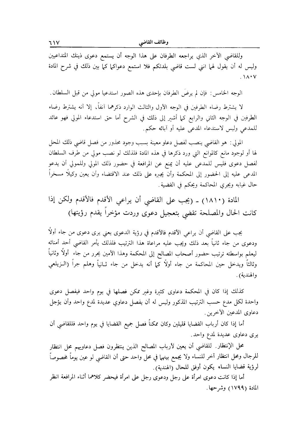كَذَلِكَ إذَا كَانَ فِي الْمَحْكَمَةِ دَعَاوَى كَثِيرَةٌ وَغَيْرُ مُمْكِنٍ فَصْلُهَا فِي يَوْمٍ وَاحِدٍ فَيَفْصِلُ دَعْوَى - وَاحِدَةً - لِكُلِّ مُدَّعٍ حَسَبَ التَّرْتِيبِ الْمَذْكُورِ وَلَيْسَ لَهُ أَنْ يَفْصِلَ دَعَاوَى عَدِيدَةً لِمُدَّعٍ وَاحِدٍ وَأَنْ يُؤَجِّلَ دَعَاوَى الْمُدَّعِينَ الْآخَرِينَ أَمَّا إذَا كَانَ أَرْبَابُ الْقَضَايَا قَلِيلِينَ وَكَانَ مُمْكِنًا فَصْلُ جَمِيعِ الْقَضَايَا فِي يَوْمٍ وَاحِدٍ فَلِلْقَاضِي أَنْ يَرَى دَعَاوَى عَدِيدَةً لِمُدَّعٍ وَاحِدٍ. مَحَلُّ الِانْتِظَارِ لِلْقَاضِي أَنْ يُعَيِّنَ لِأَرْبَابِ الْمَصَالِحِ الَّذِينَ يَنْتَظِرُونَ فَصْلَ دَعَاوِيهِمْ مَحَلَّ انْتِظَارٍ لِلرِّجَالِ وَمَحَلَّ انْتِظَارٍ آخَرَ لِلنِّسَاءِ وَلَا يَجْمَعُ بَيْنَهُمَا فِي مَحَلٍّ وَاحِدٍ حَتَّى إنَّ الْقَاضِيَ لَوْ عَيَّنَ يَوْمًا مَخْصُوصًا لِرُؤْيَةِ قَضَايَا النِّسَاءِ يَكُونُ أَوْفَقَ - لِلْحَالِ (الْهِنْدِيَّةُ) . أَمَّا إذَا كَانَتْ دَعْوَى امْرَأَةٍ عَلَى رَجُلٍ وَدَعْوَى رَجُلٍ عَلَى امْرَأَةٍ فَيَحْضُرُ كِلَاهُمَا أَثْنَاءَ الْمُرَافَعَةِ اُنْظُرْ الْمَادَّةَ (1799) وَشَرْحَهَا.