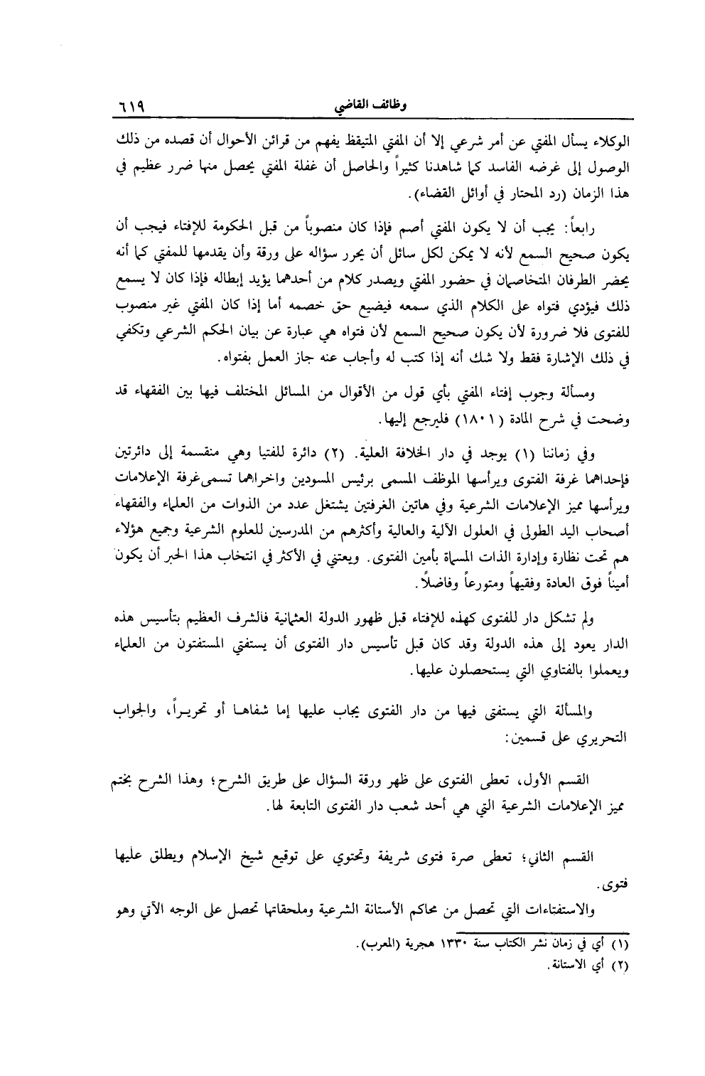 رَابِعًا: يَجِبُ أَنْ لَا يَكُونَ الْمُفْتِي أَصَمَّ فَإِذَا كَانَ مَنْصُوبًا مِنْ قِبَلِ الْحُكُومَةِ لِلْإِفْتَاءِ فَيَجِبُ أَنْ يَكُونَ صَحِيحَ السَّمْعِ لِأَنَّهُ لَا يُمْكِنُ لِكُلِّ سَائِلٍ أَنْ يُحَرِّرَ سُؤَالَهُ عَلَى وَرَقَةٍ وَأَنْ يُقَدِّمَهَا لِلْمُفْتِي كَمَا أَنَّهُ يَحْضُرُ الطَّرَفَانِ الْمُتَخَاصِمَانِ فِي حُضُورِ الْمُفْتِي وَيَصْدُرُ كَلَامٌ مِنْ أَحَدِهِمَا يُؤَيِّدُ إبْطَالَهُ فَإِذَا كَانَ لَا يَسْمَعُ ذَلِكَ فَيُؤَدِّي فَتْوَاهُ عَلَى الْكَلَامِ الَّذِي سَمِعَهُ فَيَضِيعُ حَقُّ خَصْمِهِ أَمَّا إذَا كَانَ الْمُفْتِي غَيْرَ مَنْصُوبٍ لِلْفَتْوَى فَلَا ضَرُورَةَ لَأَنْ يَكُونَ صَحِيحَ السَّمْعِ لِأَنَّ فَتْوَاهُ هِيَ عِبَارَةٌ عَنْ بَيَانِ الْحُكْمِ الشَّرْعِيِّ وَتَكْفِي فِي ذَلِكَ الْإِشَارَةُ فَقَطْ وَلَا شَكَّ أَنَّهُ إذَا كُتِبَ لَهُ وَأَجَابَ عَنْهُ جَازَ الْعَمَلُ بِفَتْوَاهُ. وَمَسْأَلَةُ وُجُوبِ إفْتَاءِ الْمُفْتِي بِأَيِّ قَوْلٍ مِنْ الْأَقْوَالِ مِنْ الْمَسَائِلِ الْمُخْتَلَفِ فِيهَا بَيْنَ الْفُقَهَاءِ قَدْ وَضَحَتْ فِي شَرْحِ الْمَادَّةِ (1801) فَلْيُرْجَعْ إلَيْهَا. وَفِي زَمَانِنَا يُوجَدُ فِي دَارِ الْخِلَافَةِ الْعَلِيَّةِ: دَائِرَةٌ لِلْفُتْيَا وَهِيَ مُنْقَسِمَةٌ إلَى دَائِرَتَيْنِ فَإِحْدَاهُمَا غُرْفَةُ الْفَتْوَى وَيَرْأَسُهَا الْمُوَظَّفُ الْمُسَمَّى بِرَئِيسِ الْمُسْوَدِّينَ وَأُخْرَاهُمَا تُسَمَّى غُرْفَةُ الْإِعْلَامَاتِ وَيَرْأَسُهَا مُمَيِّزُ الْإِعْلَامَاتِ الشَّرْعِيَّةِ وَفِي هَاتَيْنِ الْغُرْفَتَيْنِ يَشْتَغِلُ عَدَدٌ مِنْ الذَّوَاتِ مِنْ الْعُلَمَاءِ وَالْفُقَهَاءِ أَصْحَابِ الْيَدِ الطُّولَى فِي الْعُلُومِ الْآلِيَةِ وَالْعَالِيَةِ وَأَكْثَرُهُمْ مِنْ الْمُدَرِّسِينَ لِلْعُلُومِ الشَّرْعِيَّةِ وَجَمِيعُ هَؤُلَاءِ هُمْ تَحْتَ نِظَارَةِ وَإِدَارَةِ الذَّاتِ الْمُسَمَّاةِ بِأَمِينِ الْفَتْوَى. وَيُعْتَنَى فِي الْأَكْثَرِ فِي انْتِخَابِ هَذَا الْحَبْرِ أَنْ يَكُونَ أَمِينًا فَوْقَ الْعَادَةِ وَفَقِيهًا وَمُتَوَرِّعًا وَفَاضِلًا. وَلَمْ تُشَكَّلْ دَارٌ لِلْفَتْوَى كَهَذِهِ لِلْإِفْتَاءِ قَبْلَ ظُهُورِ الدَّوْلَةِ الْعُثْمَانِيَّةِ فَالشَّرَفُ الْعَظِيمُ بِتَأْسِيسِ هَذِهِ الدَّارِ يَعُودُ إلَى هَذِهِ الدَّوْلَةِ وَقَدْ كَانَ قَبْلَ تَأْسِيسِ دَارِ الْفَتْوَى أَنْ يَسْتَفْتِيَ الْمُسْتَفْتُونَ مِنْ الْعُلَمَاءِ وَيَعْمَلُوا بِالْفَتَاوِي الَّتِي يَسْتَحْصِلُونَ عَلَيْهَا وَالْمَسْأَلَةُ الَّتِي يُسْتَفْتَى فِيهَا مِنْ دَارِ الْفَتْوَى يُجَابُ عَلَيْهَا إمَّا شِفَاهًا أَوْ تَحْرِيرًا، وَالْجَوَابُ التَّحْرِيرِيُّ عَلَى قِسْمَيْنِ: الْقِسْمُ الْأَوَّلُ، تُعْطَى الْفَتْوَى عَلَى ظَهْرِ وَرَقَةِ السُّؤَالِ عَلَى طَرِيقِ الشَّرْحِ.