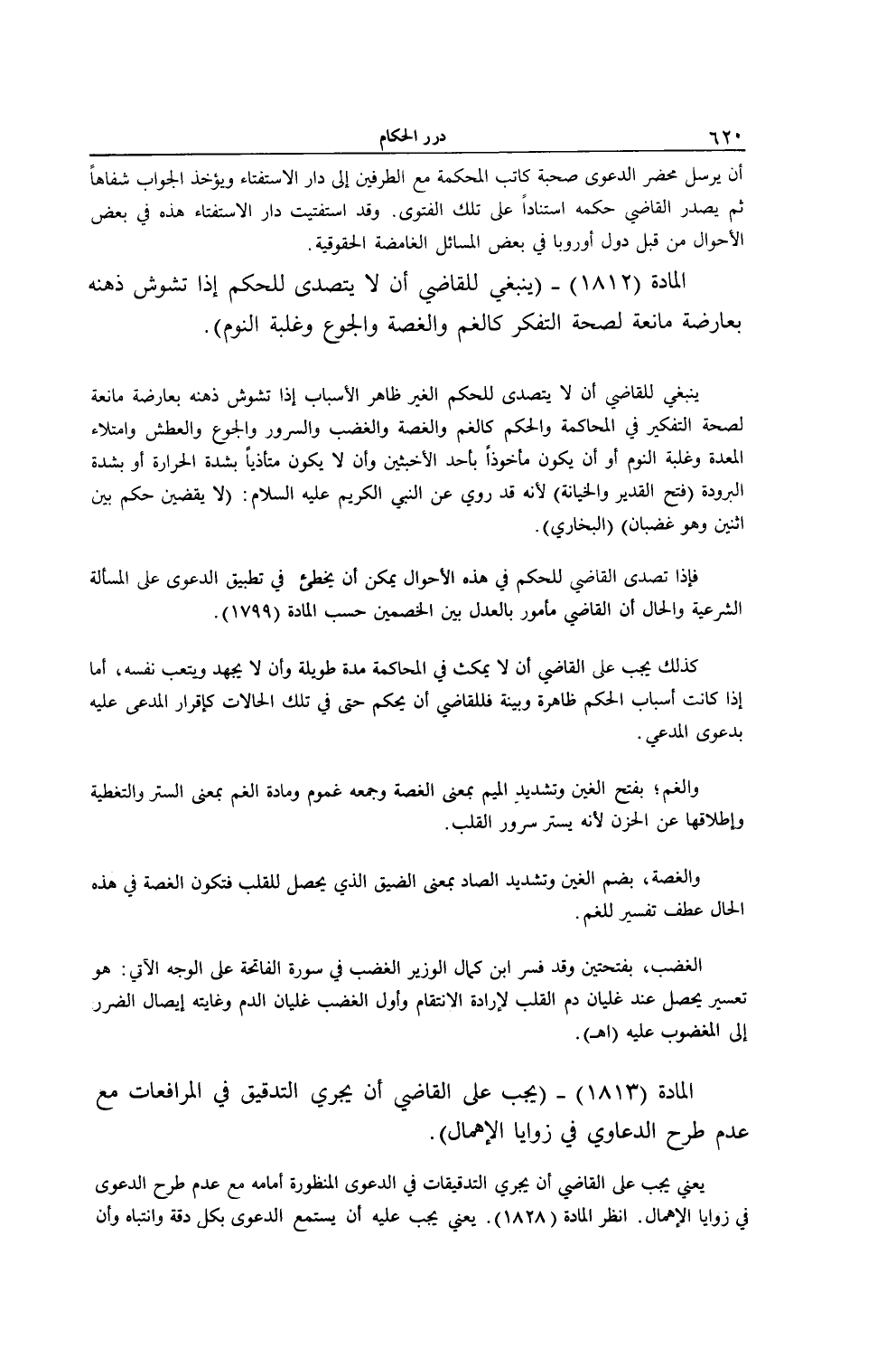 الْمَادَّةُ (1812) - (يَنْبَغِي لِلْقَاضِي أَنْ لَا يَتَصَدَّى لِلْحُكْمِ إذَا تَشَوَّشَ ذِهْنُهُ بِعَارِضَةٍ مَانِعَةٍ لِصِحَّةِ التَّفَكُّرِ كَالْغَمِّ وَالْغُصَّةِ وَالرُّجُوعِ وَغَلَبَةِ النَّوْمِ) . يَنْبَغِي لِلْقَاضِي أَنْ لَا يَتَصَدَّى لِلْحُكْمِ الْغَيْرِ ظَاهِرِ الْأَسْبَابِ إذَا تَشَوَّشَ ذِهْنُهُ بِعَارِضَةٍ مَانِعَةٍ لِصِحَّةِ التَّفْكِيرِ فِي الْمُحَاكَمَةِ وَالْحُكْمِ كَالْغَمِّ وَالْغُصَّةِ وَالْغَضَبِ وَالسُّرُورِ وَالْجُوعِ وَالْعَطَشِ وَامْتِلَاءِ الْمَعِدَةِ وَغَلَبَةِ النَّوْمِ أَوْ أَنْ يَكُونَ مَأْخُوذًا بِأَحَدِ الْأَخْبَثَيْنِ وَأَنْ لَا يَكُونَ مُتَأَذِّيًا بِشِدَّةِ الْحَرَارَةِ أَوْ بِشِدَّةِ الْبُرُودَةِ (فَتْحُ الْقَدِيرِ وَالْخَانِيَّةُ) لِأَنَّهُ قَدْ رُوِيَ عَنْ النَّبِيِّ الْكَرِيمِ - عَلَيْهِ السَّلَامُ -: «لَا يَقْضِيَنَّ حَكَمٌ بَيْنَ اثْنَيْنِ وَهُوَ غَضْبَانُ» (الْبُخَارِيُّ) . فَإِذَا تَصَدَّى الْقَاضِي لِلْحُكْمِ فِي هَذِهِ الْأَحْوَالِ يُمْكِنُ أَنْ يُخْطِئَ فِي تَطْبِيقِ الدَّعْوَى عَلَى الْمَسْأَلَةِ الشَّرْعِيَّةِ وَالْحَالُ أَنَّ الْقَاضِيَ مَأْمُورٌ بِالْعَدْلِ بَيْنَ الْخَصْمَيْنِ حَسَبَ الْمَادَّةِ (1799) . كَذَلِكَ يَجِبُ عَلَى الْقَاضِي أَنْ لَا يَمْكُثَ فِي الْمُحَاكَمَةِ مُدَّةً طَوِيلَةً وَأَنْ لَا يُجْهِدَ وَيُتْعِبَ نَفْسَهُ، أَمَّا إذَا كَانَتْ أَسْبَابُ الْحُكْمِ ظَاهِرَةً وَبَيِّنَةً فَلِلْقَاضِي أَنْ يَحْكُمَ حَتَّى فِي تِلْكَ الْحَالَاتِ كَإِقْرَارِ الْمُدَّعَى عَلَيْهِ بِدَعْوَى الْمُدَّعِي. وَالْغَمُّ؛ بِفَتْحِ الْغَيْنِ وَتَشْدِيدِ الْمِيمِ بِمَعْنَى الْغُصَّةِ وَجَمْعُهُ غُمُومٌ وَمَادَّةُ الْغَمِّ بِمَعْنَى السَّتْرِ وَالتَّغْطِيَةِ وَإِطْلَاقُهَا عَنْ الْحُزْنِ لِأَنَّهُ يَسْتُرُ سُرُورَ الْقَلْبِ.