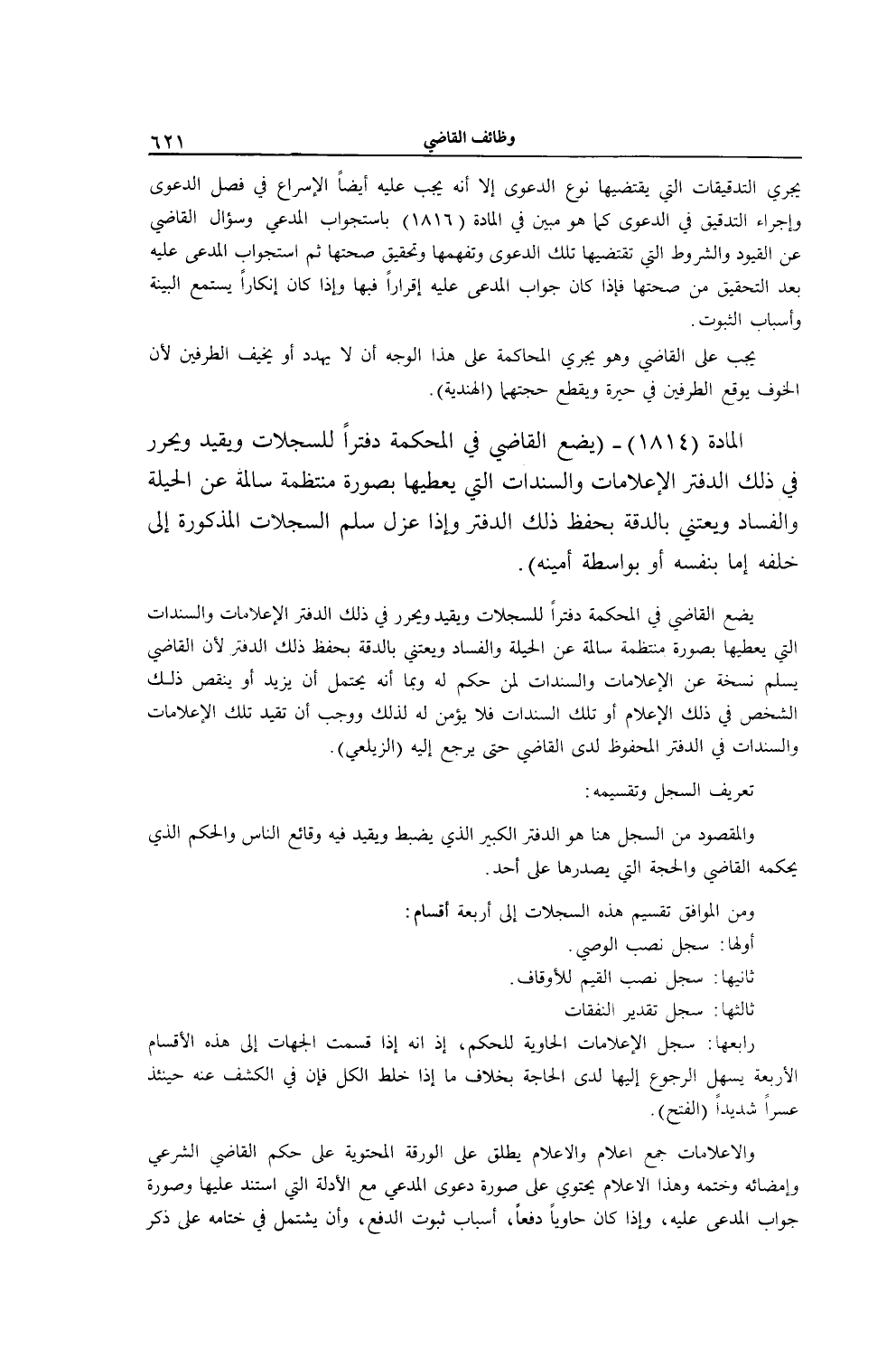 يَضَعُ الْقَاضِي فِي الْمَحْكَمَةِ دَفْتَرًا لِلسِّجِلَّاتِ وَيُقَيِّدُ وَيُحَرِّرُ فِي ذَلِكَ الدَّفْتَرِ الْإِعْلَامَاتِ وَالسَّنَدَاتِ الَّتِي يُعْطِيهَا بِصُورَةٍ مُنْتَظِمَةٍ سَالِمَةٍ عَنْ الْحِيلَةِ وَالْفَسَادِ وَيَعْتَنِي بِالدِّقَّةِ بِحِفْظِ ذَلِكَ الدَّفْتَرِ لِأَنَّ الْقَاضِيَ يُسَلِّمُ نُسْخَةً عَنْ الْإِعْلَامَاتِ وَالسَّنَدَاتِ لِمَنْ حَكَمَ لَهُ وَبِمَا أَنَّهُ يُحْتَمَلُ أَنْ يُزِيدَ أَوْ يُنْقِصَ ذَلِكَ الشَّخْصُ فِي ذَلِكَ الْإِعْلَامِ أَوْ تِلْكَ السَّنَدَاتِ فَلَا يُؤْمَنُ لَهُ لِذَلِكَ وَوَجَبَ أَنْ تُقَيَّدَ تِلْكَ الْإِعْلَامَاتُ وَالسَّنَدَاتُ فِي الدَّفْتَرِ الْمَحْفُوظِ لَدَى الْقَاضِي حَتَّى يَرْجِعَ إلَيْهِ (الزَّيْلَعِيّ) . تَعْرِيفُ السِّجِلِّ وَتَقْسِيمُهُ: وَالْمَقْصُودُ مِنْ السِّجِلِّ هُنَا هُوَ الدَّفْتَرُ الْكَبِيرُ الَّذِي يُضْبَطُ وَيُقَيَّدُ فِيهِ وَقَائِعُ النَّاسِ وَالْحُكْمُ الَّذِي يَحْكُمُهُ الْقَاضِي وَالْحُجَّةُ الَّتِي يُصْدِرُهَا عَلَى أَحَدٍ. وَمِنْ الْمُوَافِقِ تَقْسِيمُ هَذِهِ السِّجِلَّاتِ إلَى أَرْبَعَةِ أَقْسَامٍ: أَوَّلُهَا: سِجِلُّ نَصْبِ الْوَصِيِّ. ثَانِيهَا: سِجِلُّ نَصْبِ الْقَيِّمِ لِلْأَوْقَافِ. ثَالِثُهَا: سِجِلُّ تَقْدِيرِ النَّفَقَاتِ رَابِعُهَا: سِجِلُّ الْإِعْلَامَاتِ الْحَاوِيَةِ لِلْحُكْمِ، إذْ أَنَّهُ إذَا قُسِّمَتْ الْجِهَاتُ إلَى هَذِهِ الْأَقْسَامِ الْأَرْبَعَةِ يَسْهُلُ الرُّجُوعُ إلَيْهَا لَدَى الْحَاجَةِ بِخِلَافِ مَا إذَا خُلِطَ الْكُلُّ فَإِنَّ فِي الْكَشْفِ عَنْهُ حِينَئِذٍ عُسْرًا شَدِيدًا (الْفَتْحُ) . وَالْإِعْلَامَاتُ جَمْعُ إعْلَامٍ وَالْإِعْلَامُ يُطْلَقُ عَلَى الْوَرَقَةِ الْمُحْتَوِيَةِ عَلَى حُكْمِ الْقَاضِي الشَّرْعِيِّ وَإِمْضَائِهِ وَخَتْمِهِ وَهَذَا الْإِعْلَامُ يَحْتَوِي عَلَى صُورَةِ دَعْوَى الْمُدَّعِي مَعَ الْأَدِلَّةِ الَّتِي اسْتَنَدَ عَلَيْهَا وَصُورَةِ جَوَابِ الْمُدَّعَى عَلَيْهِ، وَإِذَا كَانَ حَاوِيًا دَفْعًا، أَسْبَابَ ثُبُوتِ الدَّفْعِ، وَأَنْ يَشْتَمِلَ فِي خِتَامِهِ عَلَى ذِكْرِ