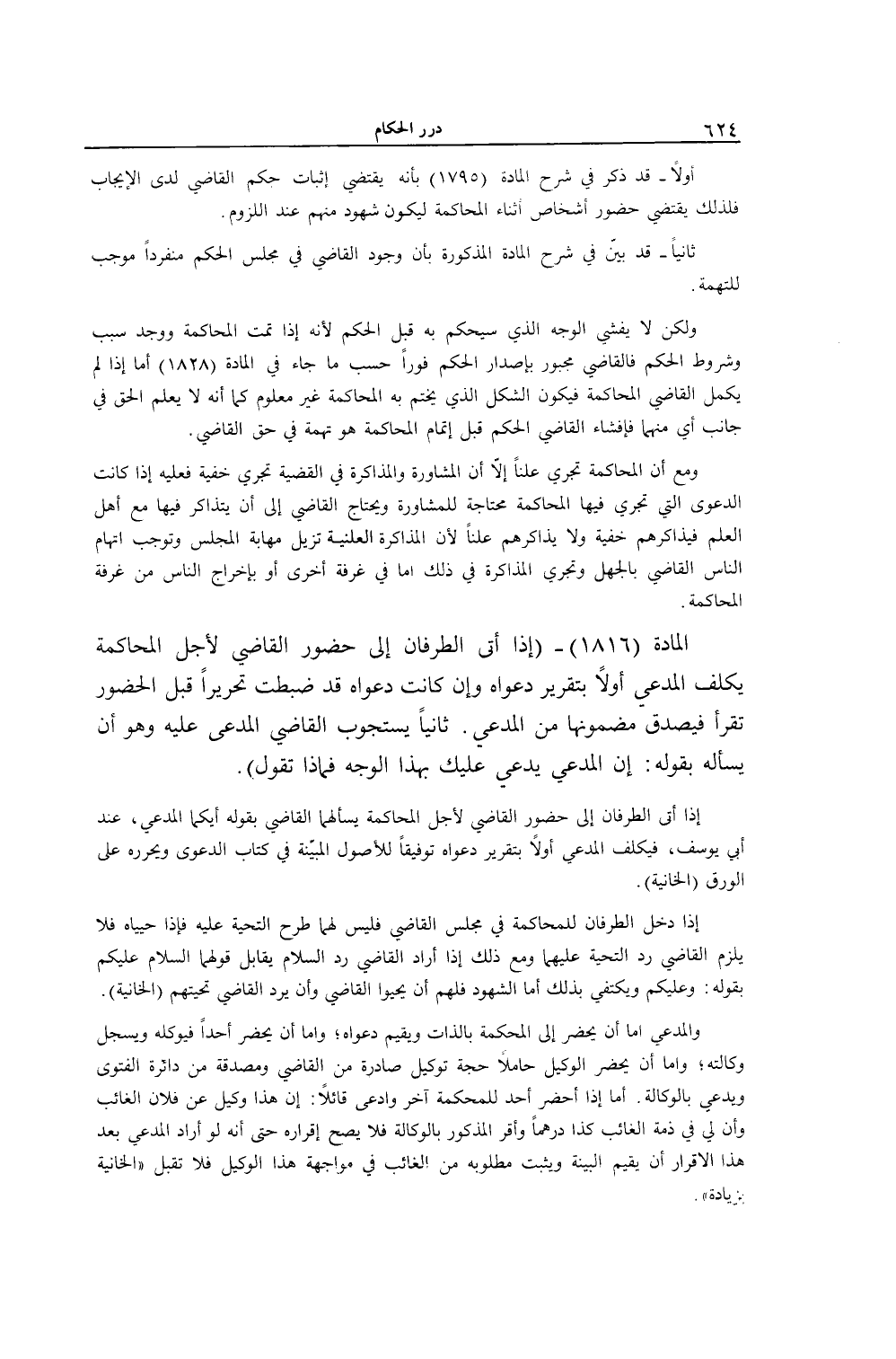 أَوَّلًا - قَدْ ذُكِرَ فِي شَرْحِ الْمَادَّةِ (1795) بِأَنَّهُ يَقْتَضِي إثْبَاتَ حُكْمِ الْقَاضِي لَدَى الْإِيجَابِ فَلِذَلِكَ يَقْتَضِي حُضُورَ أَشْخَاصٍ أَثْنَاءَ الْمُحَاكَمَةِ لِيَكُونَ شُهُودٌ مِنْهُمْ عِنْدَ اللُّزُومِ. ثَانِيًا - قَدْ بَيَّنَ فِي شَرْحِ الْمَادَّةِ الْمَذْكُورَةِ بِأَنَّ وُجُودَ الْقَاضِي فِي مَجْلِسِ الْحُكْمِ مُنْفَرِدًا مُوجِبٌ لِلتُّهْمَةِ. وَلَكِنْ لَا يُفْشِي الْوَجْهَ الَّذِي سَيَحْكُمُ بِهِ قَبْلَ الْحُكْمِ لِأَنَّهُ إذَا تَمَّتْ الْمُحَاكَمَةُ وَوُجِدَ سَبَبُ وَشُرُوطُ الْحُكْمِ فَالْقَاضِي مَجْبُورٌ بِإِصْدَارِ الْحُكْمِ فَوْرًا حَسَبَ مَا جَاءَ فِي الْمَادَّةِ (1828) أَمَّا إذَا لَمْ يُكْمِلْ الْقَاضِي الْمُحَاكَمَةَ فَيَكُونُ الشَّكْلُ الَّذِي يَخْتِمُ بِهِ الْمُحَاكَمَةَ غَيْرَ مَعْلُومٍ كَمَا أَنَّهُ لَا يَعْلَمُ الْحَقَّ فِي جَانِبِ أَيٍّ مِنْهُمَا فَإِفْشَاءُ الْقَاضِي الْحُكْمَ قَبْلَ إتْمَامِ الْمُحَاكَمَةِ هُوَ تُهْمَةٌ فِي حَقِّ الْقَاضِي.