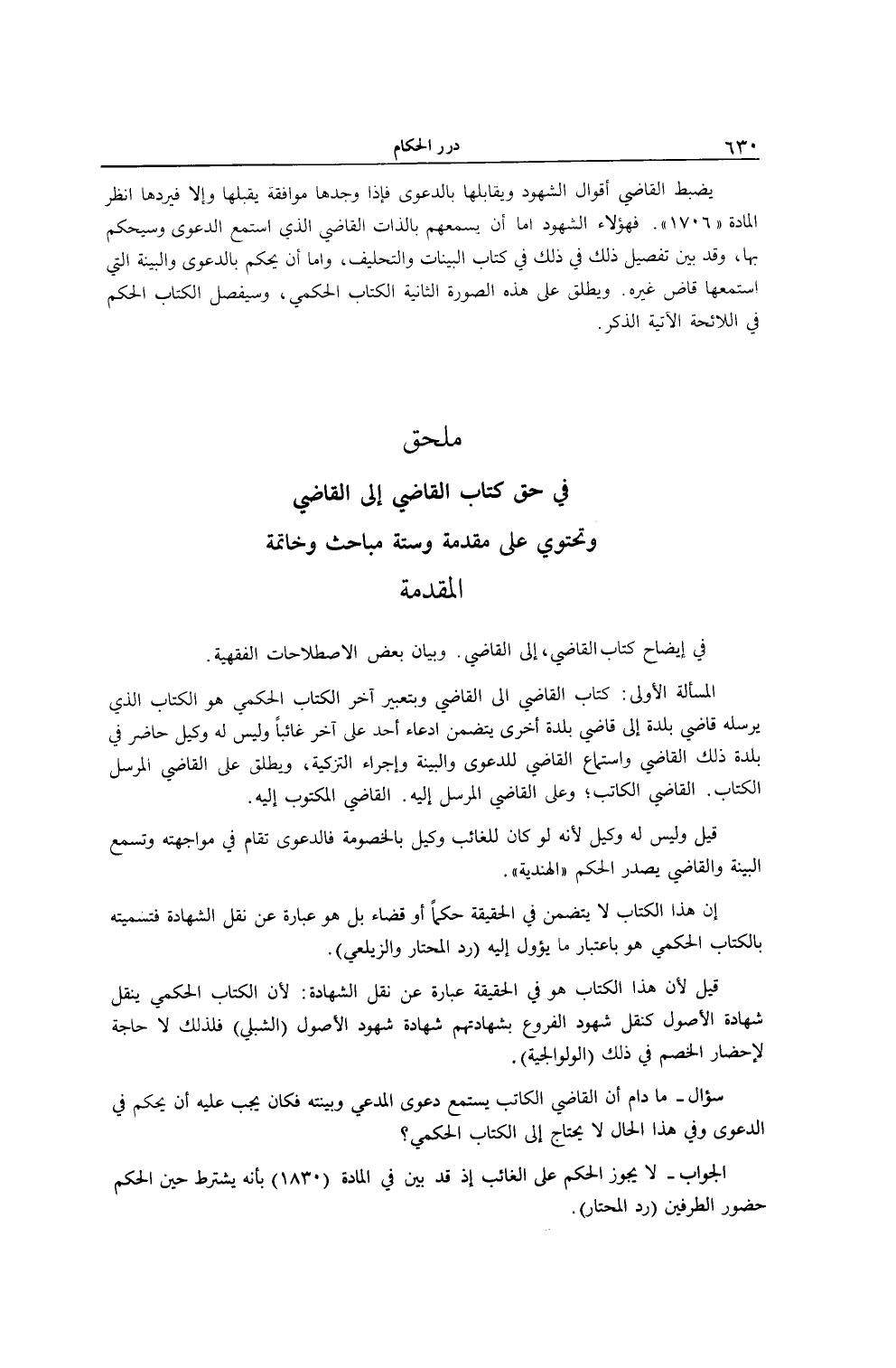 مُلْحَقٌ فِي حَقِّ كِتَابِ الْقَاضِي إلَى الْقَاضِي وَتَحْتَوِي عَلَى مُقَدِّمَةٍ وَسِتَّةِ مَبَاحِثَ وَخَاتِمَةٍ الْمُقَدِّمَةُ فِي إيضَاحِ كِتَابِ الْقَاضِي، إلَى الْقَاضِي. وَبَيَانُ بَعْضِ الِاصْطِلَاحَاتِ الْفِقْهِيَّةِ.