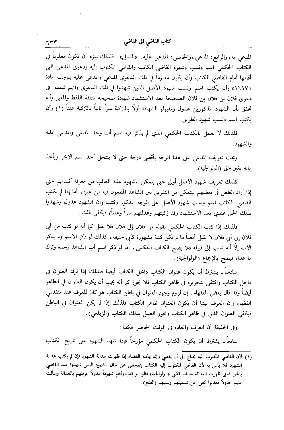 الْمُدَّعِي بِهِ، وَالرَّابِعُ: الْمُدَّعِي، وَالْخَامِسُ: الْمُدَّعَى عَلَيْهِ " الشِّبْلِيُّ ". فَلِذَلِكَ يَلْزَمُ أَنْ يَكُونَ مَعْلُومًا فِي الْكِتَابِ الْحُكْمِيِّ اسْمُ وَنَسَبُ وَشُهْرَةُ الْقَاضِي الْكَاتِبِ وَالْقَاضِي الْمَكْتُوبِ إلَيْهِ وَدَعْوَى الْمُدَّعِي الَّتِي أَقَامَهَا أَمَامَ الْقَاضِي الْكَاتِبِ وَأَنْ يَكُونَ مَعْلُومًا فِي تِلْكَ الدَّعْوَى الْمُدَّعِي وَالْمُدَّعَى عَلَيْهِ بِمُوجَبِ الْمَادَّةِ " 1617 " وَأَنْ يَكْتُبَ اسْمَ وَنَسَبَ شُهُودِ الْأَصْلِ الَّذِينَ شَهِدُوا فِي تِلْكَ الدَّعْوَى وَأَنَّهُمْ شَهِدُوا فِي دَعْوَى فُلَانِ بْنِ فُلَانِ بْنِ فُلَانِ الصَّحِيحَةِ بَعْدَ الِاسْتِشْهَادِ شَهَادَةً صَحِيحَةً مُتَّفِقَةَ اللَّفْظِ وَالْمَعْنَى وَأَنَّهُ تَحَقَّقَ بِأَنَّ الشُّهُودَ الْمَذْكُورِينَ عُدُولٌ وَمَقْبُولُو الشَّهَادَةِ أَوَّلًا بِالتَّزْكِيَةِ سِرًّا ثَانِيًا بِالتَّزْكِيَةِ عَلَنًا وَأَنْ يَكْتُبَ اسْمَ وَنَسَبَ شُهُودِ الطَّرِيقِ.