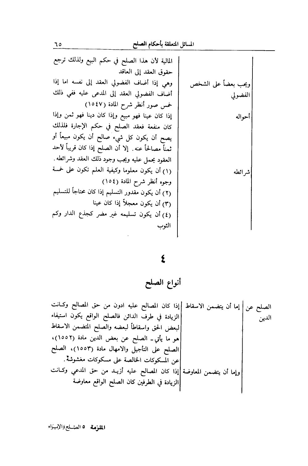 4 - أَنْوَاعُ الصُّلْحِ الصُّلْحُ عَنْ الدَّيْنِ إمَّا أَنْ يَتَضَمَّنَ الْإِسْقَاطَ إذَا كَانَ الْمُصَالَحُ عَلَيْهِ أَدْوَنَ مِنْ حَقِّ الْمُصَالِحِ، وَكَانَتْ الزِّيَادَةُ فِي طَرَفِ الدَّائِنِ فَالصُّلْحُ الْوَاقِعُ يَكُونُ اسْتِيفَاءً لِبَعْضِ الْحَقِّ وَإِسْقَاطًا لِبَعْضِهِ وَالصُّلْحُ الْمُتَضَمِّنُ الْإِسْقَاطَ هُوَ مَا يَأْتِي - الصُّلْحُ عَنْ بَعْضِ الدَّيْنِ مَادَّةُ (1552) ، الصُّلْحُ عَلَى التَّأْجِيلِ وَالْإِمْهَالِ مَادَّةُ (1553) ، الصُّلْحُ عَنْ الْمَسْكُوكَاتِ الْخَالِصَةِ عَلَى مَسْكُوكَاتٍ مَغْشُوشَةٍ.