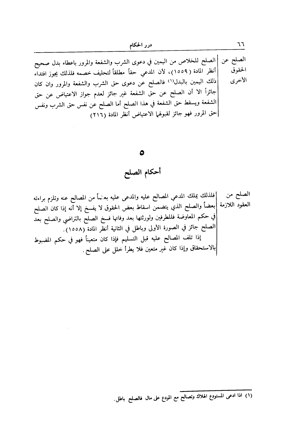 الصُّلْحُ عَنْ الْحُقُوقِ الْأُخْرَى الصُّلْحُ لِلْخَلَاصِ مِنْ الْيَمِينِ فِي دَعْوَى الشُّرْبِ وَالشُّفْعَةِ وَالْمُرُورِ بِإِعْطَاءِ بَدَلٍ صَحِيحٍ اُنْظُرْ الْمَادَّةَ (1559) ، لِأَنَّ لِلْمُدَّعِي حَقًّا مُطْلَقًا لِتَحْلِيفِ خَصْمِهِ فَلِذَلِكَ يَجُوزُ افْتِدَاءُ ذَلِكَ الْيَمِينِ بِالْبَدَلِ فَالصُّلْحُ عَنْ دَعْوَى حَقِّ الشُّرْبِ وَالشُّفْعَةِ وَالْمُرُورِ، وَإِنْ كَانَ جَائِزًا إلَّا أَنَّ الصُّلْحَ عَنْ حَقِّ الشُّفْعَةِ غَيْرُ جَائِزٍ لِعَدَمِ جَوَازِ الِاعْتِيَاضِ عَنْ حَقِّ الشُّفْعَةِ، وَيَسْقُطُ حَقُّ الشُّفْعَةِ فِي هَذَا الصُّلْحِ أَمَّا الصُّلْحُ عَنْ نَفْسِ حَقِّ الشُّرْبِ وَنَفْسِ حَقِّ الْمُرُورِ فَهُوَ جَائِزٌ لِقَبُولِهِمَا الِاعْتِيَاضَ اُنْظُرْ الْمَادَّةَ (216) 5 أَحْكَامُ الصُّلْحِ الصُّلْحُ مِنْ الْعُقُودِ اللَّازِمَةِ فَلِذَلِكَ يَمْلِكُ الْمُدَّعِي الْمُصَالَحَ عَلَيْهِ وَالْمُدَّعَى عَلَيْهِ بَعْضًا مِنْ الْمُصَالَحِ عَنْهُ وَتَلْزَمُ بَرَاءَتُهُ بَعْضًا، وَالصُّلْحُ الَّذِي يَتَضَمَّنُ إسْقَاطَ بَعْضِ الْحُقُوقِ لَا يُفْسَخُ إلَّا أَنَّهُ إذَا كَانَ الصُّلْحُ فِي حُكْمِ الْمُعَاوَضَةِ فَلِلطَّرَفَيْنِ وَلِوَرَثَتِهِمَا بَعْدَ وَفَاتِهِمَا فَسْخُ الصُّلْحِ بِالتَّرَاضِي، وَالصُّلْحُ بَعْدَ الصُّلْحِ جَائِزٌ فِي الصُّورَةِ الْأُولَى، وَبَاطِلٌ فِي الثَّانِيَةِ اُنْظُرْ الْمَادَّةَ (1558) .