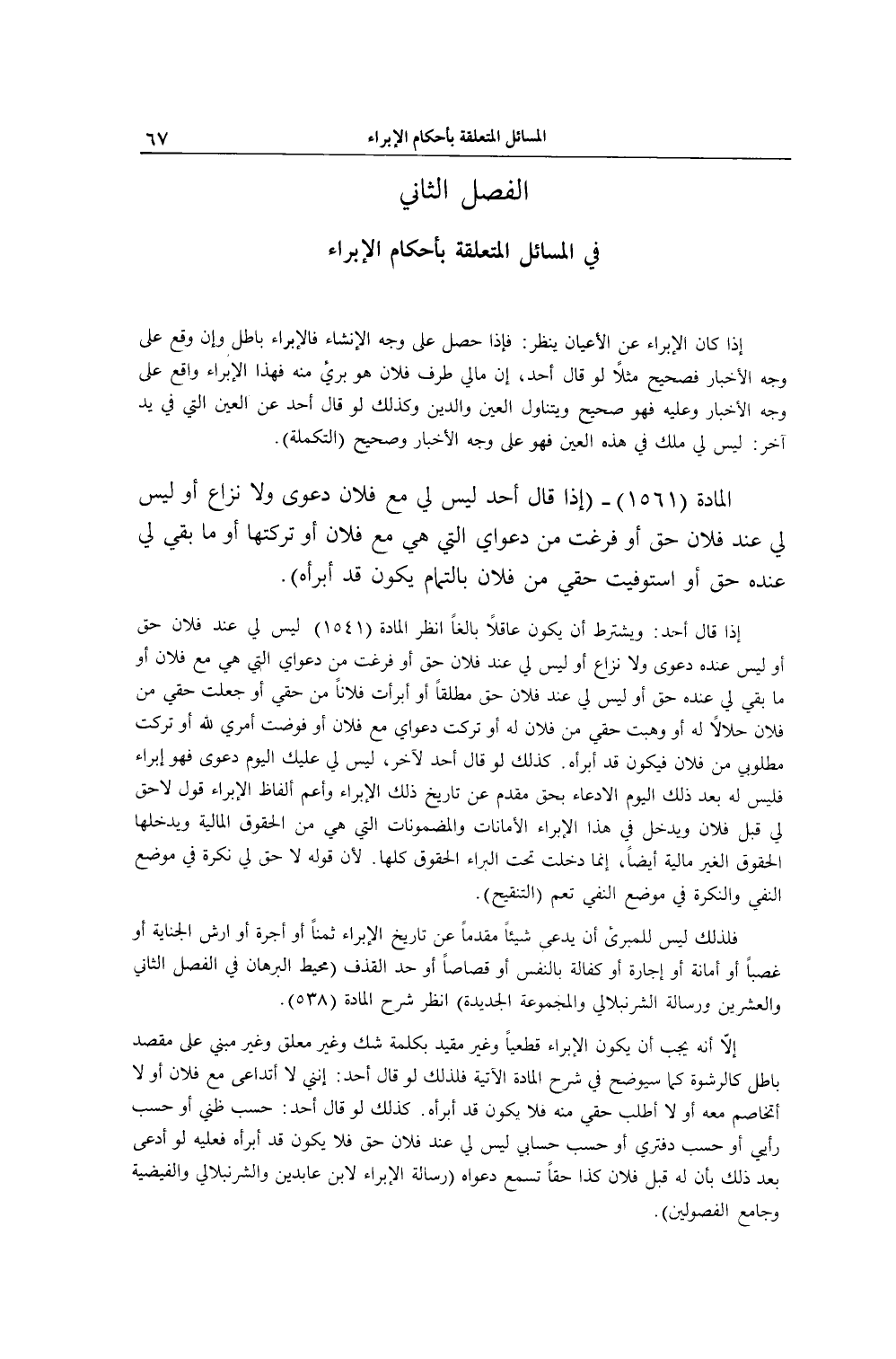 كَذَلِكَ لَوْ قَالَ أَحَدٌ لِآخَرَ، لَيْسَ لِي عَلَيْك الْيَوْمَ دَعْوَى فَهُوَ إبْرَاءٌ فَلَيْسَ لَهُ بَعْدَ ذَلِكَ الْيَوْمِ الِادِّعَاءُ بِحَقٍّ مُقَدَّمٍ عَنْ تَارِيخِ ذَلِكَ الْإِبْرَاءِ، وَأَعَمُّ أَلْفَاظِ الْإِبْرَاءِ قَوْلُ: لَا حَقَّ لِي قِبَلَ فُلَانٍ، وَيَدْخُلُ فِي هَذَا الْإِبْرَاءِ الْأَمَانَاتُ وَالْمَضْمُونَاتُ الَّتِي هِيَ مِنْ الْحُقُوقِ الْمَالِيَّةِ وَيَدْخُلُهَا الْحُقُوقُ الْغَيْرُ مَالِيَّةِ أَيْضًا، إنَّمَا دَخَلَتْ تَحْتَ الْبَرَاءَةِ الْحُقُوقُ كُلُّهَا؛ لِأَنَّ قَوْلَهُ: لَا حَقَّ لِي نَكِرَةٌ فِي مَوْضِعِ النَّفْيِ، وَالنَّكِرَةُ فِي مَوْضِعِ النَّفْيِ تَعُمُّ (التَّنْقِيحُ) .