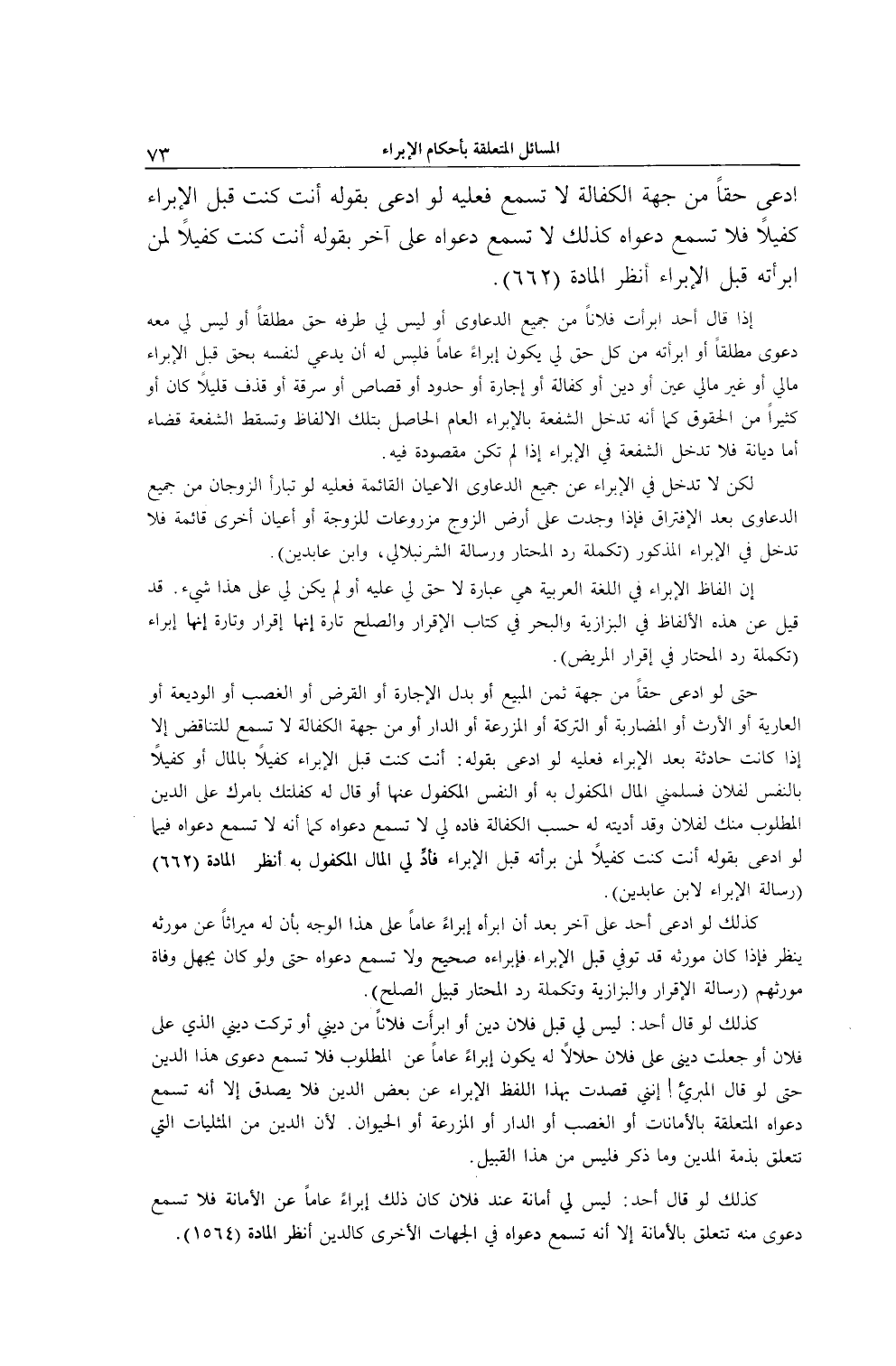ادَّعَى حَقًّا مِنْ جِهَةِ. الْكَفَالَةِ لَا تُسْمَعُ فَعَلَيْهِ لَوْ ادَّعَى بِقَوْلِهِ: أَنْتَ كُنْتَ قَبْلَ الْإِبْرَاءِ كَفِيلًا فَلَا تُسْمَعُ دَعْوَاهُ كَذَلِكَ لَا تُسْمَعُ دَعْوَاهُ عَلَى آخَرَ بِقَوْلِهِ: أَنْتَ كُنْتُ كَفِيلًا لِمَنْ أَبْرَأْتَهُ قَبْلَ الْإِبْرَاءِ اُنْظُرْ الْمَادَّةَ 662) .