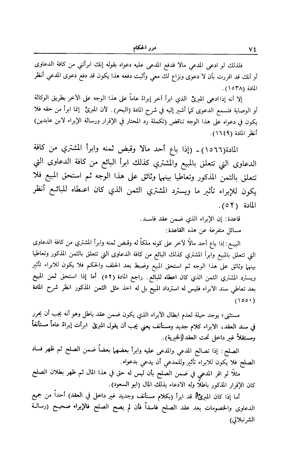 رَاجِعْ الْمَادَّةَ (52) أَمَّا إذَا اُسْتُحِقَّ ثَمَنُ الْمَبِيعِ بَعْدَ تَعَاطِي سَنَدِ الْإِبْرَاءِ فَلَيْسَ لَهُ اسْتِرْدَادُ الْمَبِيعِ بَلْ لَهُ أَخْذُ مِثْلِ الثَّمَنِ الْمَذْكُورِ اُنْظُرْ شَرْحَ الْمَادَّةِ (1550) مُسْتَثْنًى؛ يُوجَدُ حِيلَةٌ لِعَدَمِ إبْطَالِ الْإِبْرَاءِ الَّذِي يَكُونُ ضِمْنَ عَقْدٍ بَاطِلٍ، وَهُوَ أَنَّهُ يَجِبُ أَنْ يُحَرَّرَ فِي سَنَدِ الْعَقْدِ، الْإِبْرَاءُ كَلَامٌ جَدِيدٌ وَمُسْتَأْنَفٌ يَعْنِي يَجِبُ أَنْ يَقُولَ الْمُبْرِئُ أَبْرَأْتُ إبْرَاءً عَامًّا مُسْتَأْنَفًا وَمُسْتَقِلًّا غَيْرَ دَاخِلٍ تَحْتَ الْعَقْدِ (الْخَيْرِيَّةُ) .