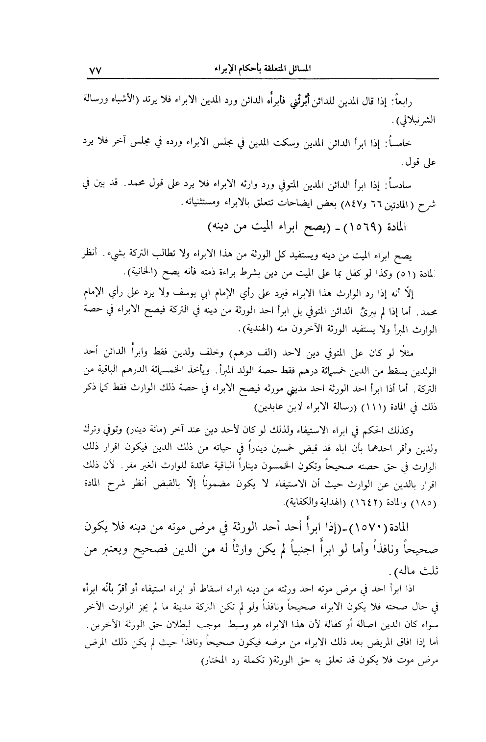 إذَا أَبْرَأَ أَحَدٌ فِي مَرَضِ مَوْتِهِ أَحَدَ وَرَثَتِهِ مِنْ دَيْنِهِ إبْرَاءَ إسْقَاطٍ أَوْ إبْرَاءَ اسْتِيفَاءٍ، أَوْ أَقَرَّ بِأَنَّهُ أَبْرَأهُ فِي حَالٍ صِحَّتِهِ فَلَا يَكُونُ الْإِبْرَاءُ صَحِيحًا وَنَافِذًا، وَلَوْ لَمْ تَكُنْ التَّرِكَةُ مَدِينَةً مَا لَمْ يُجِزْ الْوَارِثُ الْآخَرُ سَوَاءٌ كَانَ الدَّيْنُ أَصَالَةً، أَوْ كَفَالَةً لِأَنَّ هَذَا الْإِبْرَاءَ هُوَ وَسِيطٌ مُوجِبٌ لِبُطْلَانِ حَقِّ الْوَرَثَةِ الْآخَرِينَ.