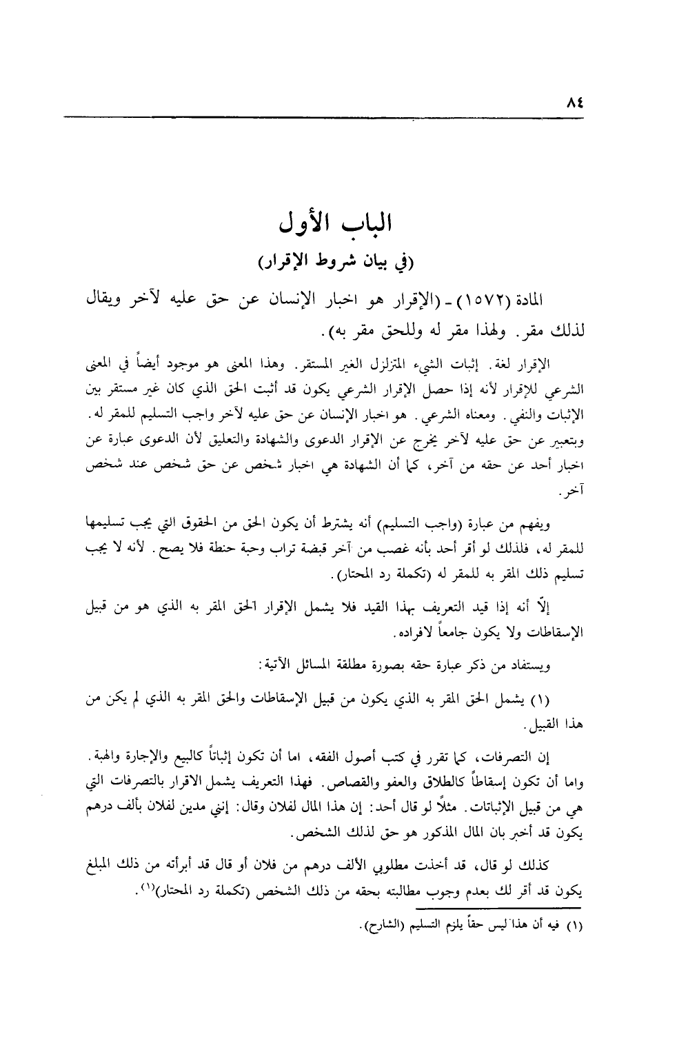 [الْبَابُ الْأَوَّلُ فِي بَيَانِ شُرُوطِ الْإِقْرَارِ] [ (الْمَادَّةُ 1572) الْإِقْرَارُ هُوَ إخْبَارُ الْإِنْسَانِ عَنْ حَقٍّ عَلَيْهِ لِآخَرَ]