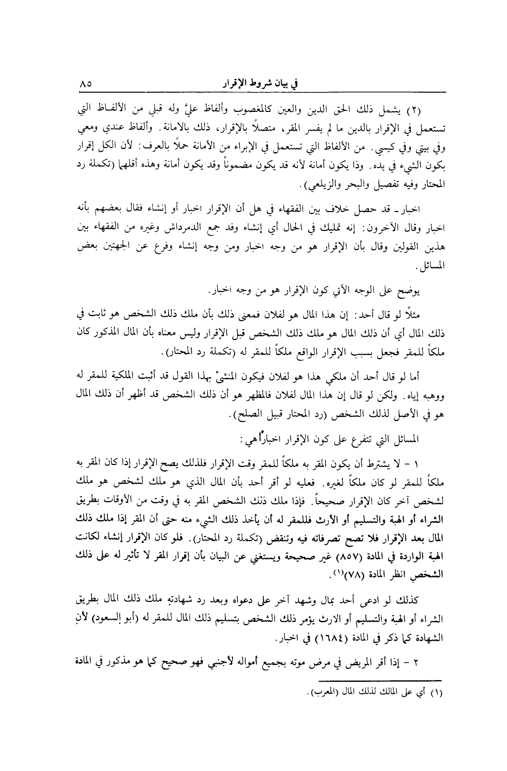 مَثَلًا لَوْ قَالَ أَحَدٌ: إنَّ هَذَا الْمَالَ هُوَ لِفُلَانٍ، فَمَعْنَى ذَلِكَ بِأَنَّ مِلْكَ ذَلِكَ الشَّخْصِ هُوَ ثَابِتٌ فِي ذَلِكَ الْمَالِ أَيْ أَنَّ ذَلِكَ الْمَالَ هُوَ مِلْكُ ذَلِكَ الشَّخْصِ قَبْلَ الْإِقْرَارِ، وَلَيْسَ مَعْنَاهُ بِأَنَّ الْمَالَ الْمَذْكُورَ كَانَ مِلْكًا لِلْمُقِرِّ فَجُعِلَ بِسَبَبِ الْإِقْرَارِ الْوَاقِعِ مِلْكًا لِلْمُقَرِّ لَهُ (تَكْمِلَةُ رَدِّ الْمُحْتَارِ) .