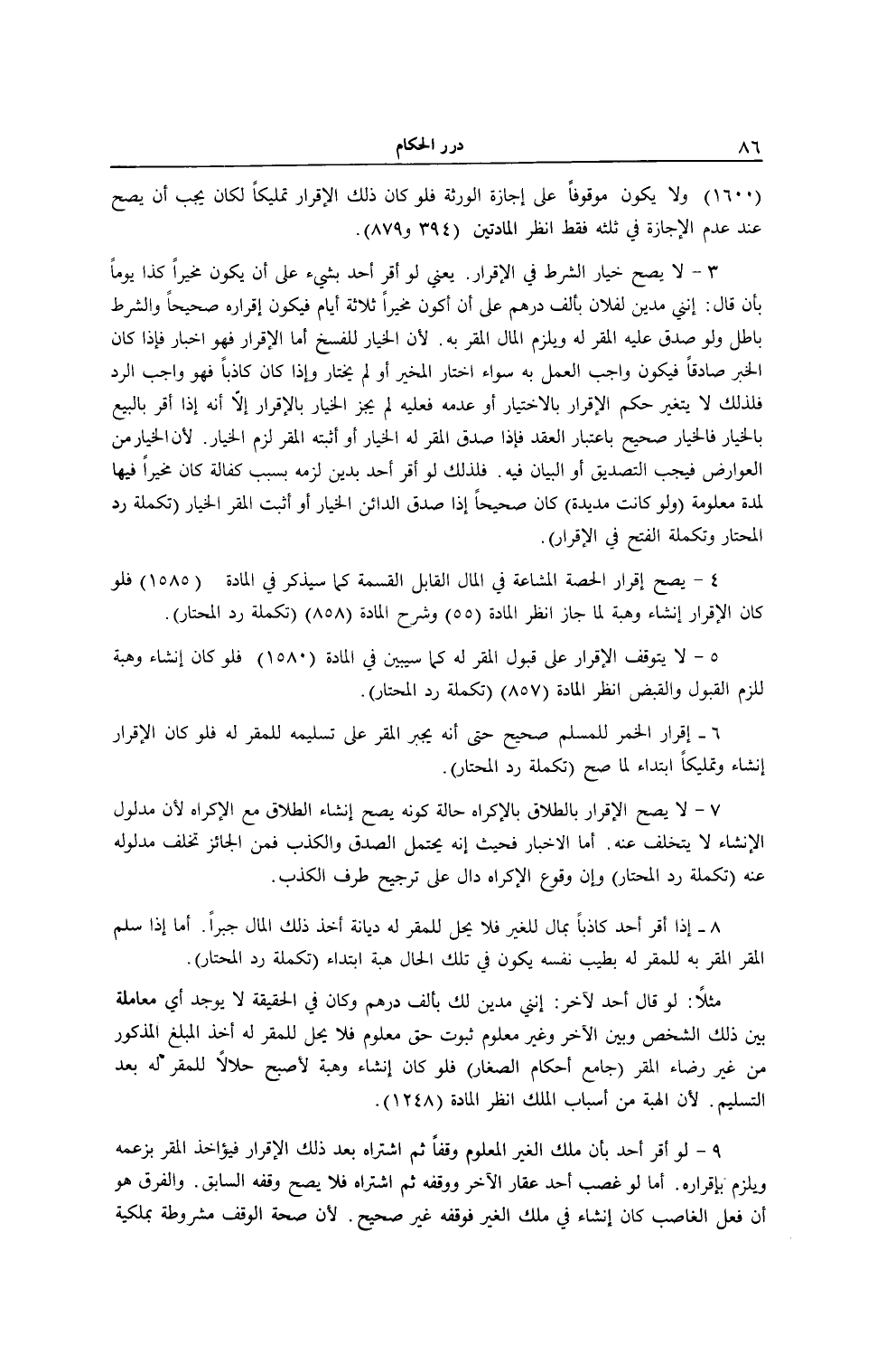 4 - يَصِحُّ إقْرَارُ الْحِصَّةِ الْمُشَاعَةِ فِي الْمَالِ الْقَابِلِ الْقِسْمَةَ كَمَا سَيُذْكَرُ فِي الْمَادَّةِ (1585) فَلَوْ كَانَ الْإِقْرَارُ إنْشَاءً وَهِبَةً لَمَا جَازَ اُنْظُرْ الْمَادَّةَ (55) وَشَرْحَ الْمَادَّةِ (858) (تَكْمِلَةُ رَدِّ الْمُحْتَارِ) .