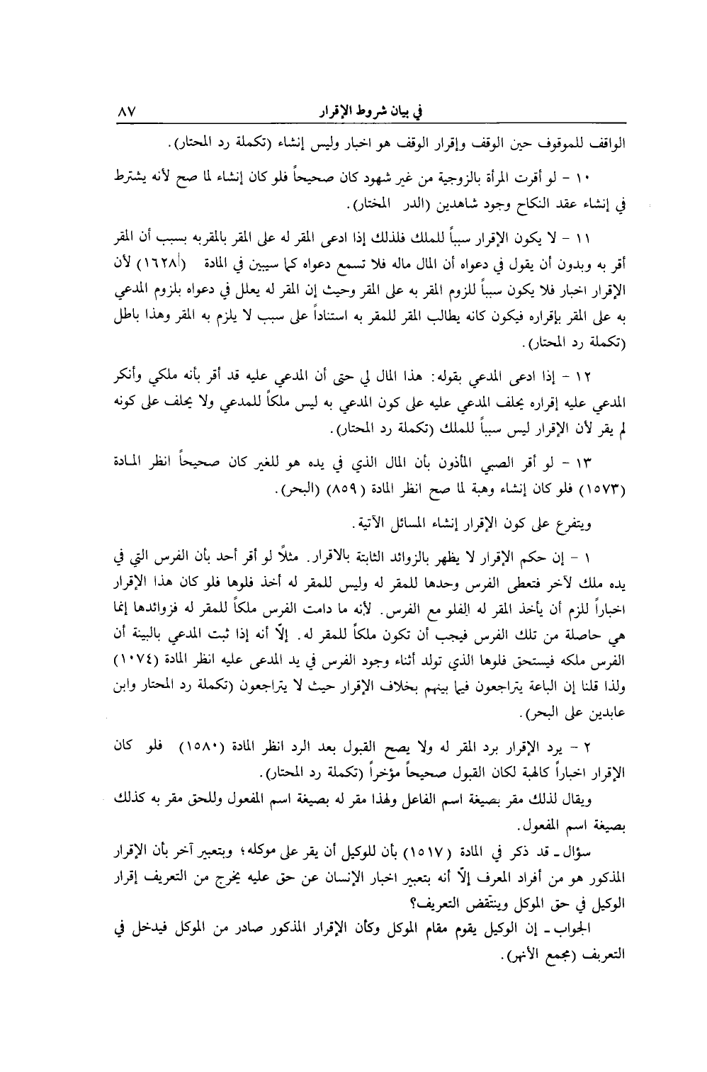 سُؤَالٌ - قَدْ ذُكِرَ فِي الْمَادَّةِ (1517) بِأَنَّ لِلْوَكِيلِ أَنْ يُقِرَّ عَلَى مُوَكِّلِهِ؛ وَبِتَعْبِيرٍ آخَرَ بِأَنَّ الْإِقْرَارَ الْمَذْكُورَ هُوَ مِنْ أَفْرَادِ الْمُعَرَّفِ إلَّا أَنَّهُ بِتَعْبِيرِ إخْبَارِ الْإِنْسَانِ عَنْ حَقٍّ عَلَيْهِ يَخْرُجُ مِنْ التَّعْرِيفِ إقْرَارُ الْوَكِيلِ فِي حَقِّ الْمُوَكِّلِ وَيُنْتَقَضُ التَّعْرِيفُ؟ الْجَوَابُ أَنَّ الْوَكِيلَ يَقُومُ مَقَامَ الْمُوَكِّلِ وَكَأَنَّ الْإِقْرَارَ الْمَذْكُورَ صَادِرٌ مِنْ الْمُوَكِّلِ فَيَدْخُلُ فِي التَّعْرِيفِ (مَجْمَعُ الْأَنْهُرِ) .