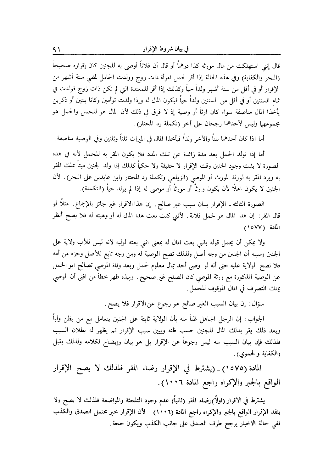سُؤَالٌ: إنَّ بَيَانَ السَّبَبِ غَيْرِ الصَّالِحِ هُوَ رُجُوعٌ عَنْ الْإِقْرَارِ فَلَا يَصِحُّ؟ الْجَوَابُ: أَنَّ الرَّجُلَ الْجَاهِلَ ظَنًّا مِنْهُ بِأَنَّ الْوِلَايَةَ ثَابِتَةٌ عَلَى الْجَنِينِ يَتَعَامَلُ مَعَ مَنْ يَظُنُّ وَلِيًّا، وَبَعْدَ ذَلِكَ يُقِرُّ بِذَلِكَ الْمَالِ لِلْجَنِينِ حَسَبَ ظَنِّهِ، وَيُبَيِّنُ سَبَبَ الْإِقْرَارِ ثُمَّ يَظْهَرُ لَهُ بُطْلَانُ السَّبَبِ فَلِذَلِكَ فَإِنَّ بَيَانَ السَّبَبِ مِنْهُ لَيْسَ رُجُوعًا عَنْ الْإِقْرَارِ بَلْ هُوَ بَيَانٌ وَإِيضَاحٌ لِكَلَامِهِ وَلِذَلِكَ يُقْبَلُ (الْكِفَايَةُ وَالْحَمَوِيُّ) .