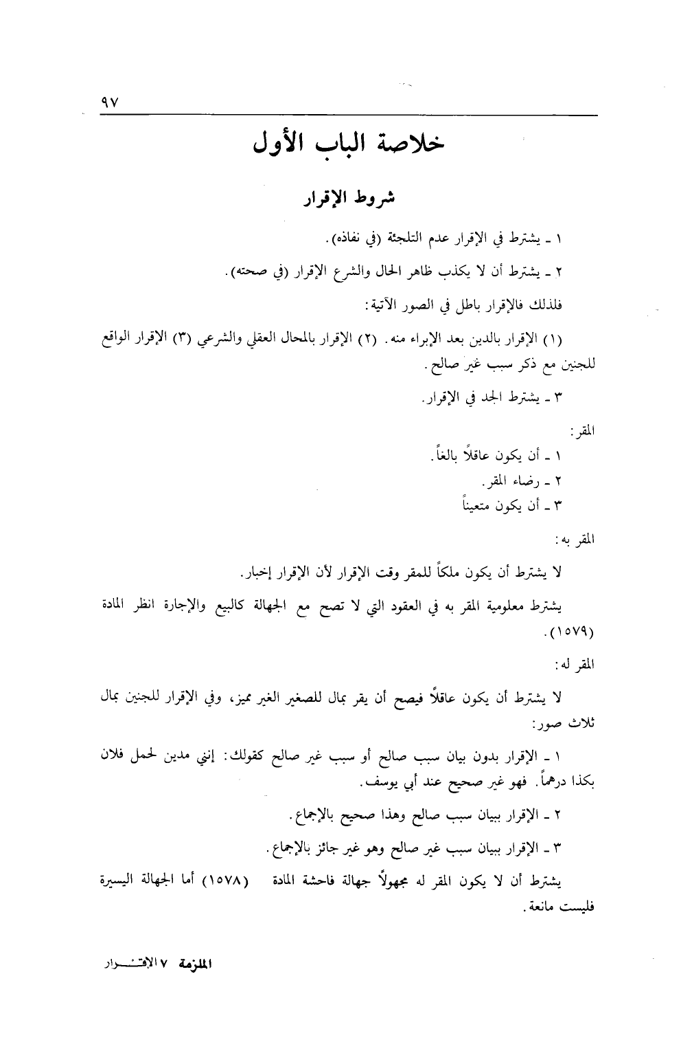 [خُلَاصَةُ الْبَابِ الْأَوَّلِ فِي شُرُوطُ الْإِقْرَارِ]
