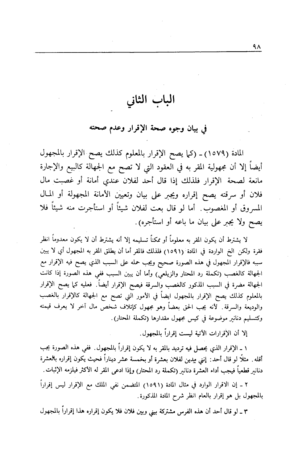 2 - إنَّ الْإِقْرَارَ الْوَارِدَ فِي مِثَالِ الْمَادَّةِ (1591) الْمُتَضَمِّنَ نَفْيَ الْمِلْكِ مَعَ الْإِقْرَارِ لَيْسَ إقْرَارًا بِالْمَجْهُولِ بَلْ هُوَ إقْرَارٌ بِالْعَامِّ اُنْظُرْ شَرْحَ الْمَادَّةِ الْمَذْكُورَةِ.