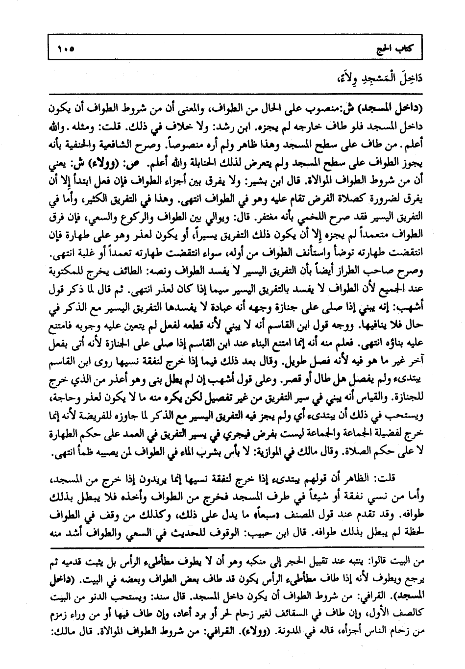 داخل المسجد ش: منصوب على الحال من الطواف والمعنى أن من شروط الطواف أن يكون داخل المسجد فلو طاف خارجه لم يجزه.. ابن رشد ولا خلاف في ذلك. قلت: ومثله والله أعلم من طاف على سطح المسجد وهذا ظاهر ولم أره منصوصا. وصرح الشافعية والحنفية بأنه يجوز الطواف على سطح المسجد ولم يتعرض لذلك الحنابلة والله أعلم. ص: "وولاء" ش: يعني أن من شروط الطواف الموالاة. قال ابن بشير ولا يفرق بين أجزاء الطواف فإن فعل ابتدأ إلا أن يفرق لضرورة كصلاة الفرض تقام عليه وهو في الطواف انتهى. وهذا في التفريق الكثير وأما في التفريق اليسير فقد صرح اللخمي بأنه مغتفر. قال ويوالي بين الطواف والركوع والسعي فإن فرق الطواف متعمدا لم يجزه إلا أن يكون ذلك التفريق يسيرا أو يكون لعذر وهو على طهارة فإن انتقضت طهارته توضأ واستأنف الطواف من أوله سواء انتقضت طهارته تعمدا أو غلبة انتهى. وصرح صاحب الطراز أيضا بأن التفريق اليسير لا يفسد الطواف ونصه الطائف يخرج للمكتوبة عند الجميع لأن الطواف لا يفسد بالتفريق اليسير سيما إذا كان لعذر انتهى. ثم قال لما ذكر قول أشهب إنه يبني إذا صلى على جنازة وجهه أنه عبادة لا يفسدها التفريق اليسير مع الذكر في حال فلا ينافيها. ووجه قول ابن القاسم أنه لا يبني لأنه قطعه لفعل لم يتعين عليه وجوبه فامتنع عليه بناؤه انتهى. فعلم منه أنه إنما امتنع البناء عند ابن القاسم إذا صلى على الجنازة لأنه أتى بفعل آخر غير ما هو فيه لأنه فصل طويل وقال بعد ذلك فيما إذا خرج لنفقة نسيها روى ابن القاسم يبتدئ ولم يفصل هل طال أو قصر. وعلى قول أشهب إن لم يطل بنى وهو أعذر من الذي خرج للجنازة. والقياس أنه يبني في سير التفريق من غير تفصيل لكن يكره منه ما لا يكون لعذر وحاجة ويستحب في ذلك أن يبتدئ أي ولم يجز فيه التفريق اليسير مع الذكر لما جاوزه للفريضة لأنه إنما خرج لفضيلة الجماعة والجماعة ليست بفرض فيجري في يسير التفريق في العمد على حكم الطهارة لا على حكم الصلاة. وقال مالك في الموازية لا بأس بشرب الماء في الطواف لمن يصيبه ظمأ انتهى.