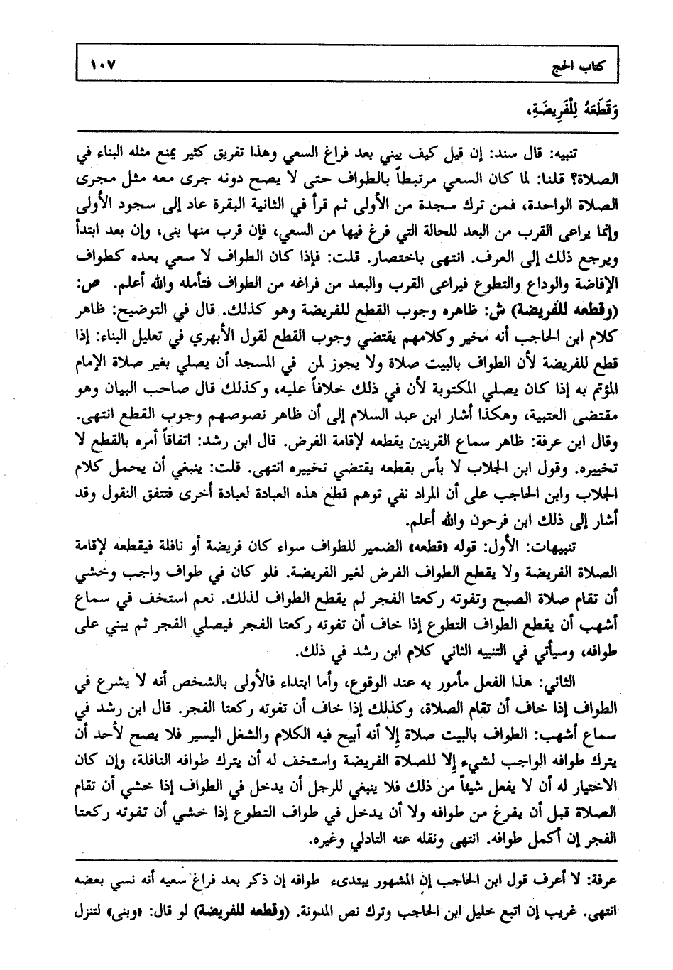 تنبيهات: الأول: قوله "قطعه" الضمير للطواف سواء كان فريضة أو نافلة فيقطعه لإقامة الصلاة الفريضة ولا يقطع الطواف الفرض لغير الفريضة. فلو كان في طواف واجب وخشي أن تقام صلاة الصبح وتفوته ركعتا الفجر لم يقطع الطواف لذلك. نعم استخف في سماع أشهب أن يقطع الطواف التطوع إذا خاف أن تفوته ركعتا الفجر فيصلي الفجر ثم يبني على طوافه وسيأتي في التنبيه الثاني كلام ابن رشد في ذلك. الثاني: هذا الفعل مأمور به عند الوقوع وأما ابتداء فالأولى بالشخص أنه لا يشرع في الطواف إذا خاف أن تقام الصلاة وكذلك إذا خاف أن تفوته ركعتا الفجر. قال ابن رشد في سماع أشهب الطواف بالبيت صلاة إلا أنه أبيح فيه الكلام والشغل اليسير فلا يصح لأحد أن يترك طوافه الواجب لشيء إلا للصلاة الفريضة واستخف له أن يترك طوافه النافلة وإن كان الاختيار له أن لا يفعل شيئا من ذلك فلا ينبغي للرجل أن يدخل في الطواف إذا خشي أن تقام الصلاة قبل أن يخلو من طوافه ولا أن يدخل في طواف التطوع إذا خشي أن تفوته ركعتا الفجر إن أكمل طوافه. انتهى ونقله عنه التادلي وغيره.